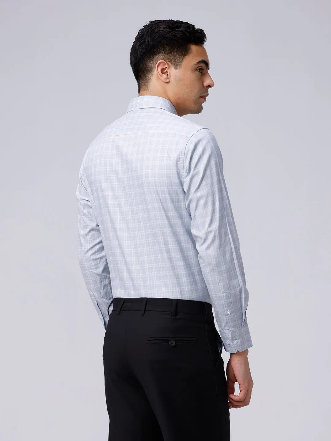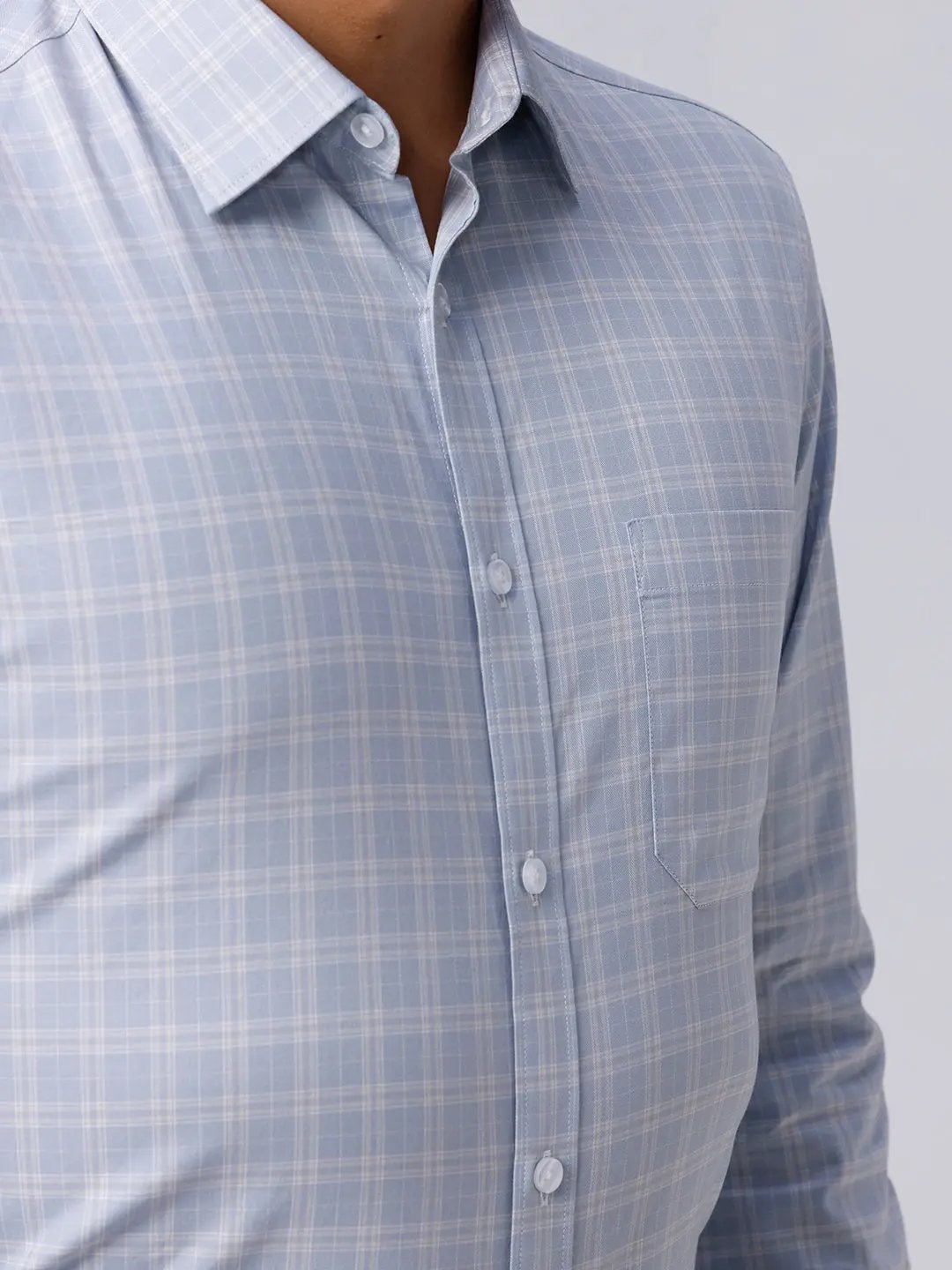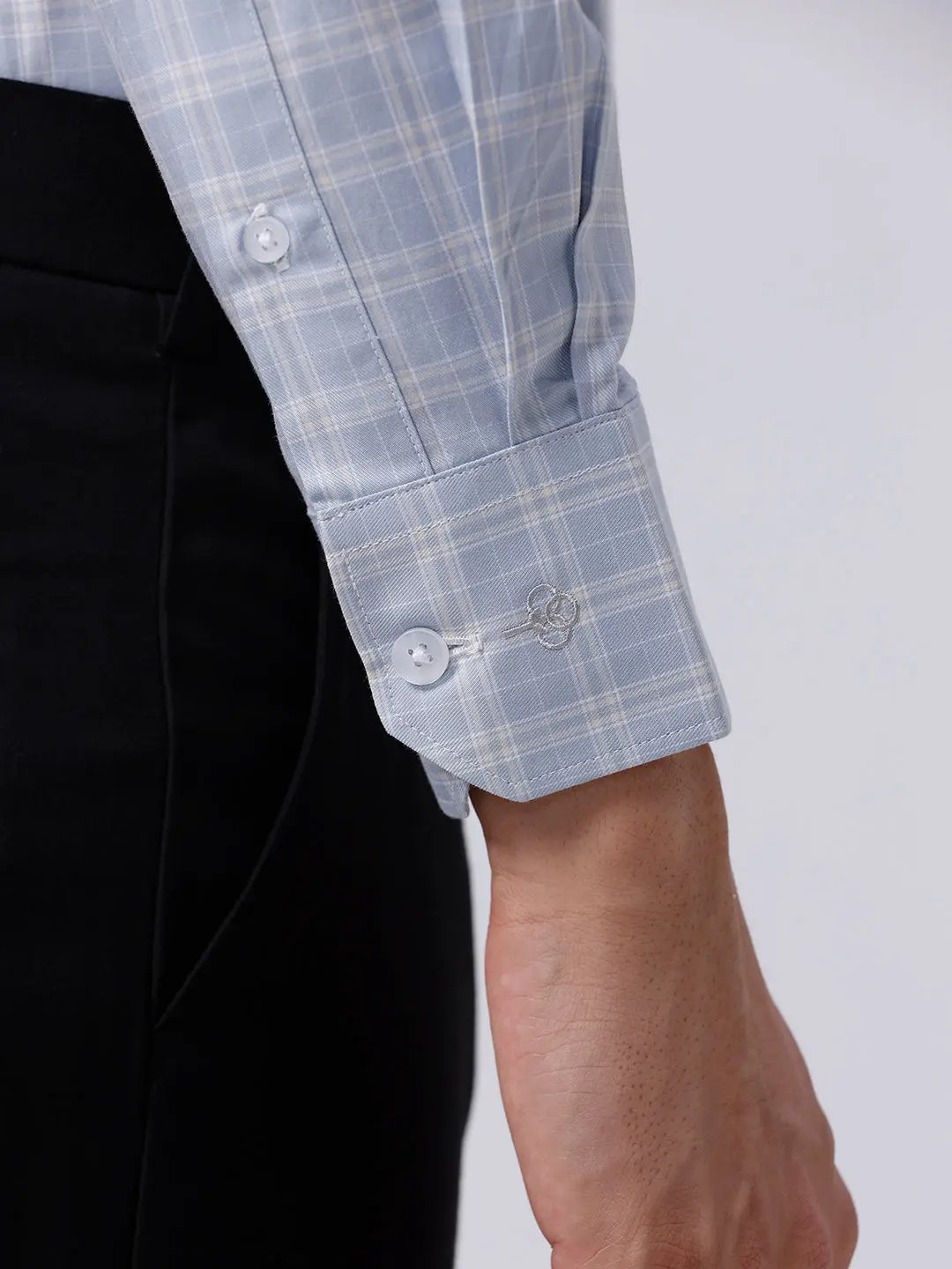 Versatile shirt with blue and grey checks in a mix of poplin and dobby fabric, suitable for casual and office wear.