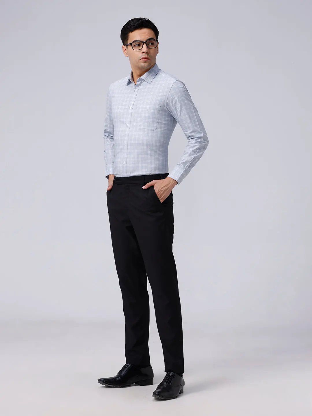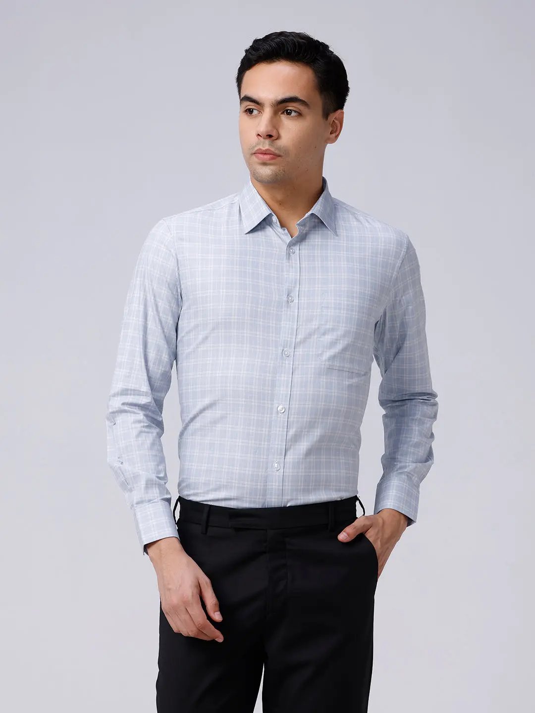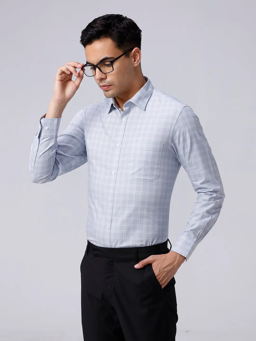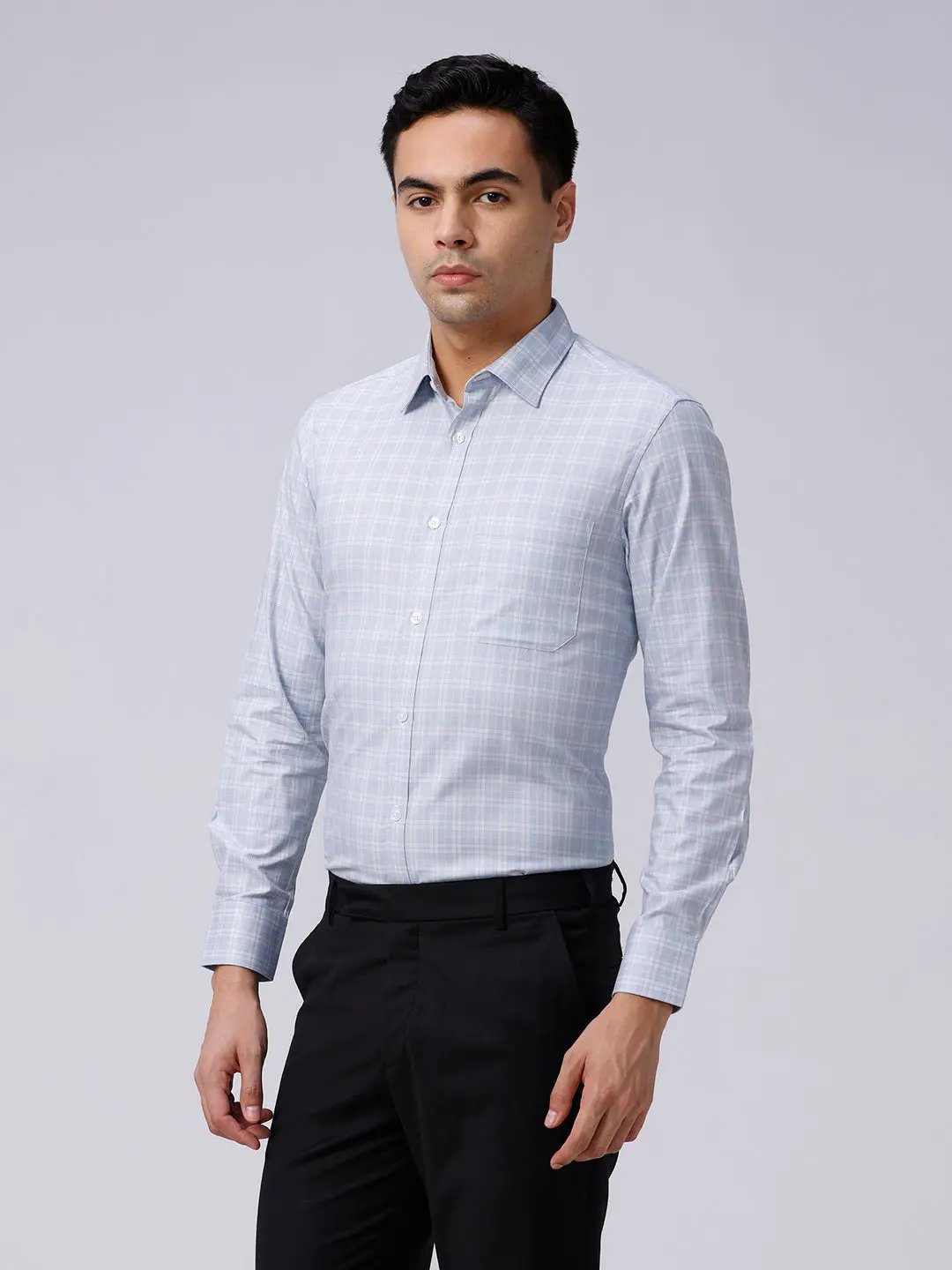 Versatile shirt with blue and grey checks in a mix of poplin and dobby fabric, suitable for casual and office wear.