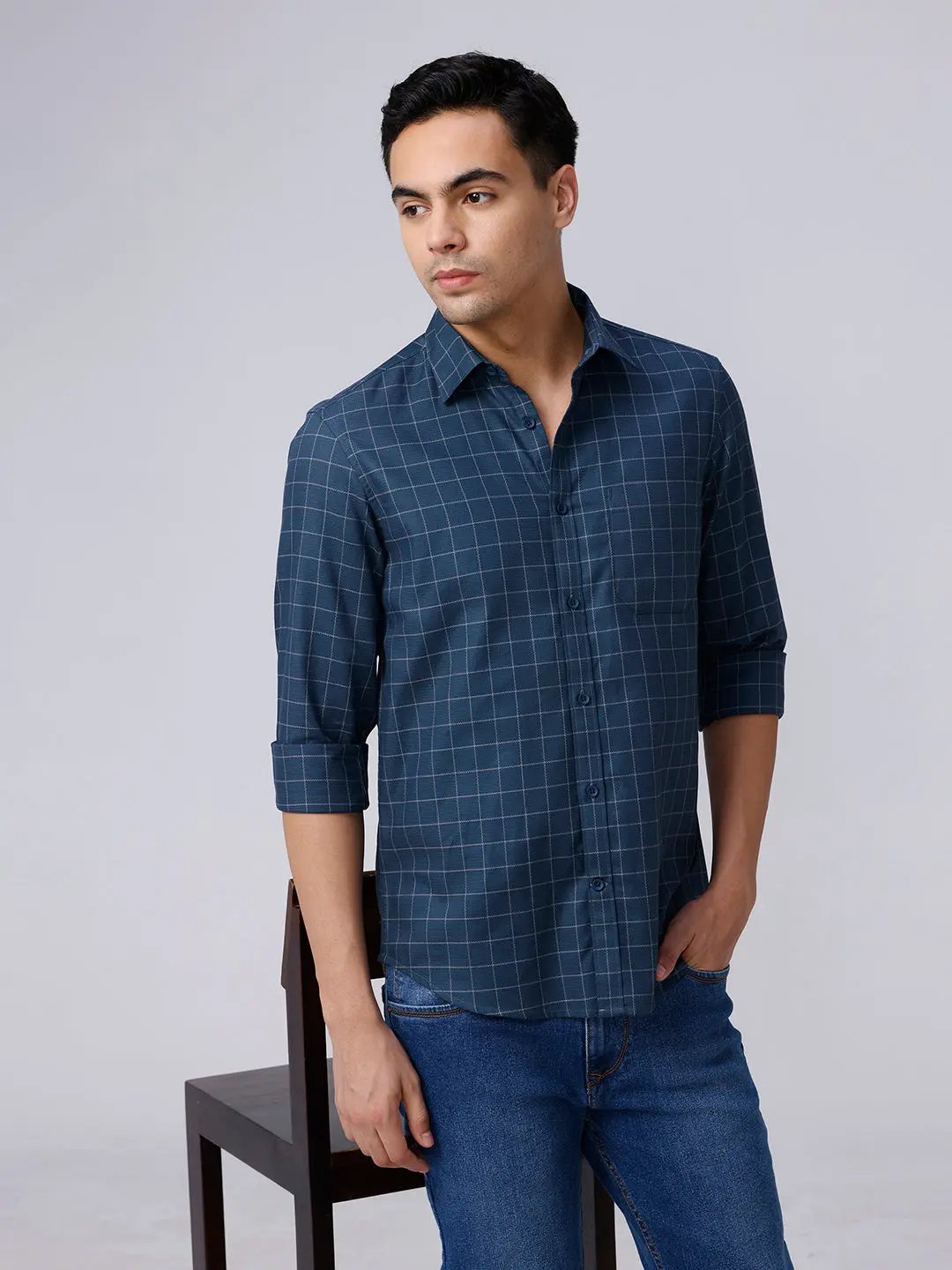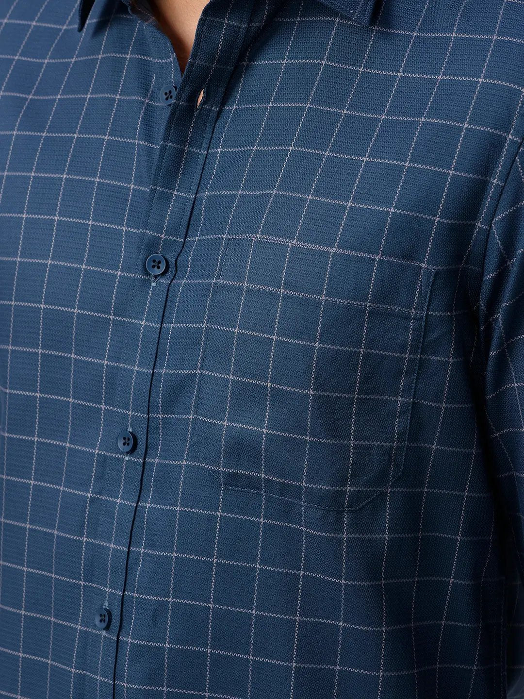 Stylish blue checks on dobby fabric, perfect for casual outings.