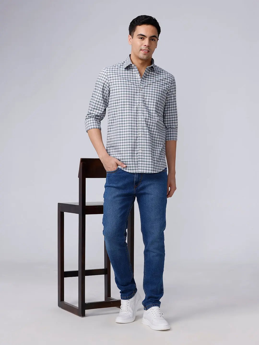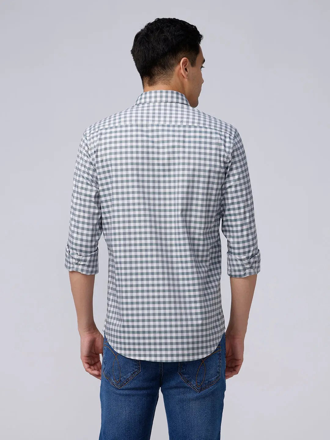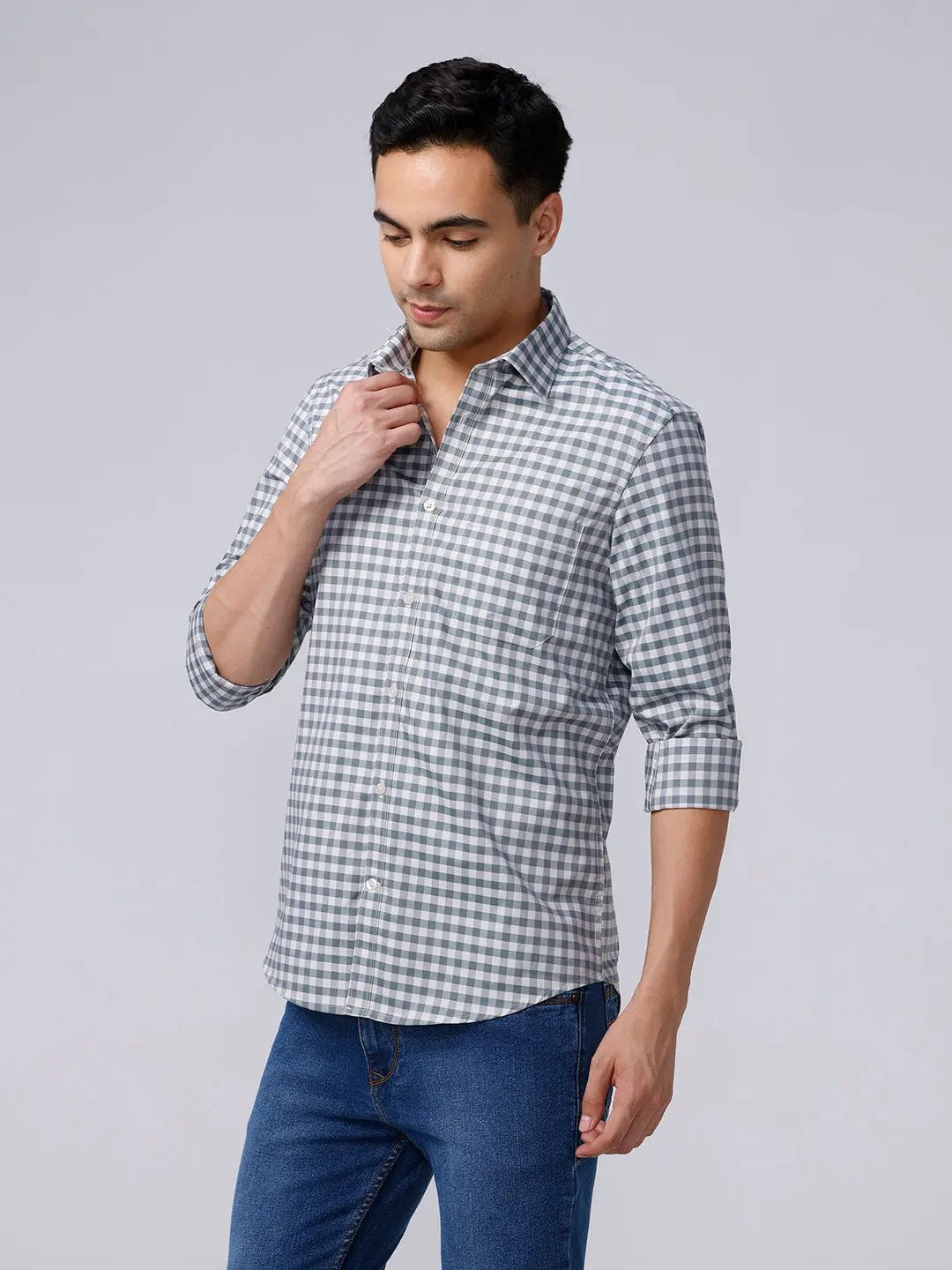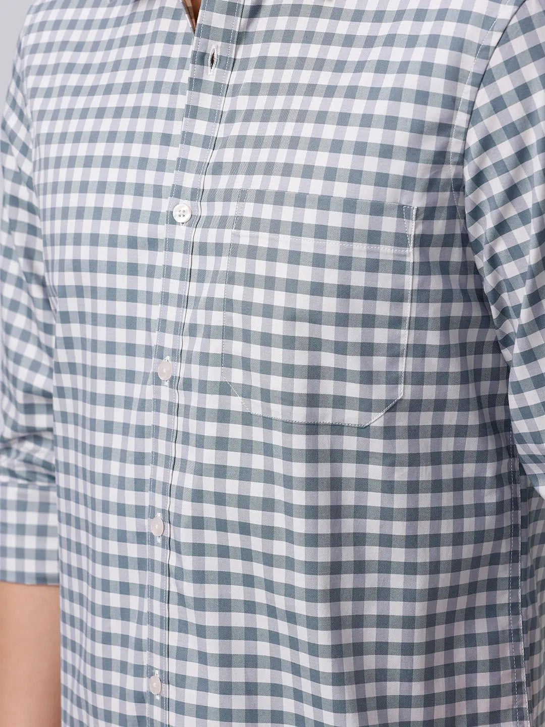 Checks in green and beige on dobby fabric, stylish and versatile for casual or smart-casual wear.
