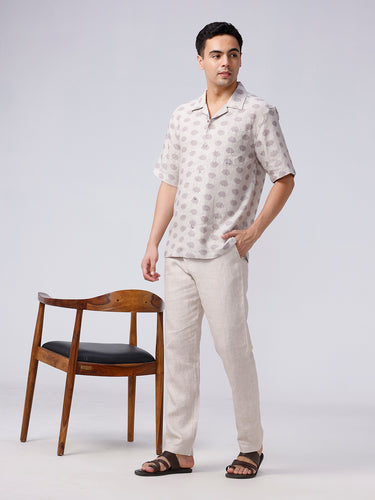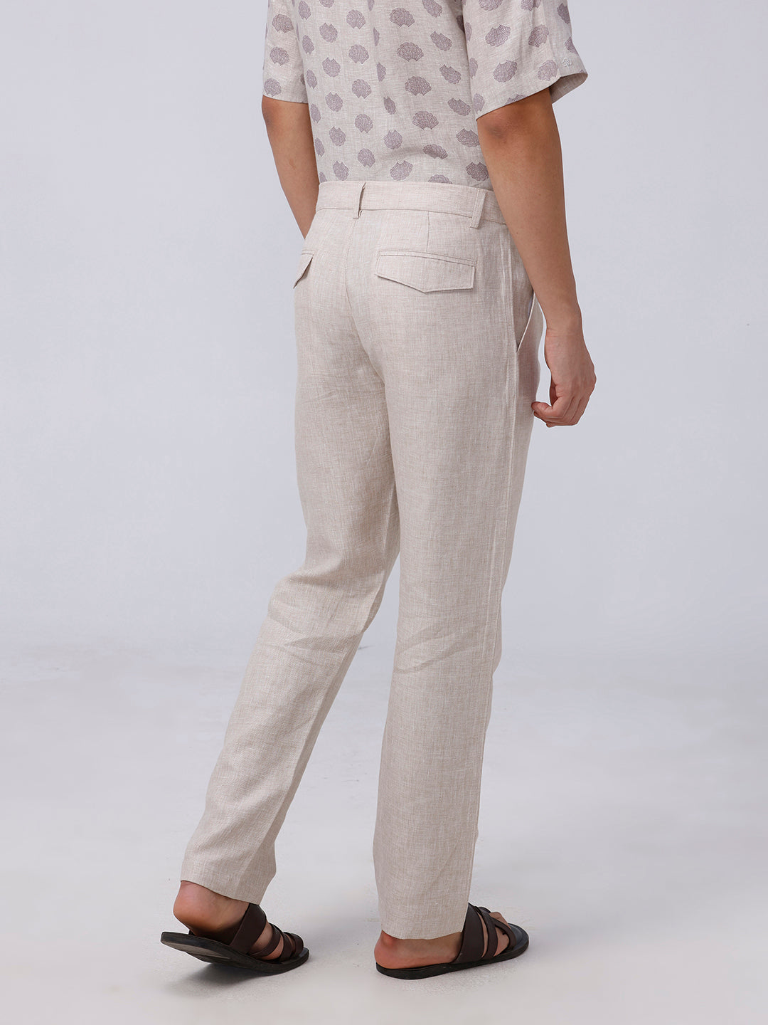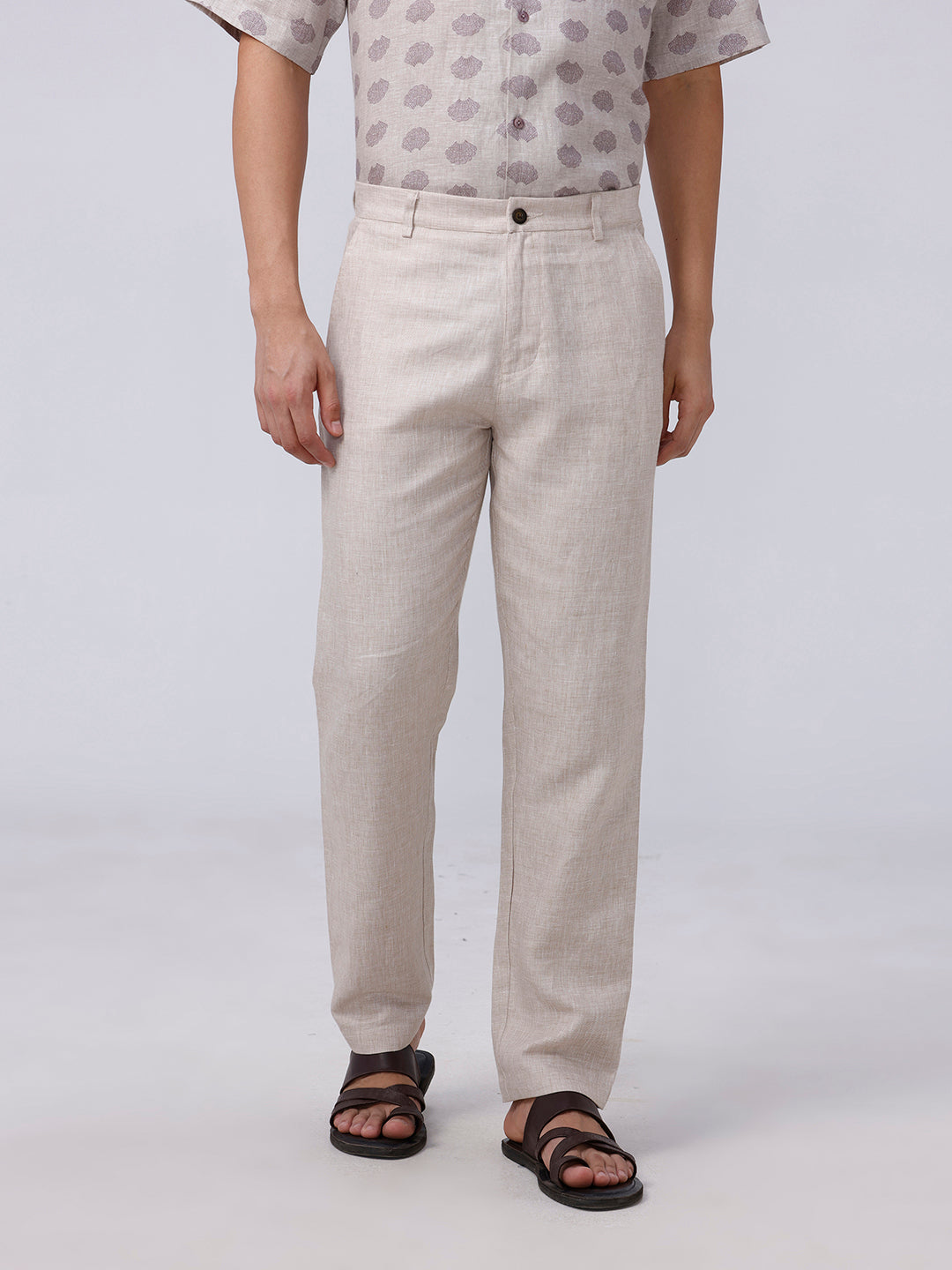 A comfortable casual beige linen trouser featuring a relaxed fit, breathable linen fabric, and a laid-back style perfect for warm weather outings.