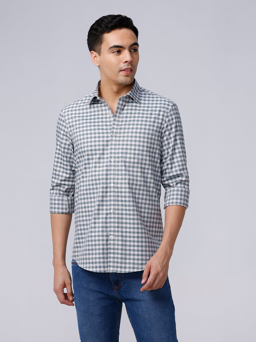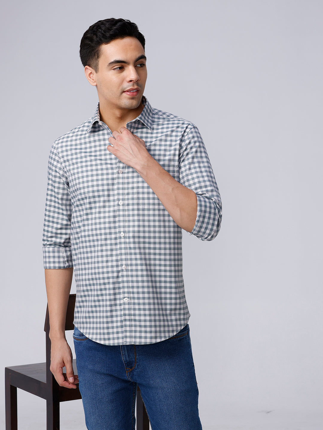 Checks in green and beige on dobby fabric, stylish and versatile for casual or smart-casual wear.