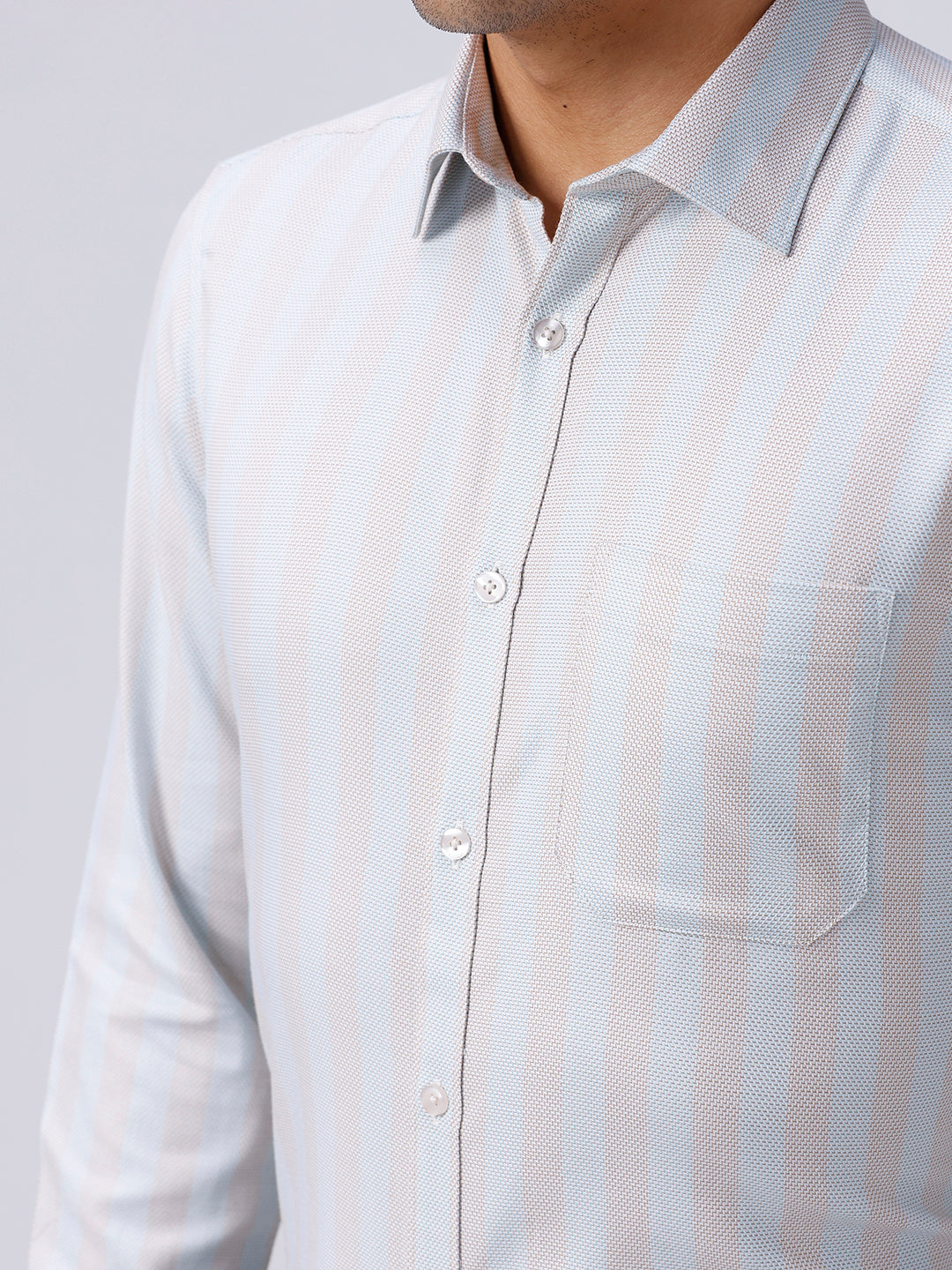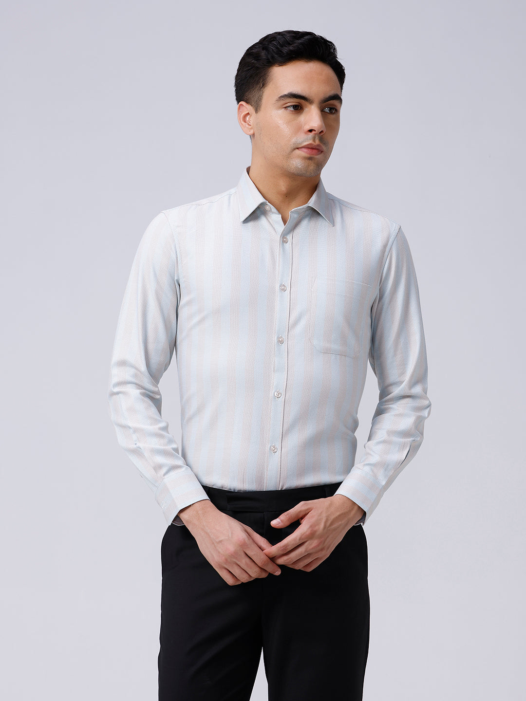 Dobby fabric shirt with subtle green and grey stripes, perfect for casual or office wear.