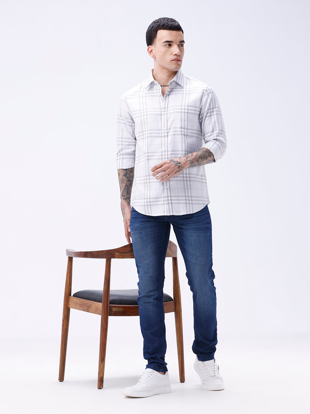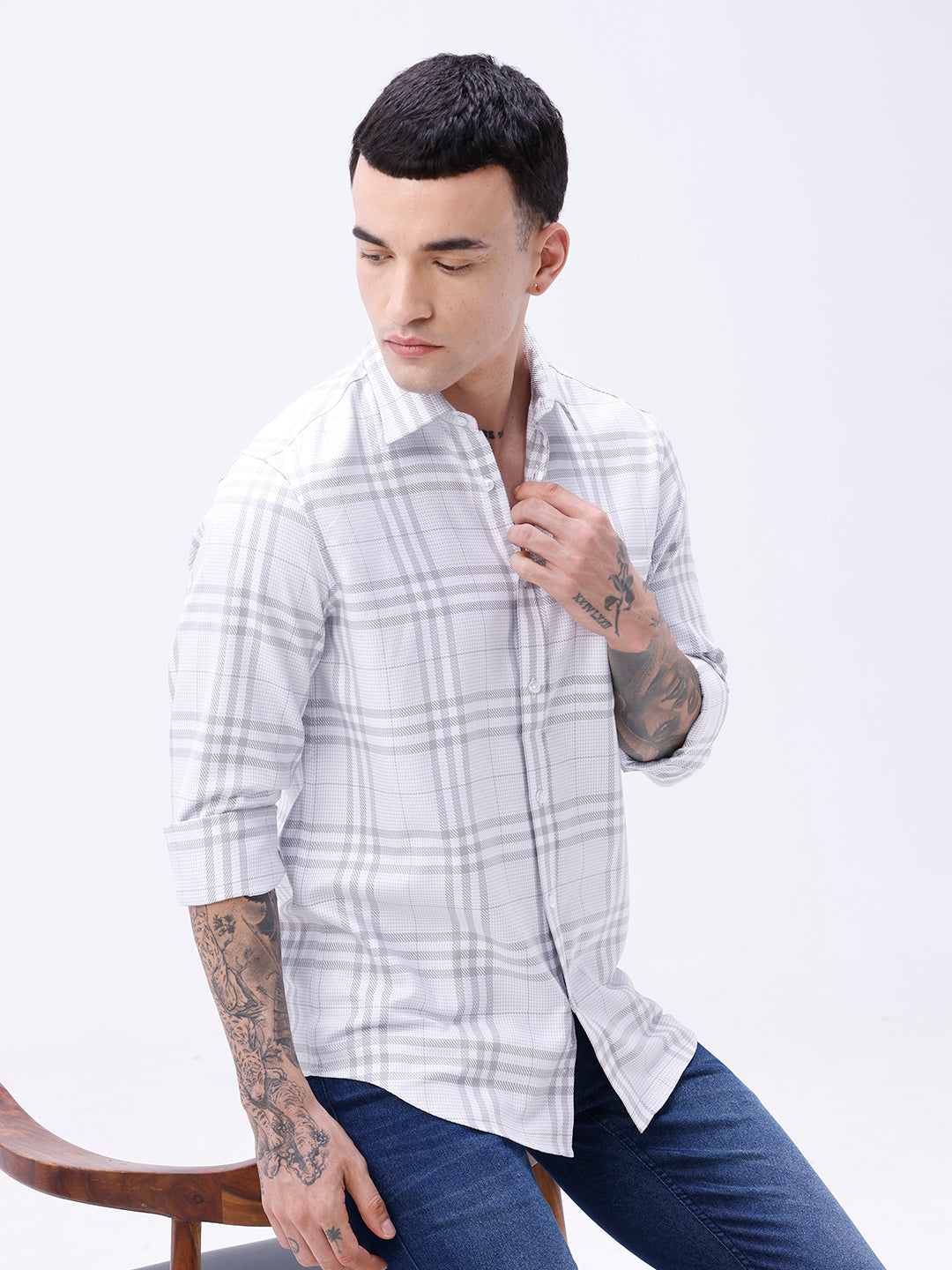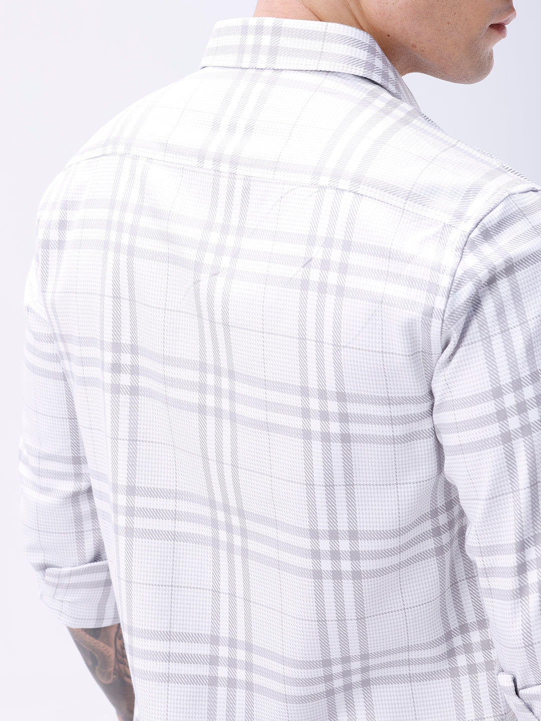 Elegant light grey checks on sturdy twill fabric, versatile for various occasions.