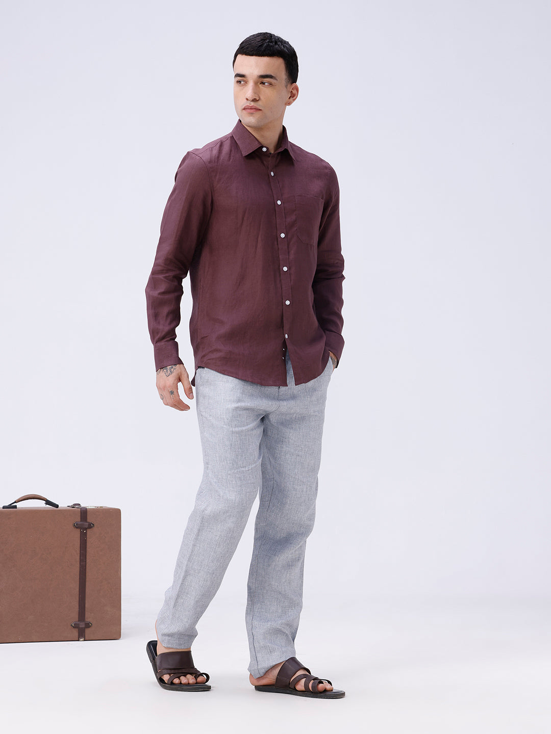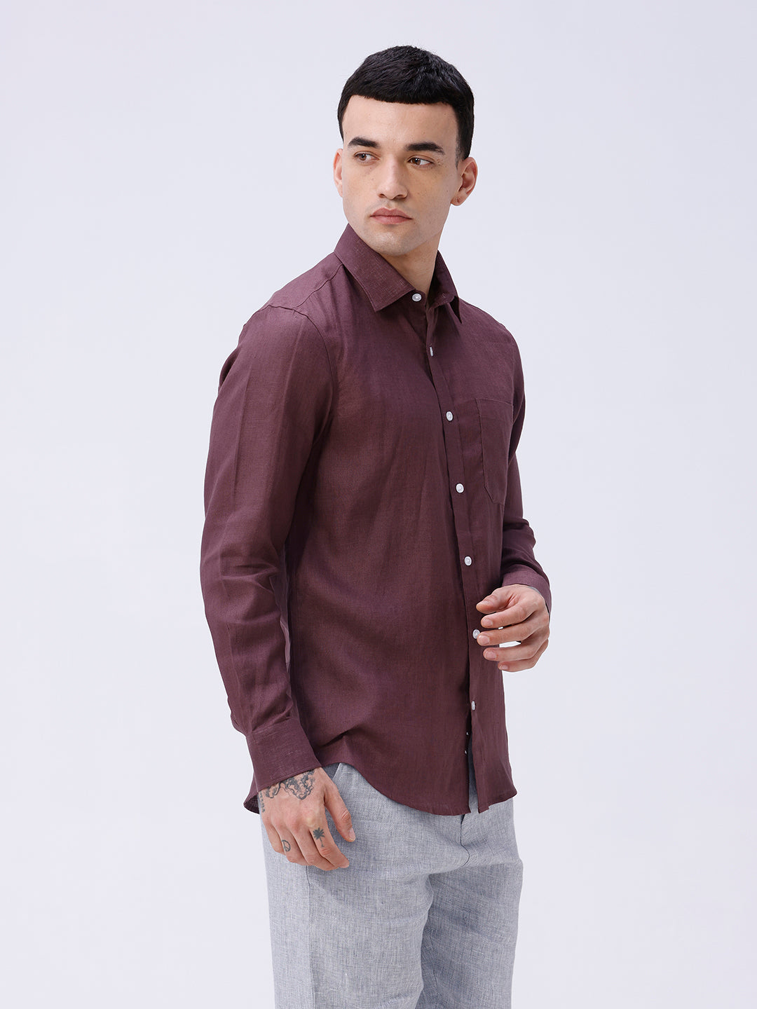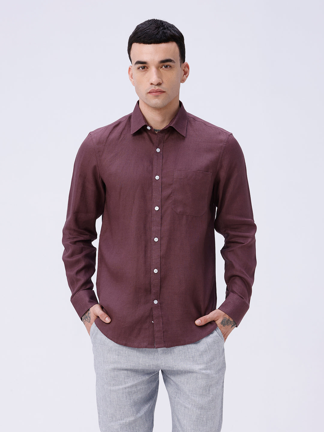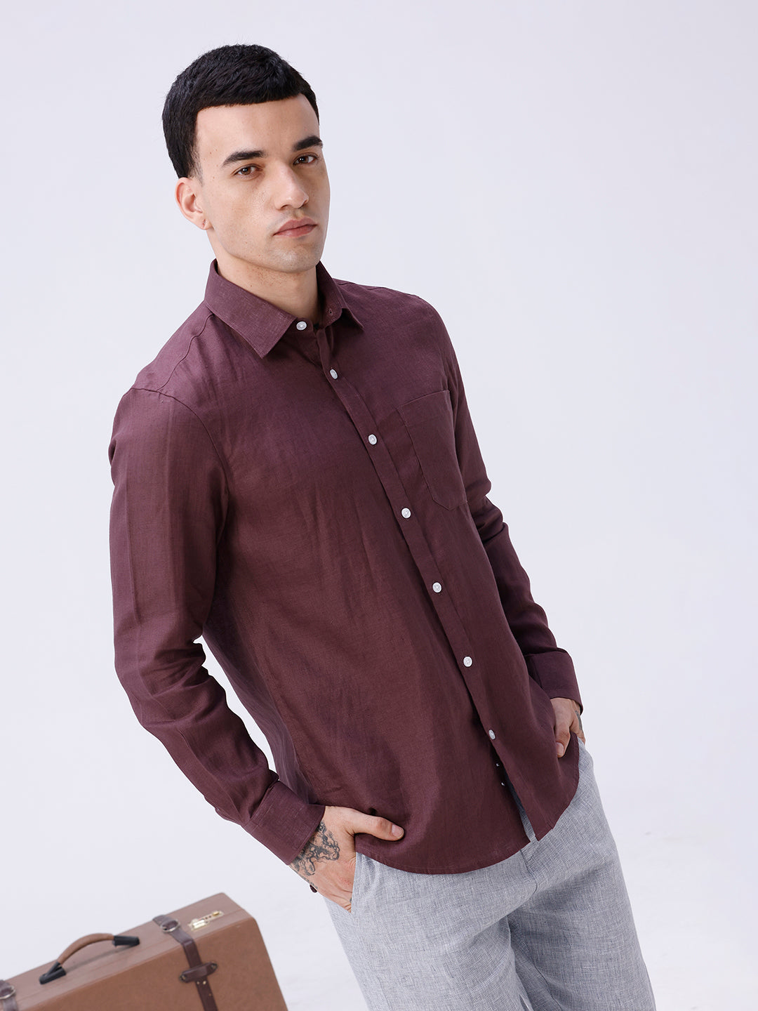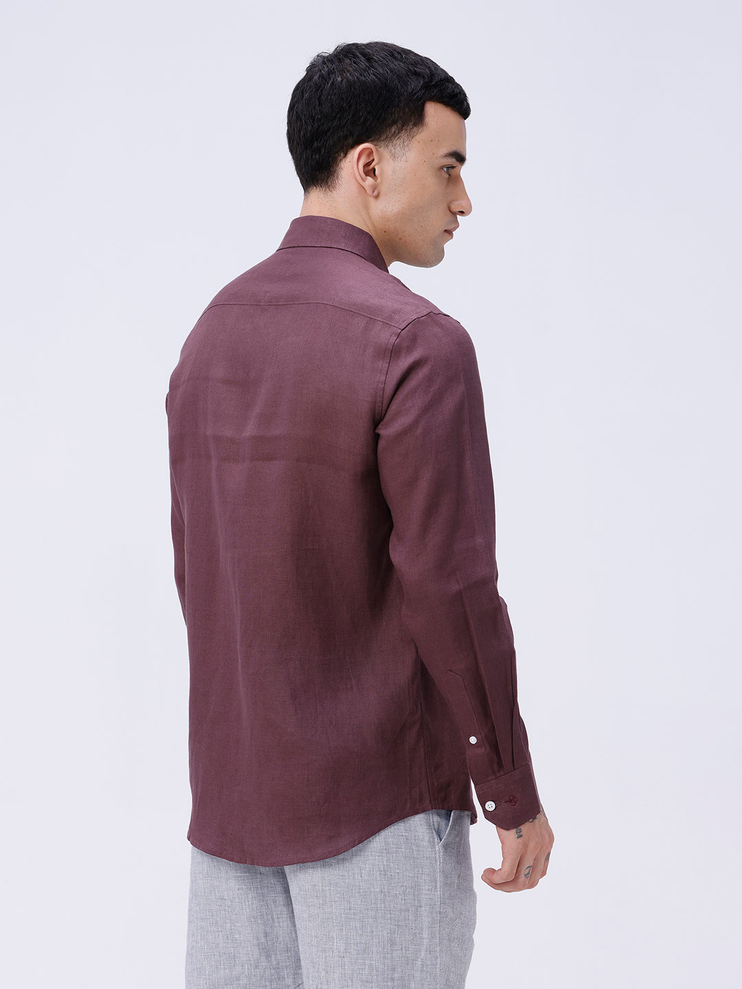 Classic full sleeve linen shirt in maroon, ideal for warm weather smart casuals.