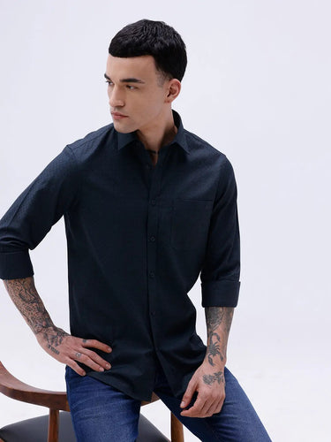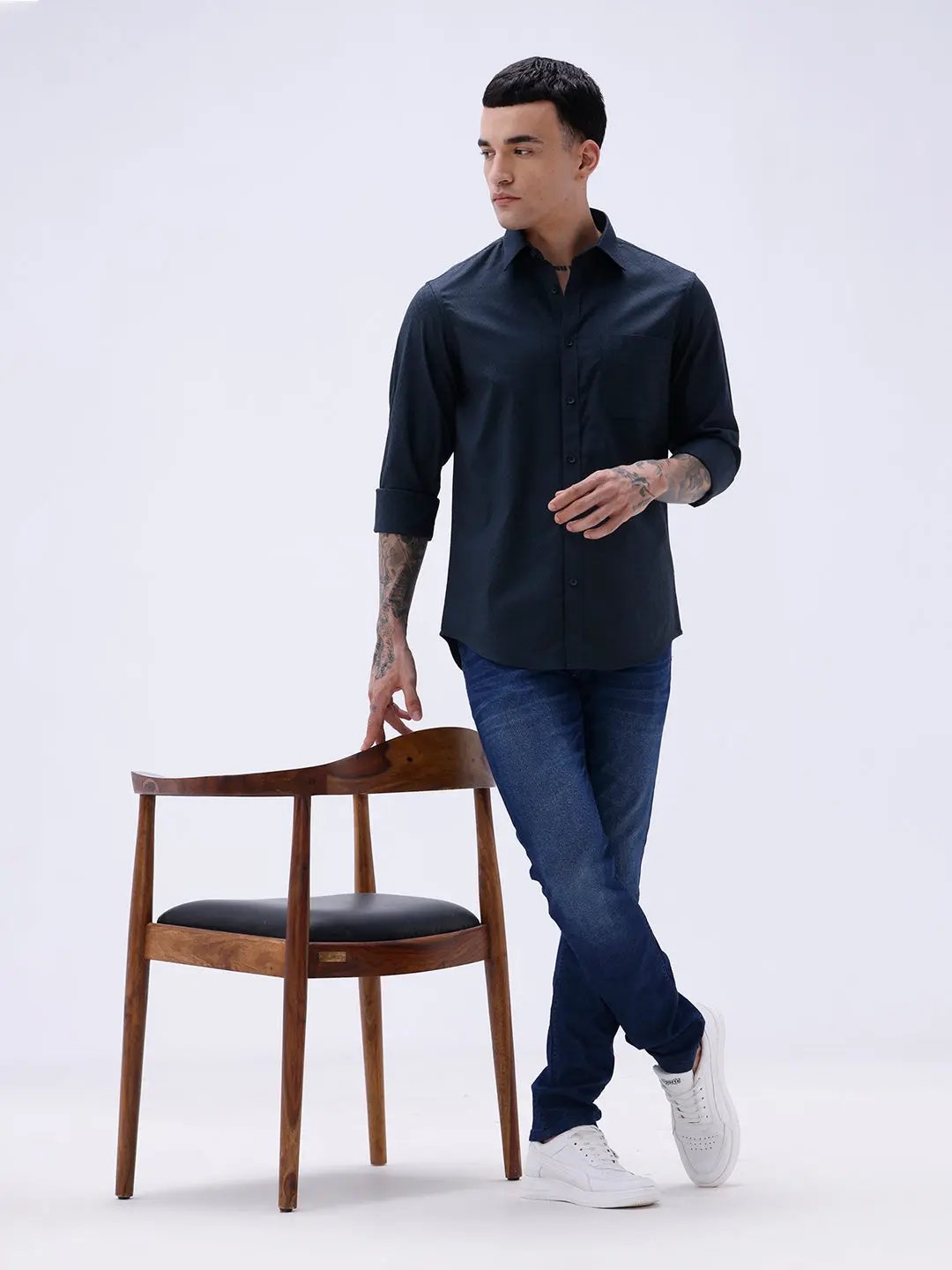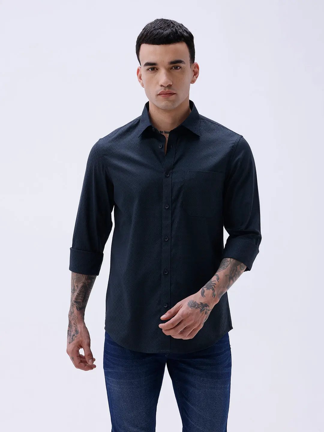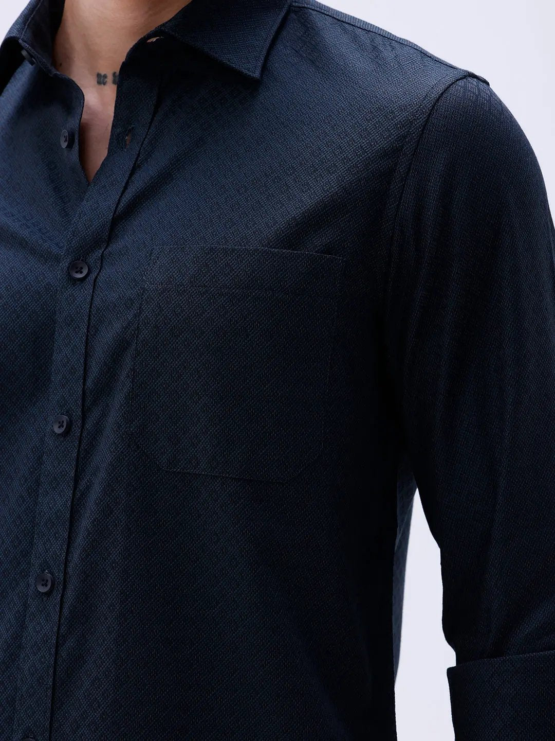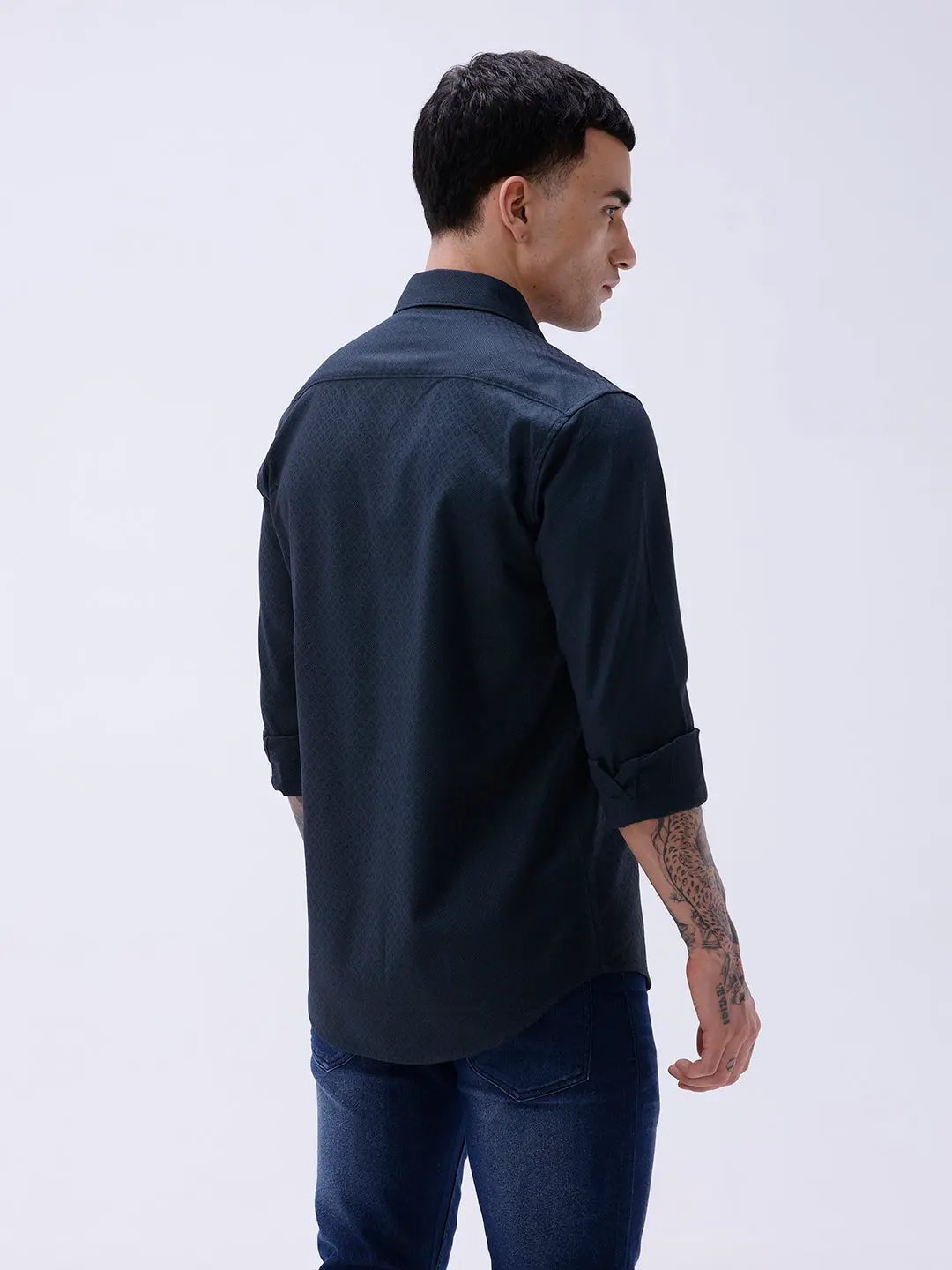 Sophisticated dobby fabric shirt combining blue and black for a sleek, modern style.