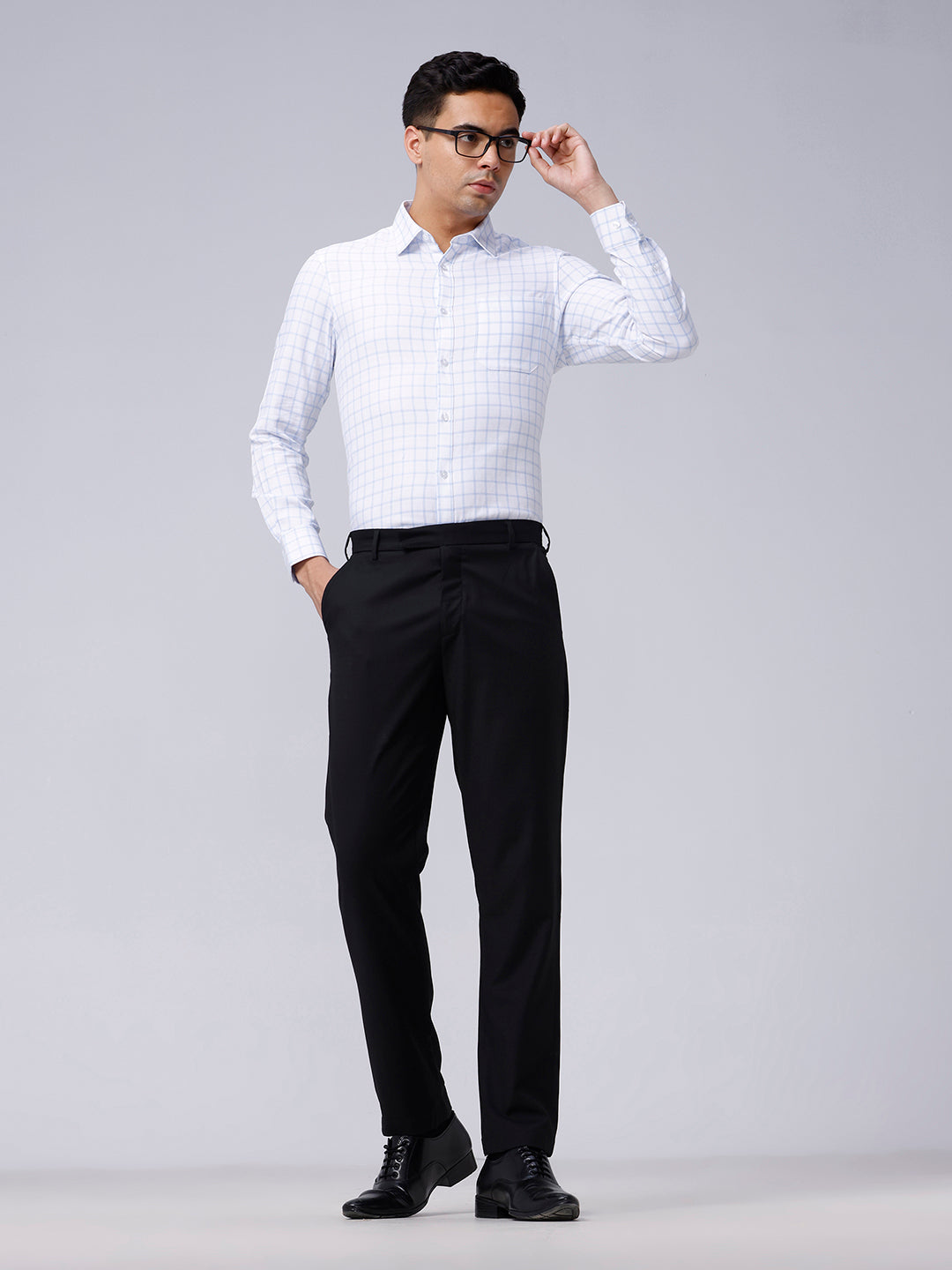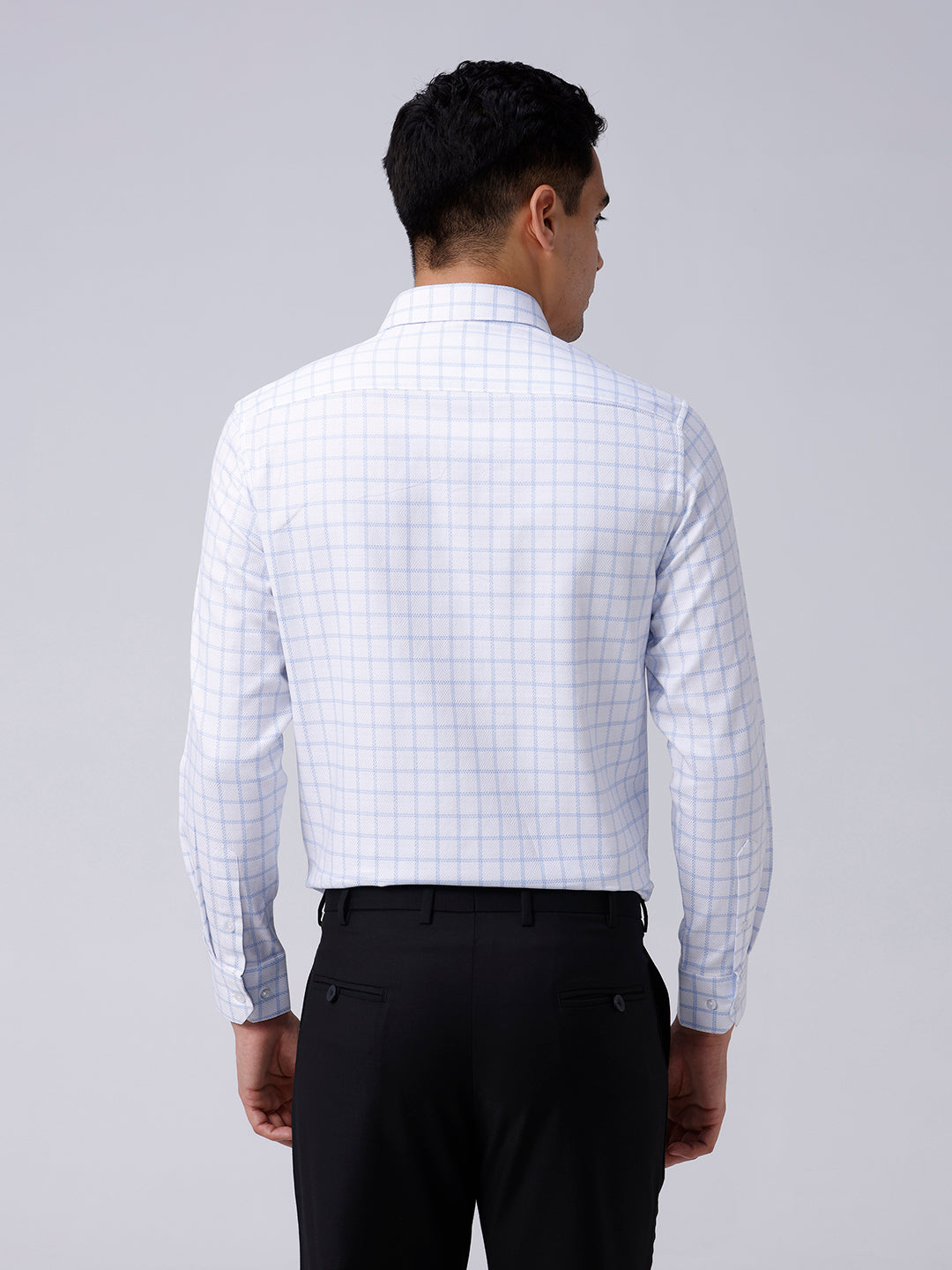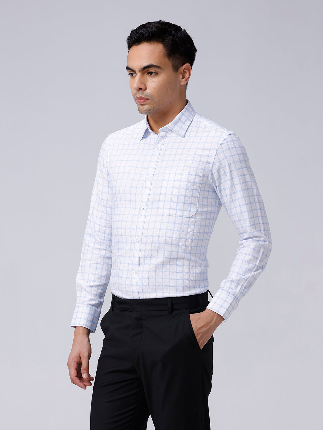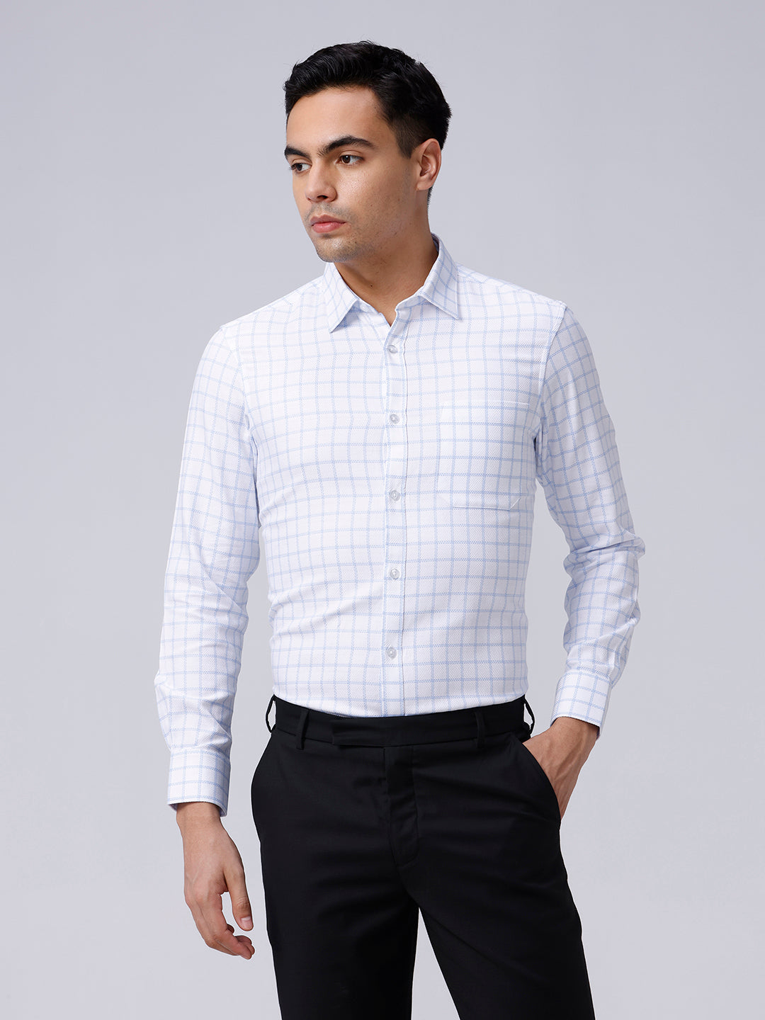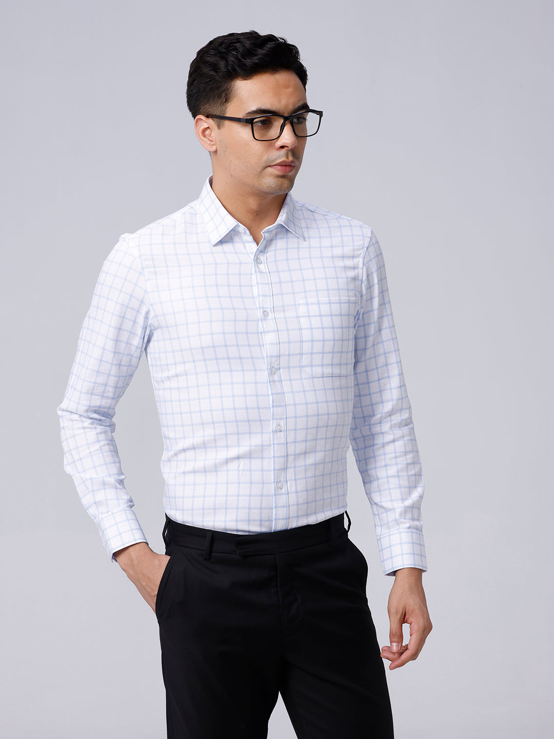 Classic checks in white and blue on dobby fabric, great for casual or office wear.