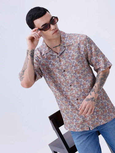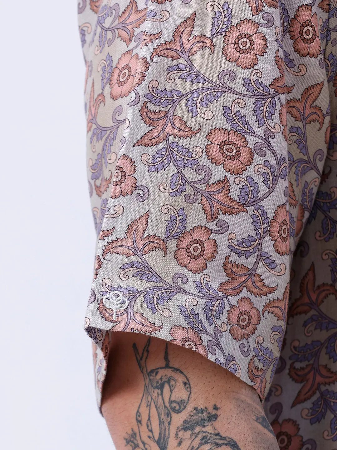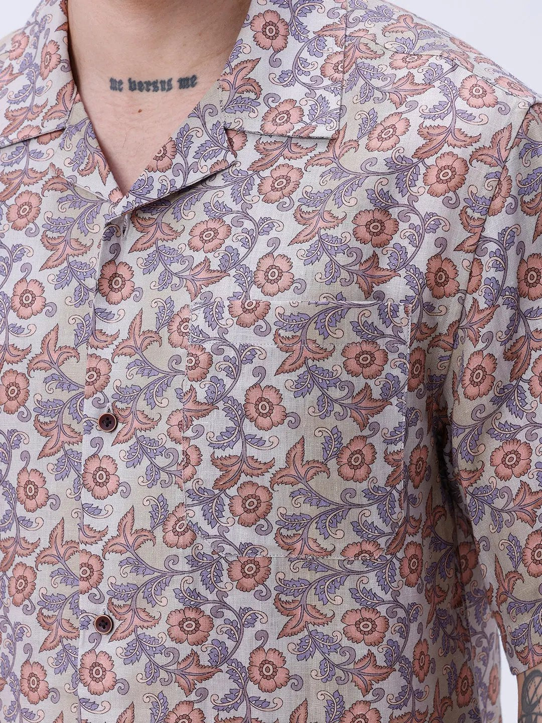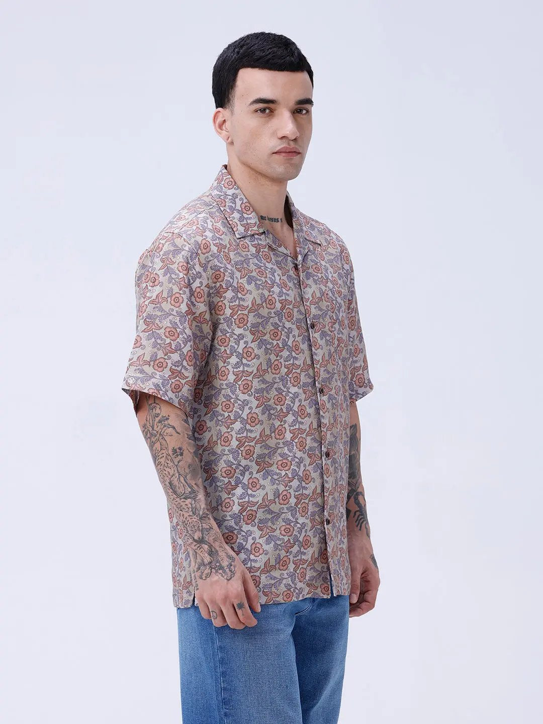 Modern digital print linen shirt blending beige and brown tones for a stylish, contemporary look.