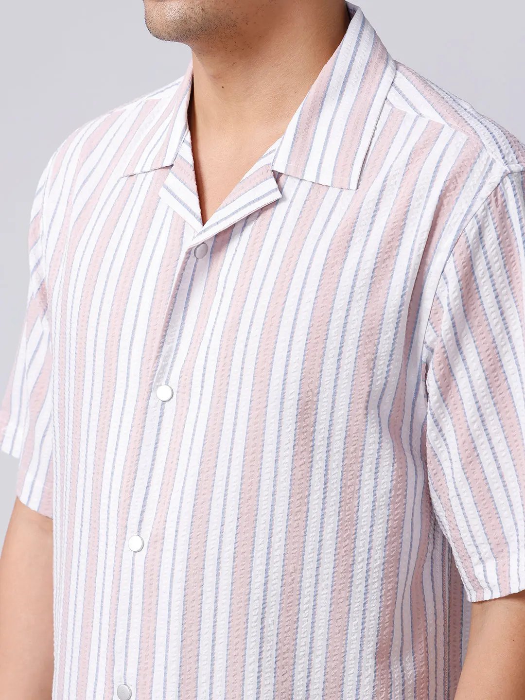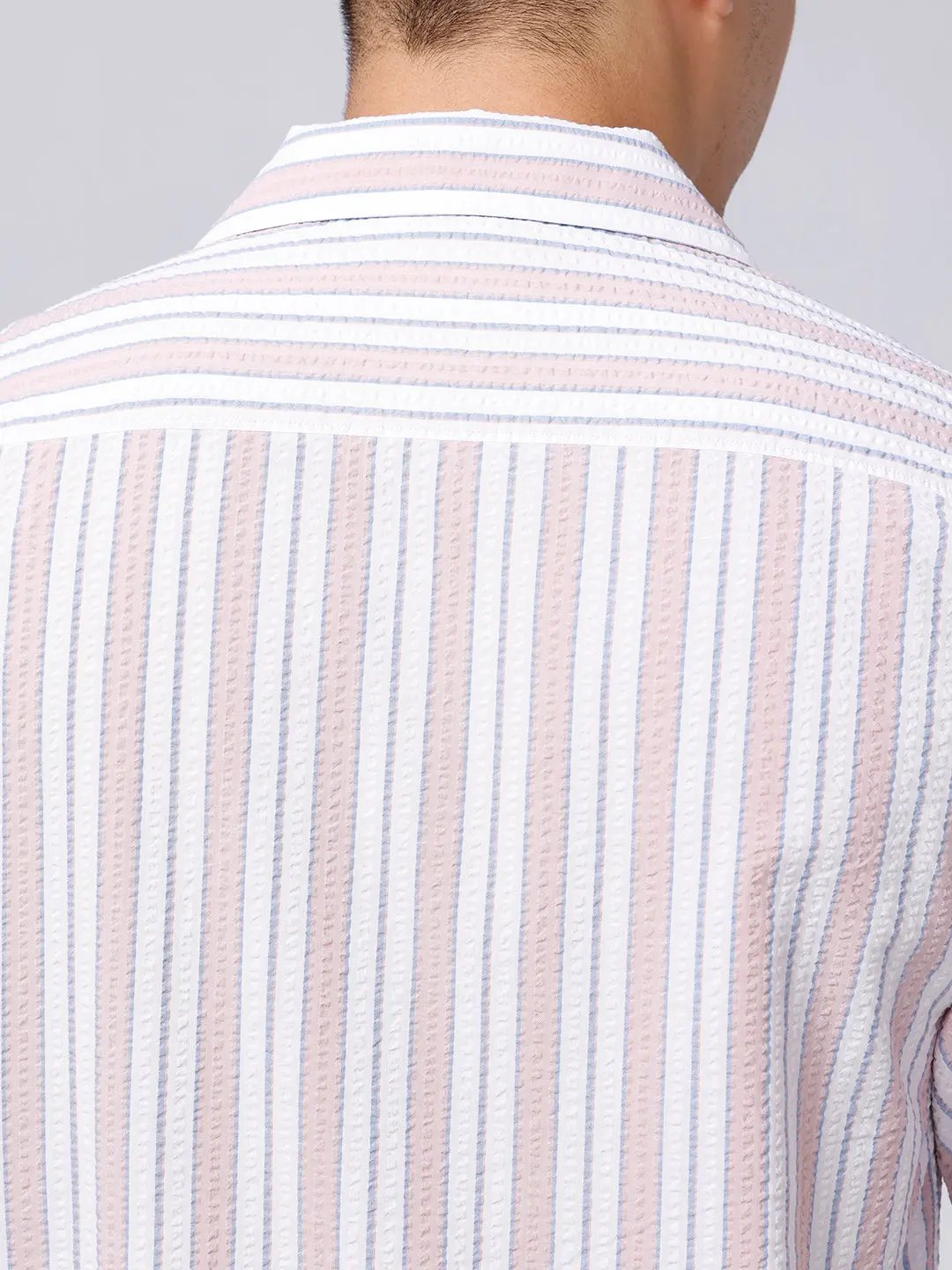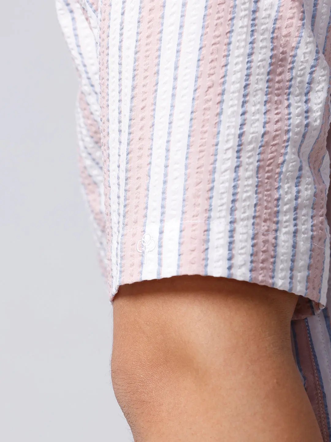 Textured waffle fabric with pink and white stripes, casual and comfortable.