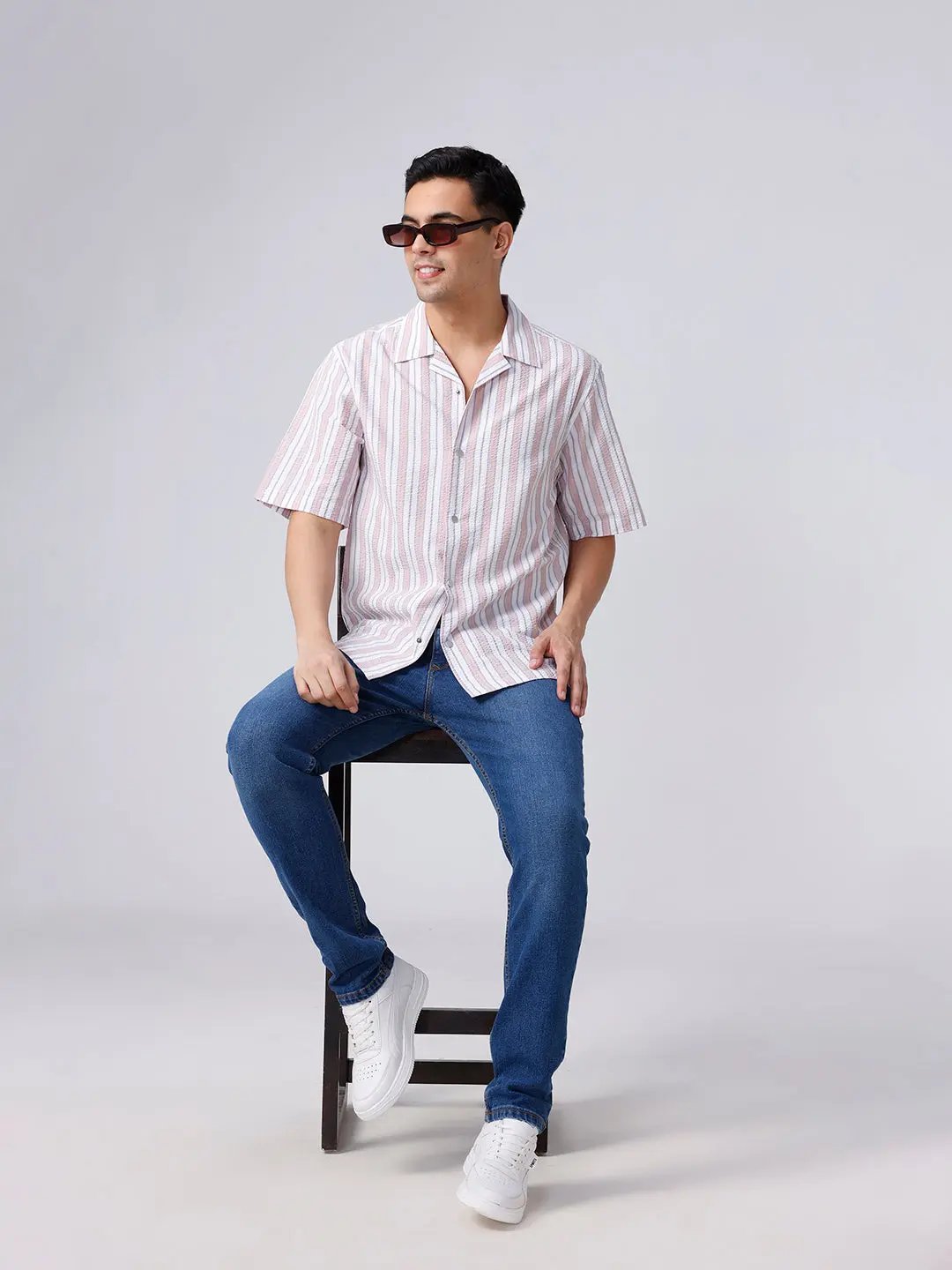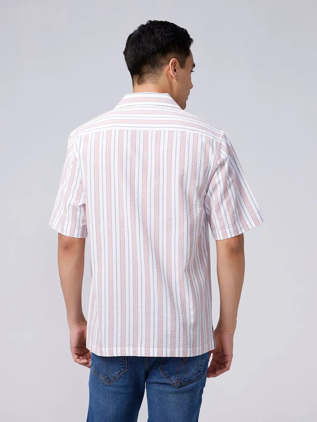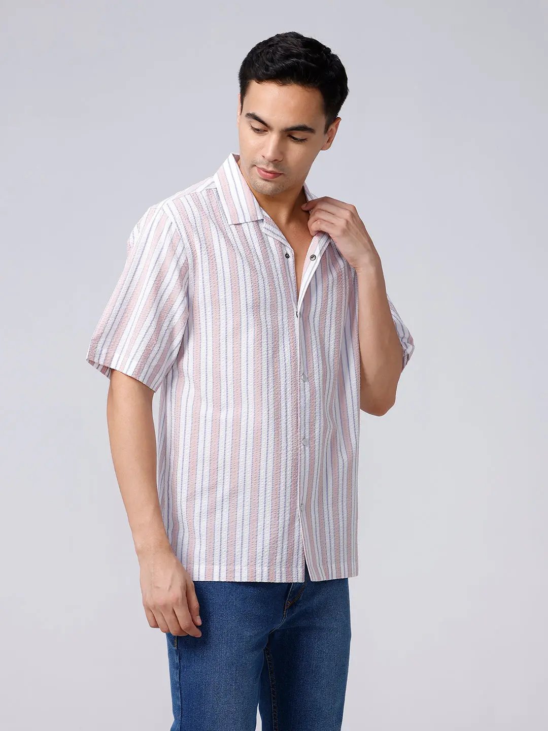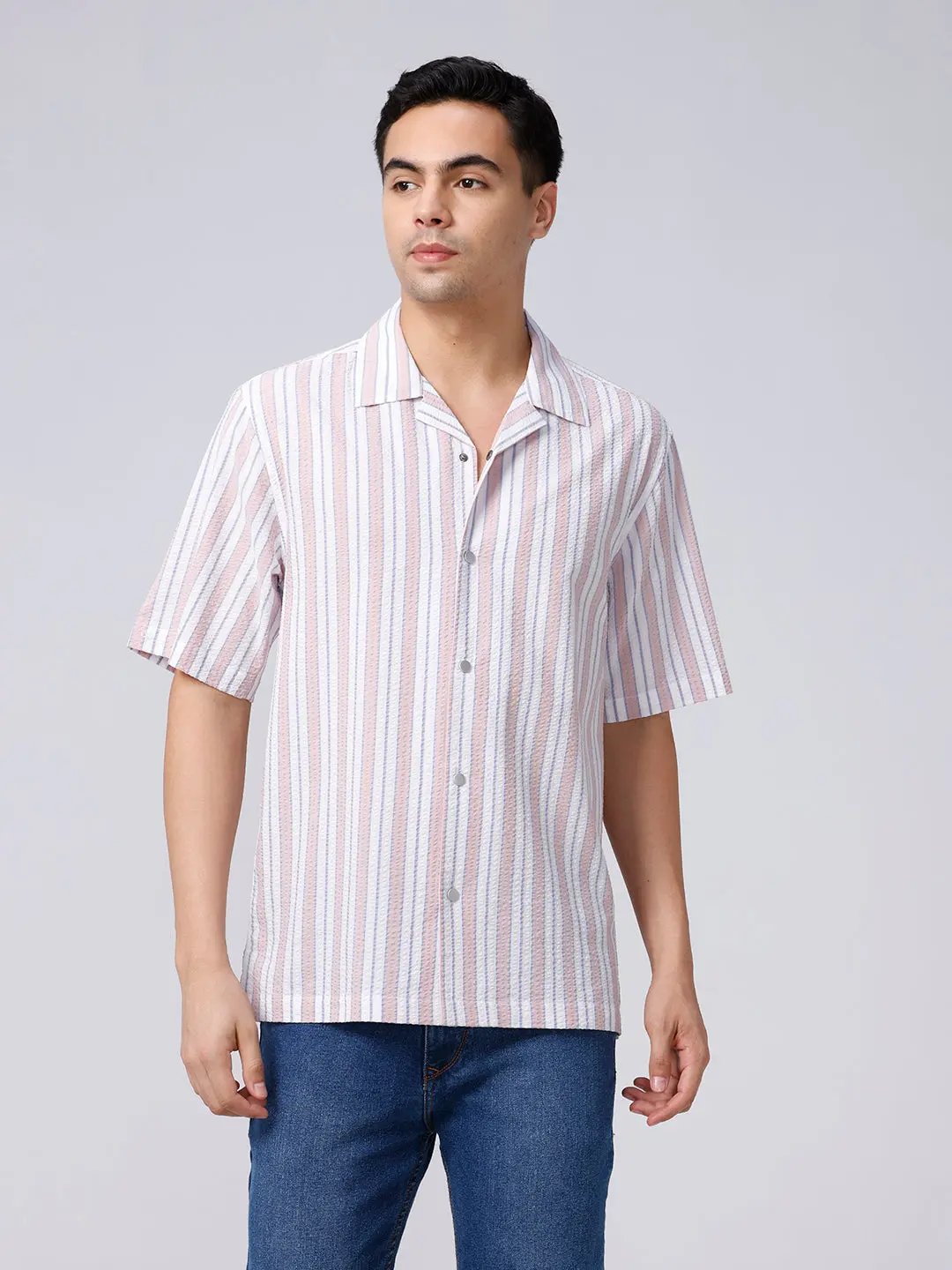Textured waffle fabric with pink and white stripes, casual and comfortable.