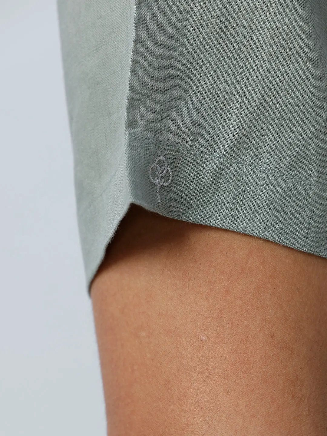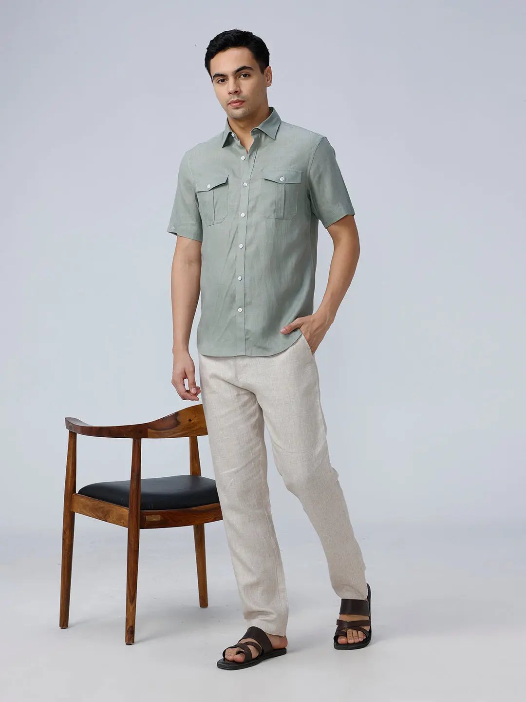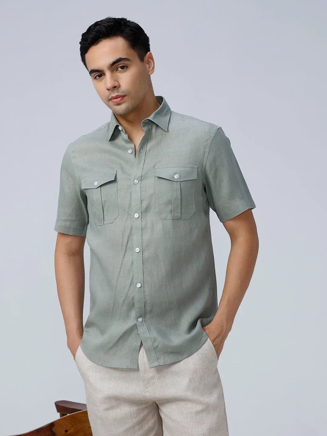 Lightweight linen shirt with double chest pockets in green, ideal for summer.