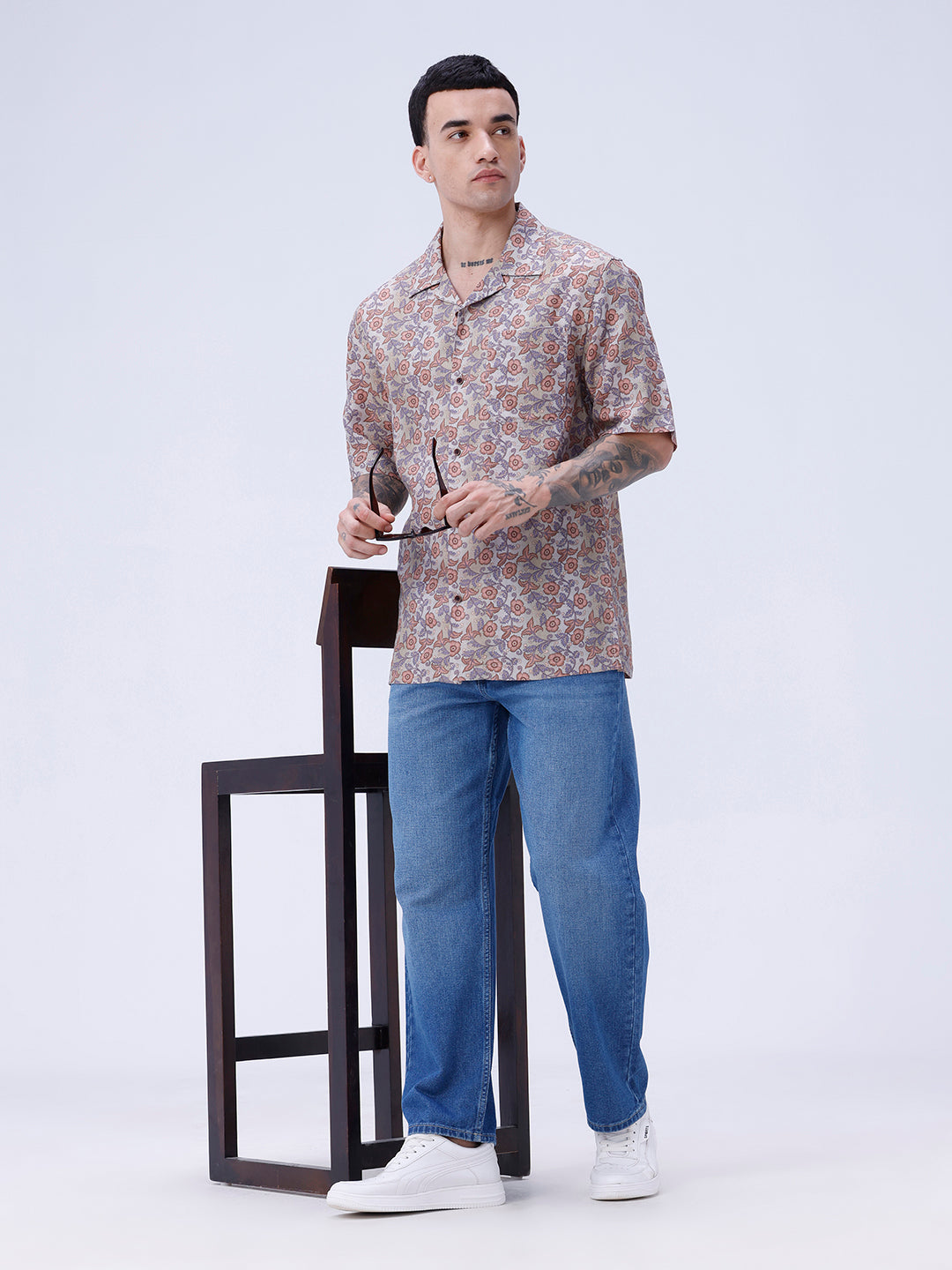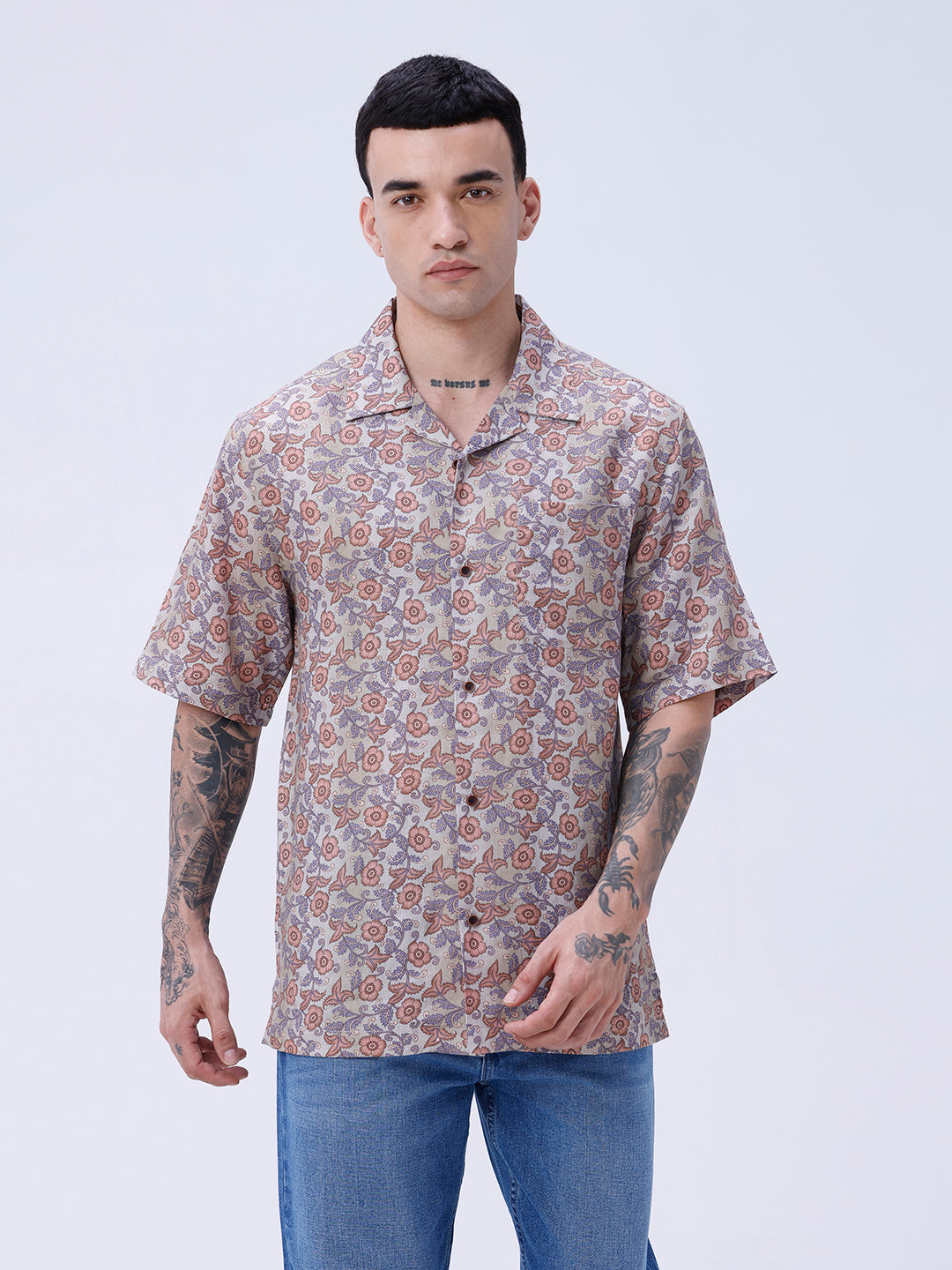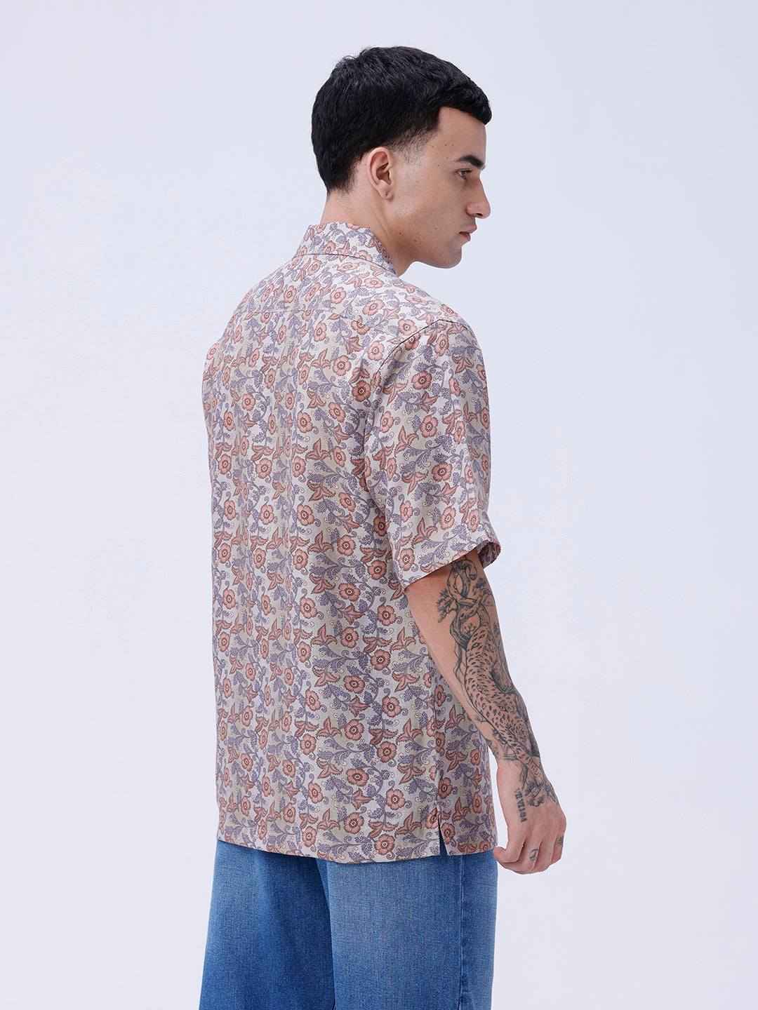 Modern digital print linen shirt blending beige and brown tones for a stylish, contemporary look.