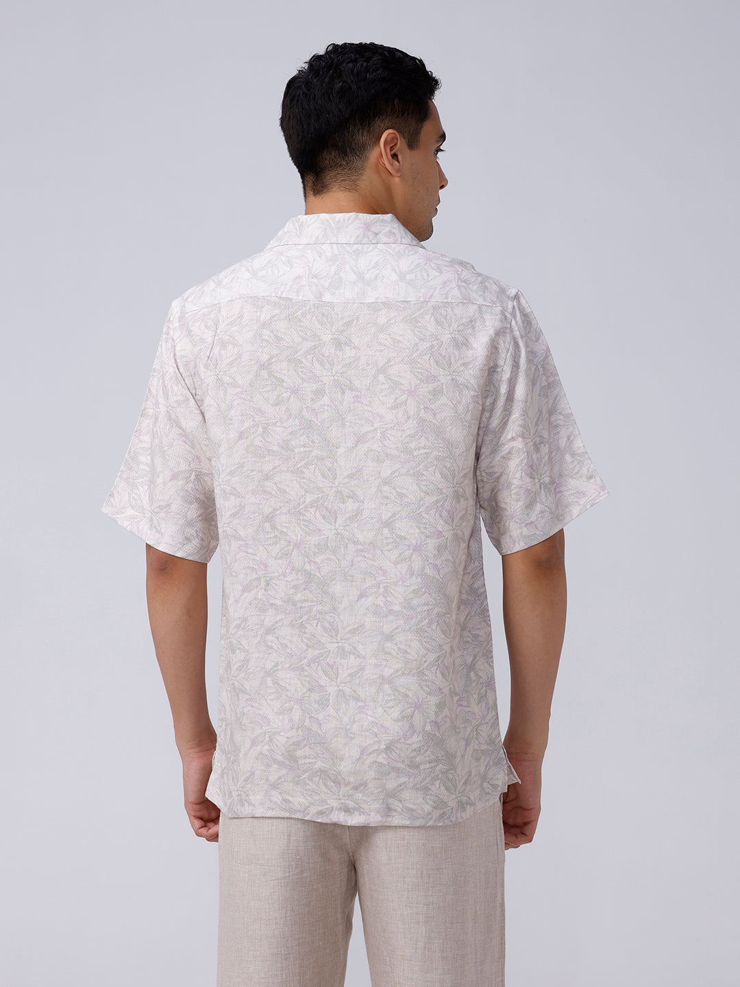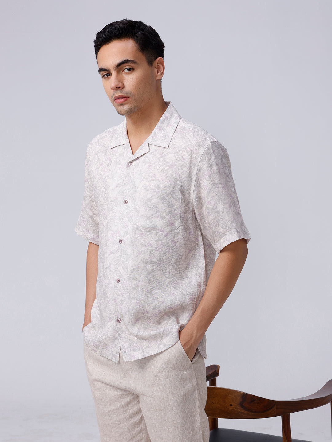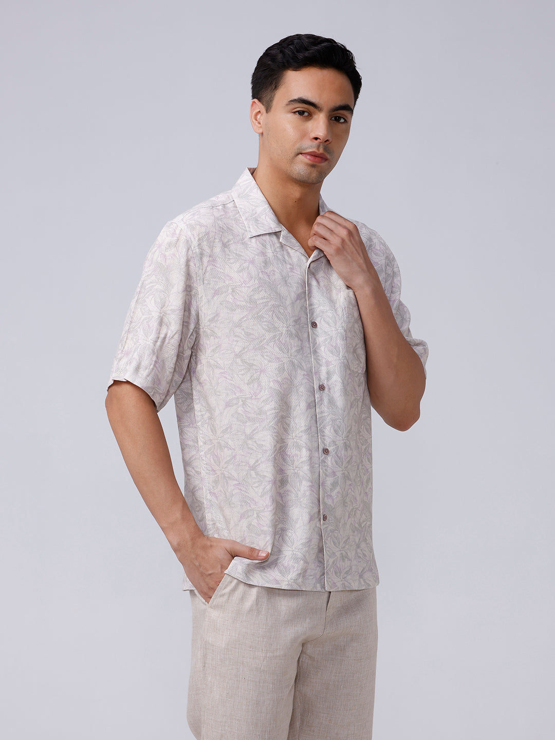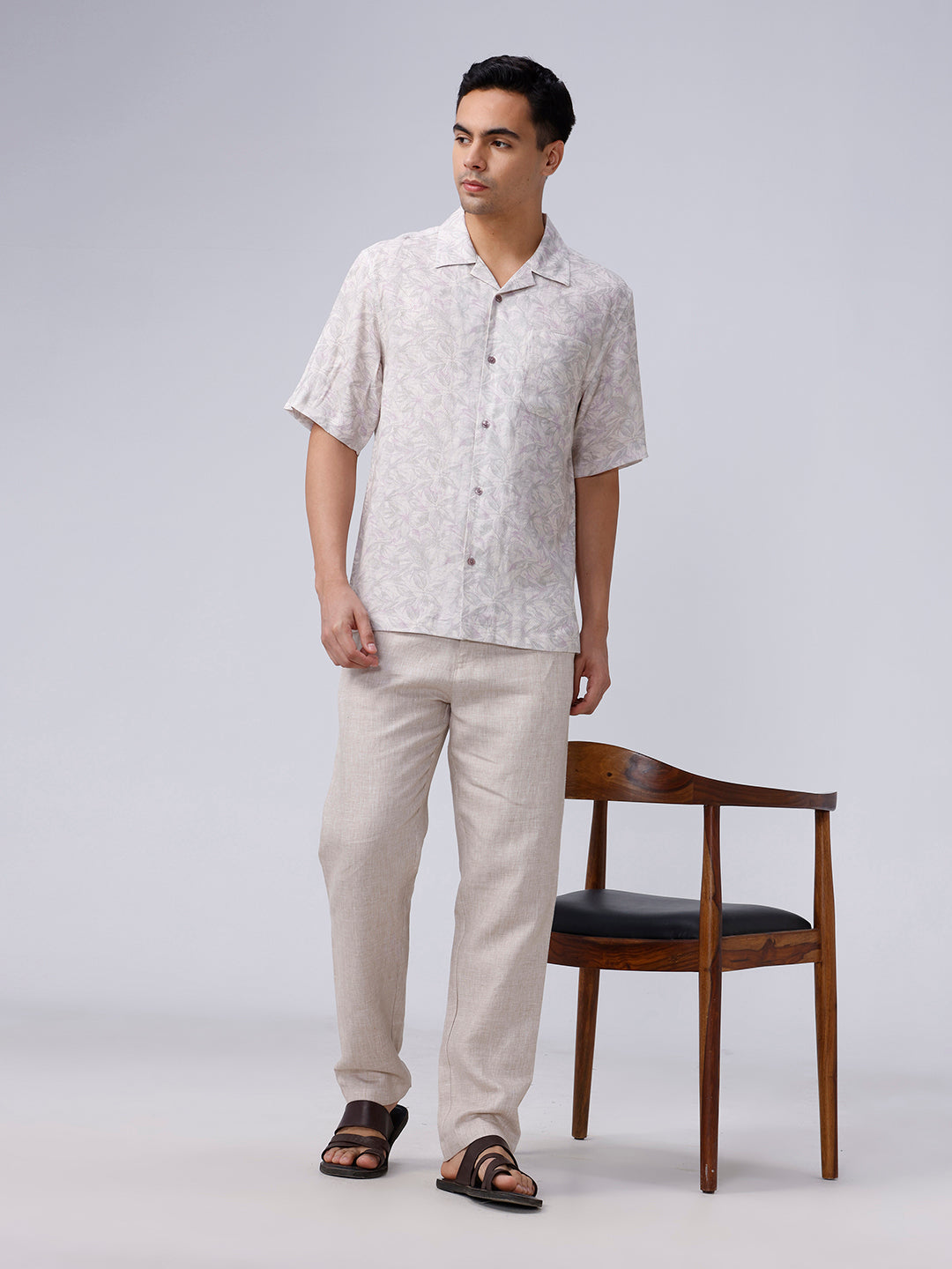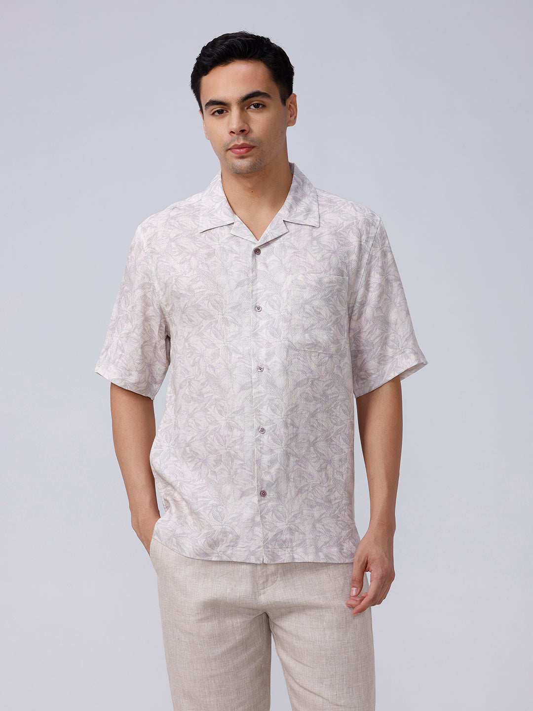 Unique digital print combining beige and light purple tones for a distinctive casual style.
