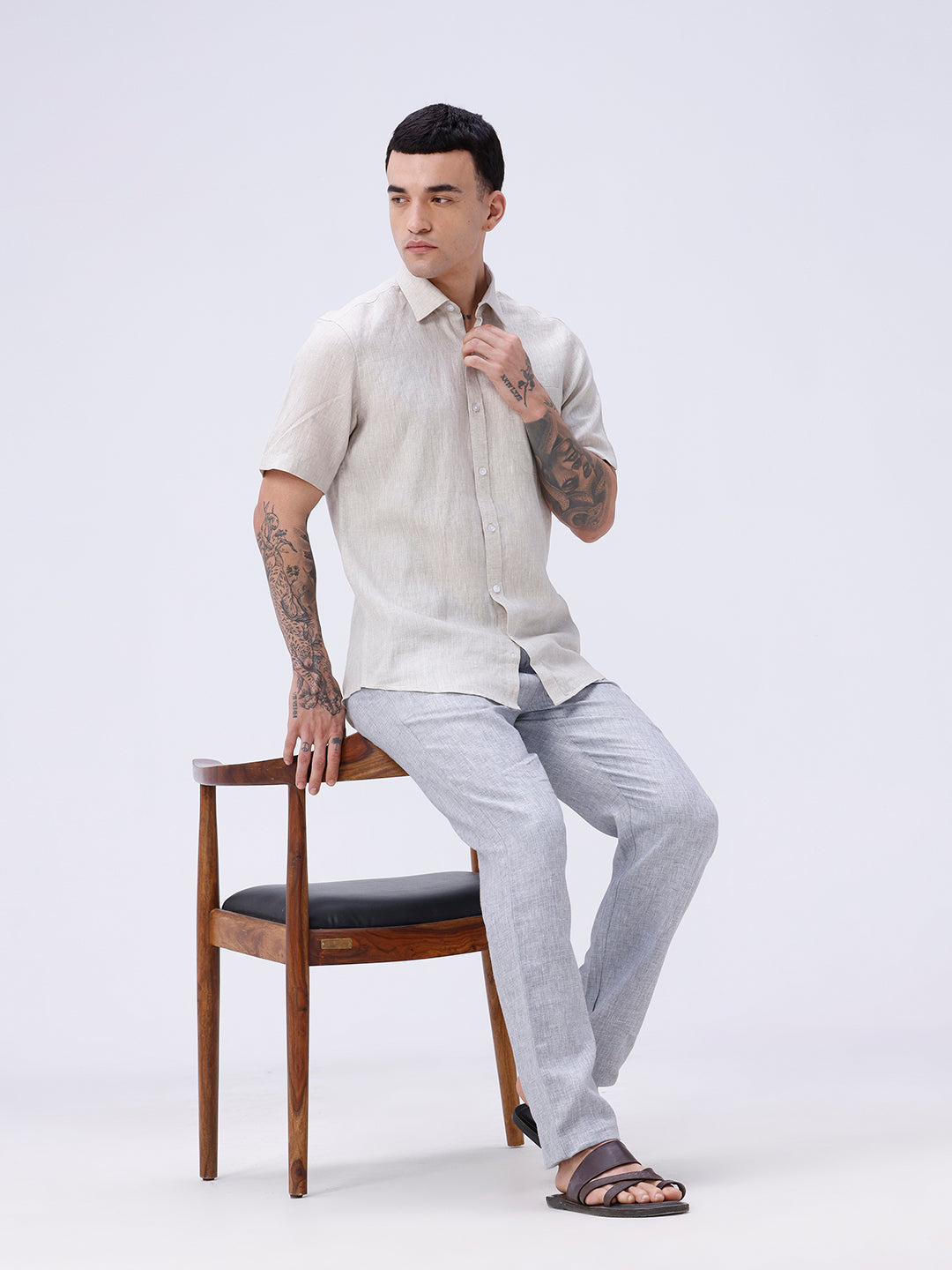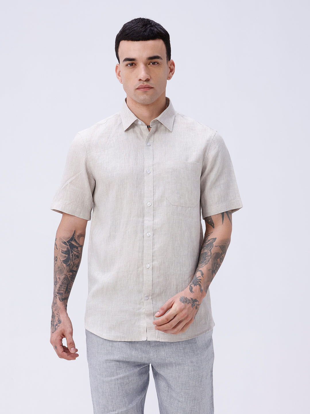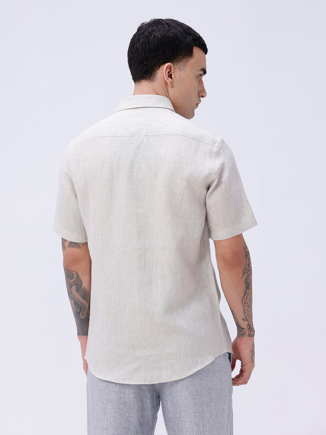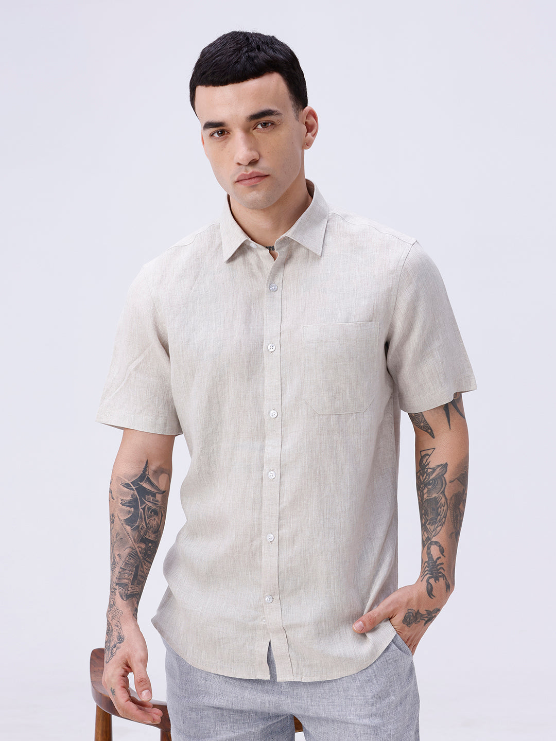 Breathable, lightweight linen shirt in beige, ideal for warm weather casual or semi-formal looks.