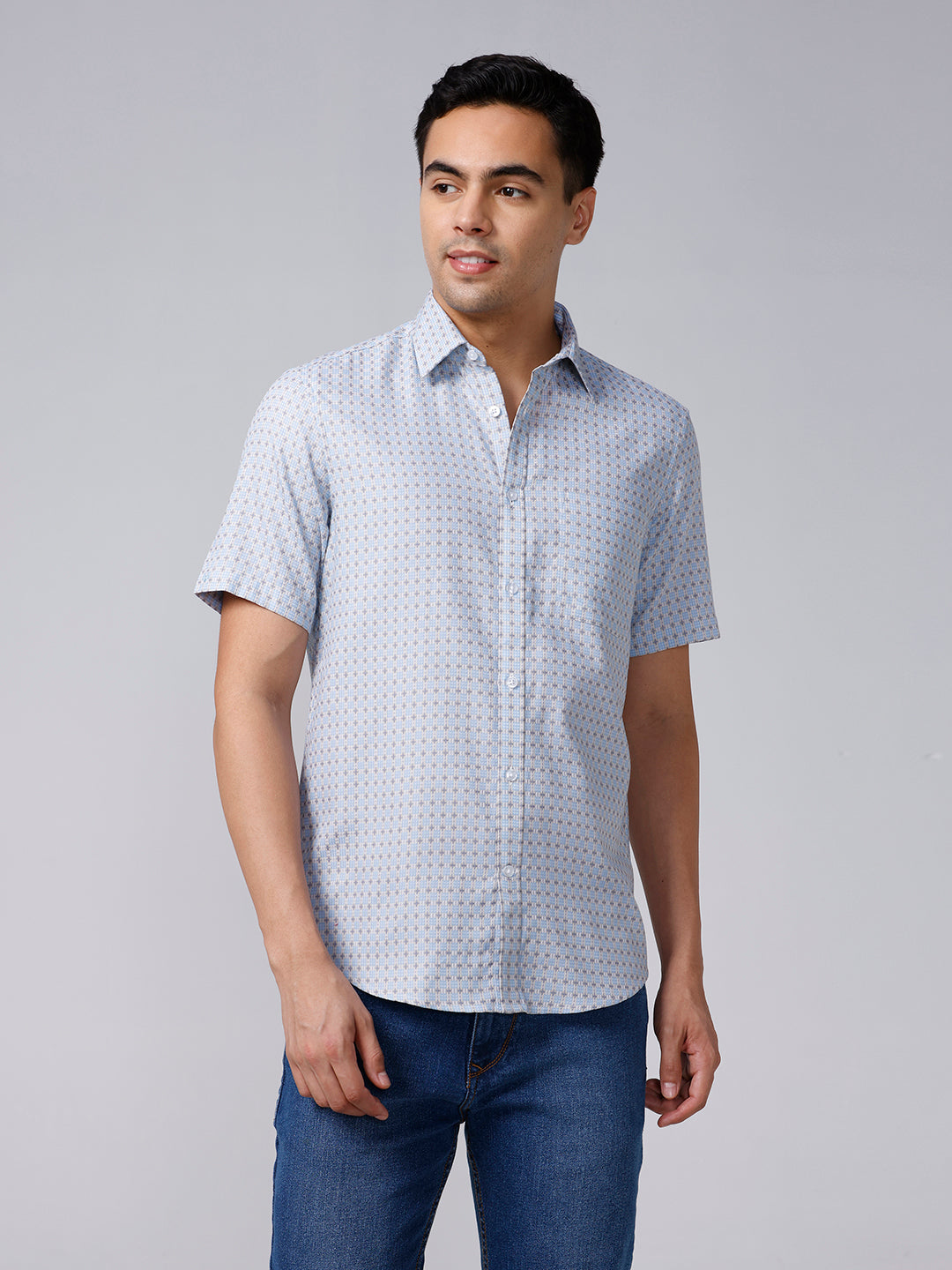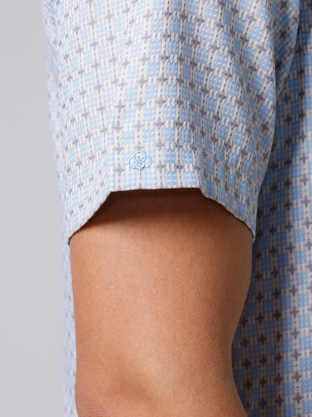 Patterned dobby shirt featuring blue and grey shades, perfect for casual outings.