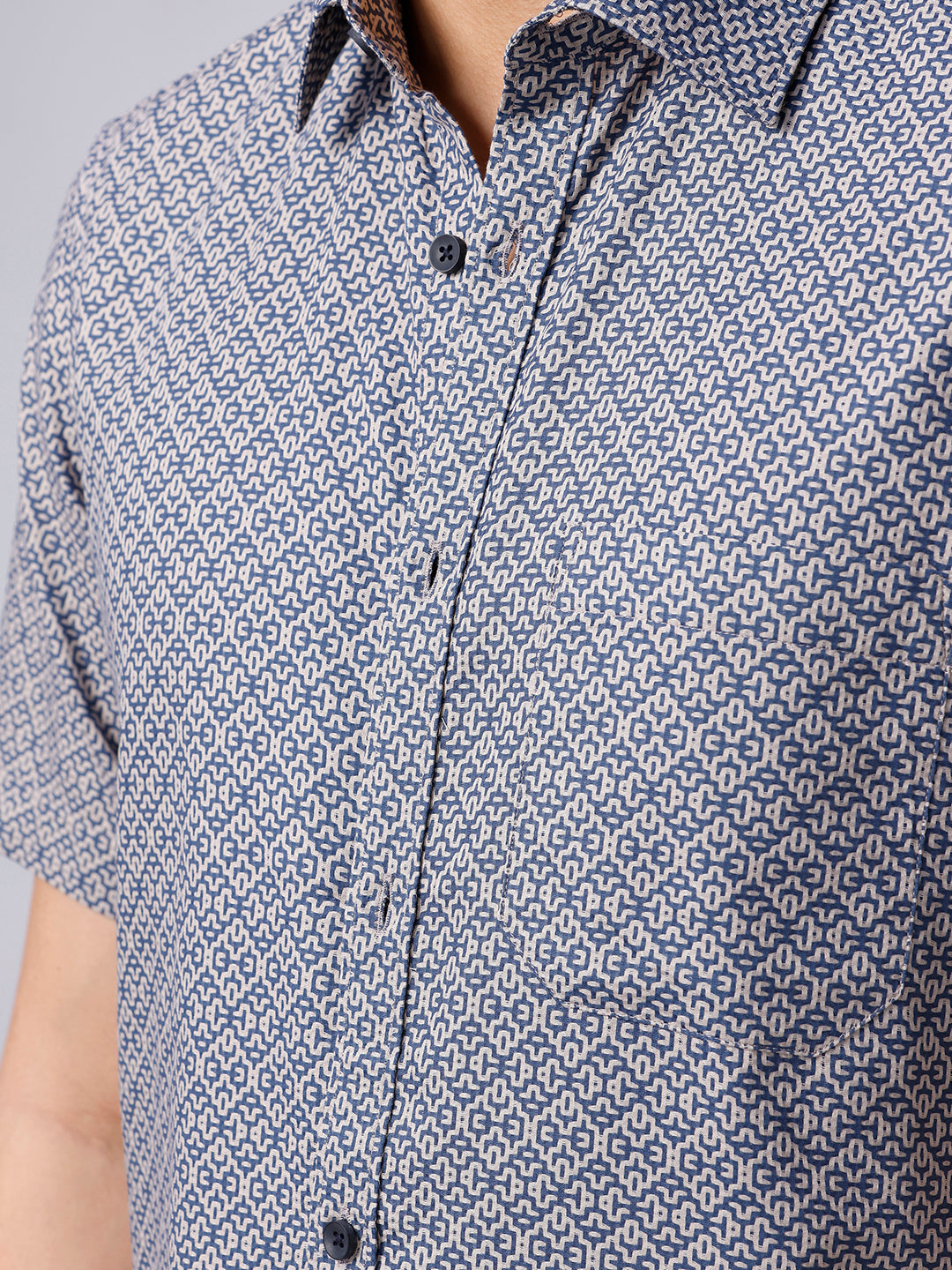 Stylish dobby fabric shirt featuring intricate blue print patterns, suitable for casual or semi-formal occasions.