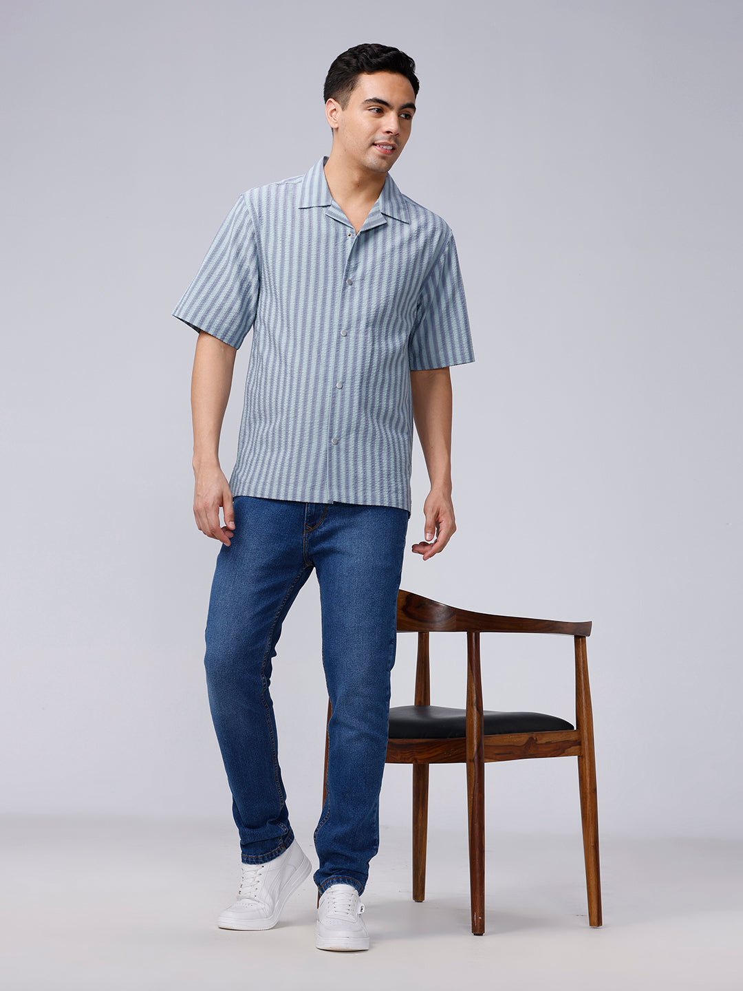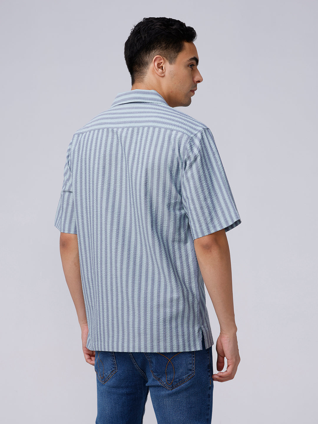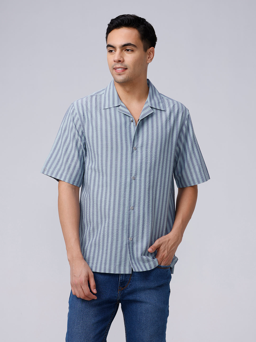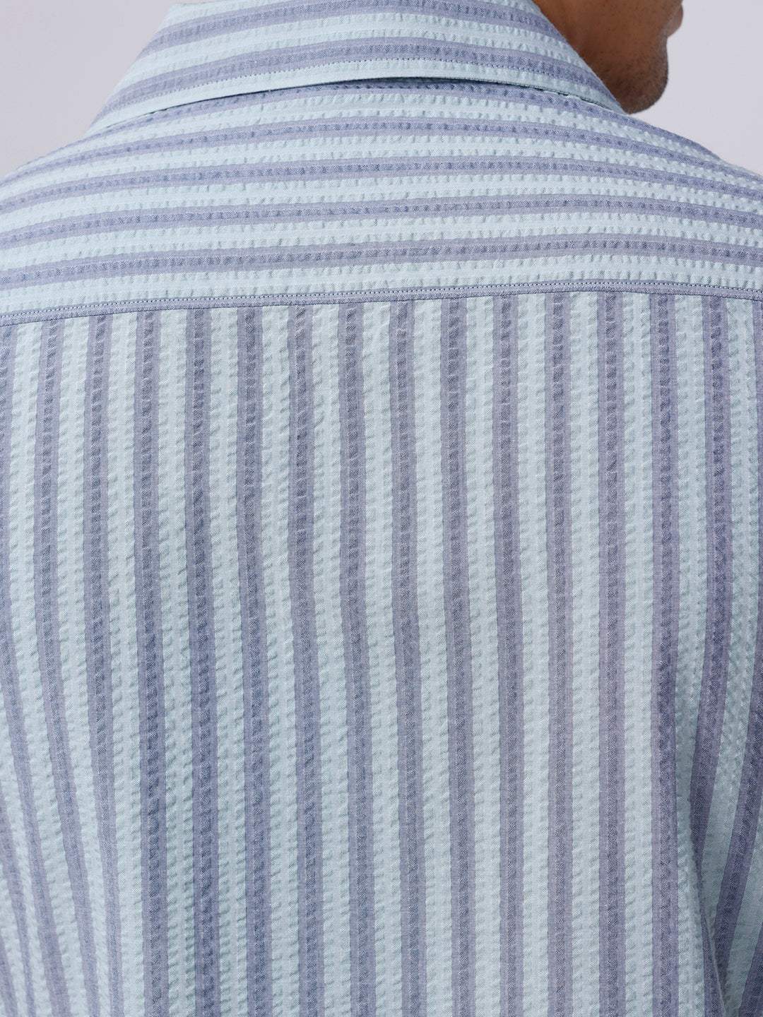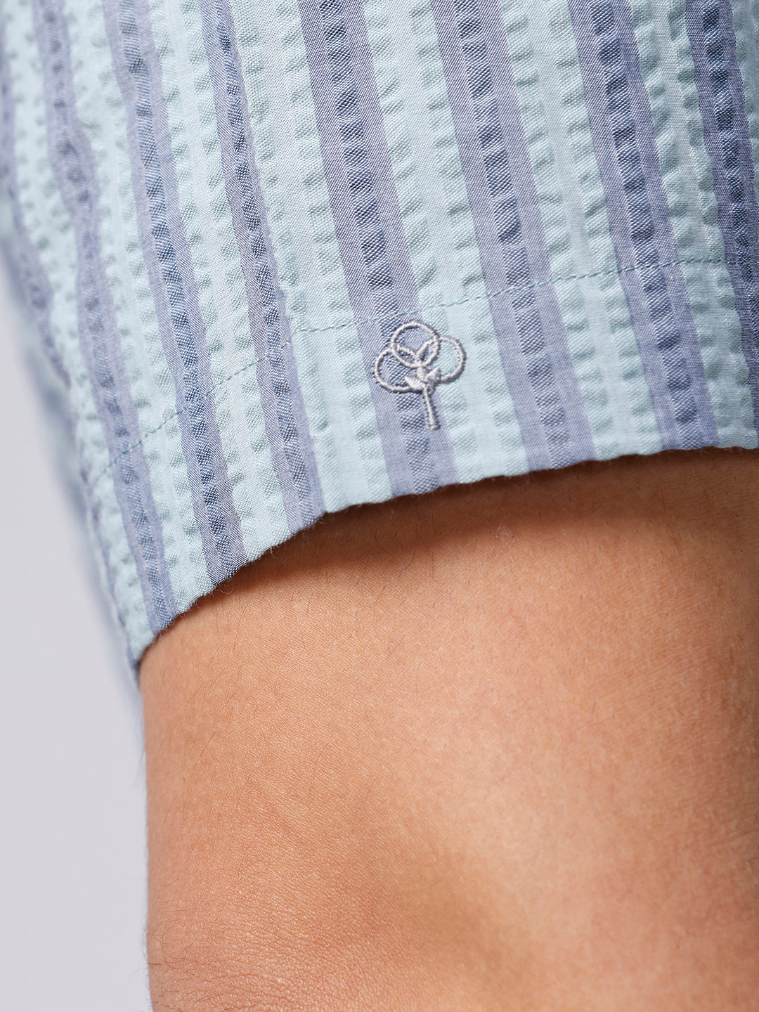 Waffle-dobby fabric in green and grey, blending texture with a casual striped pattern.