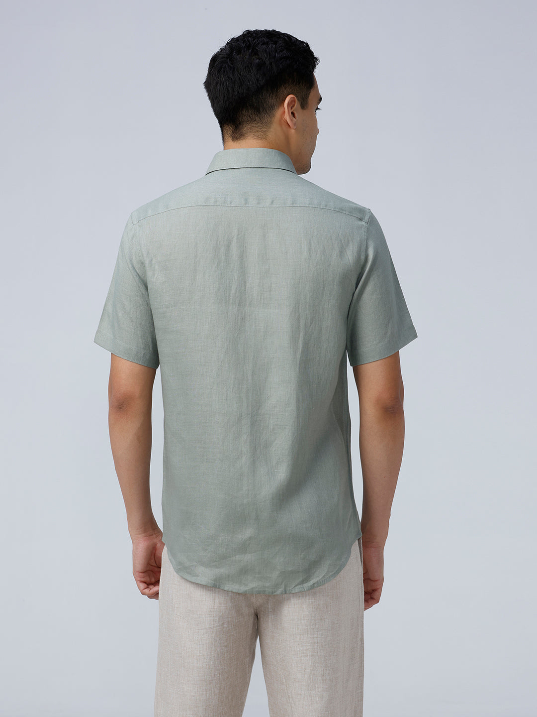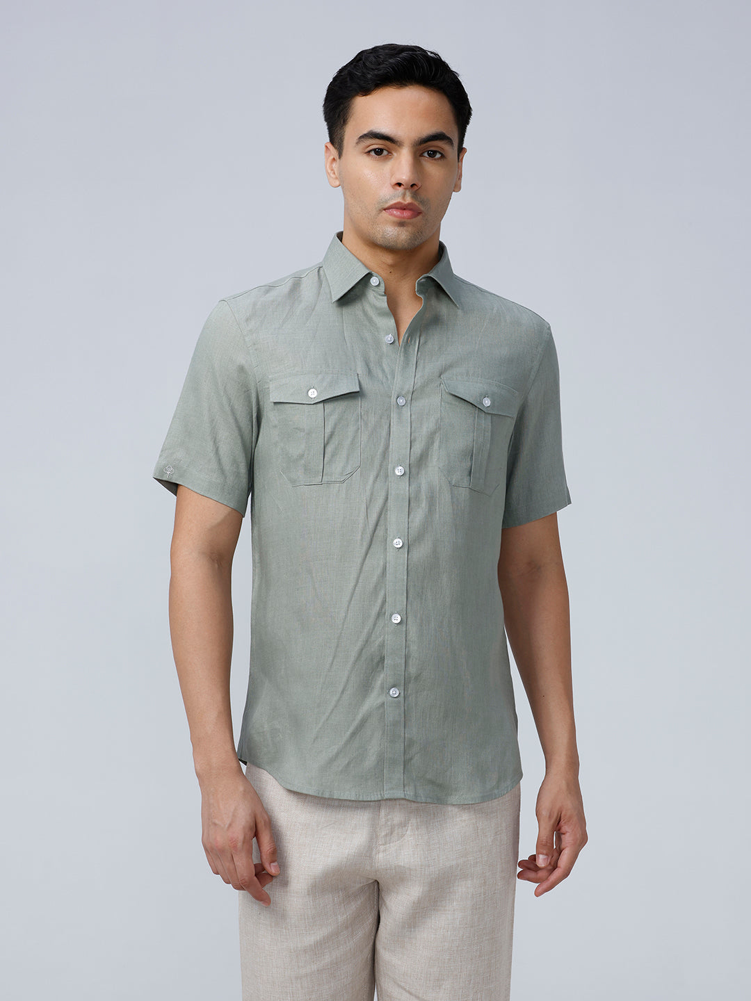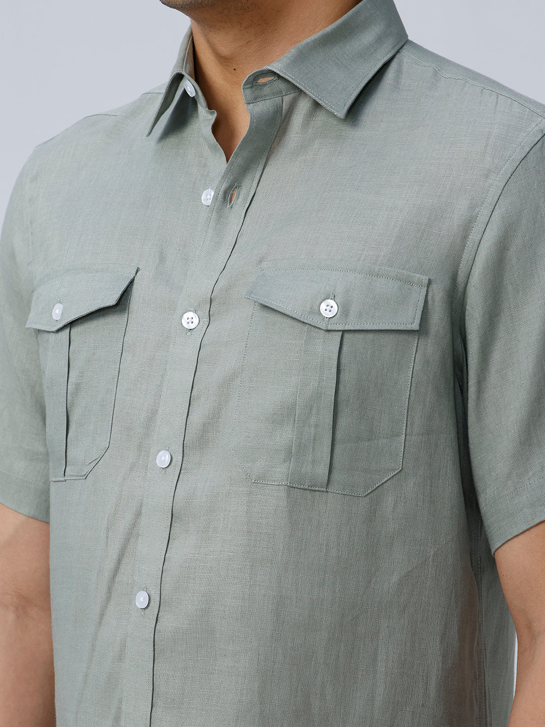 Lightweight linen shirt with double chest pockets in green, ideal for summer.