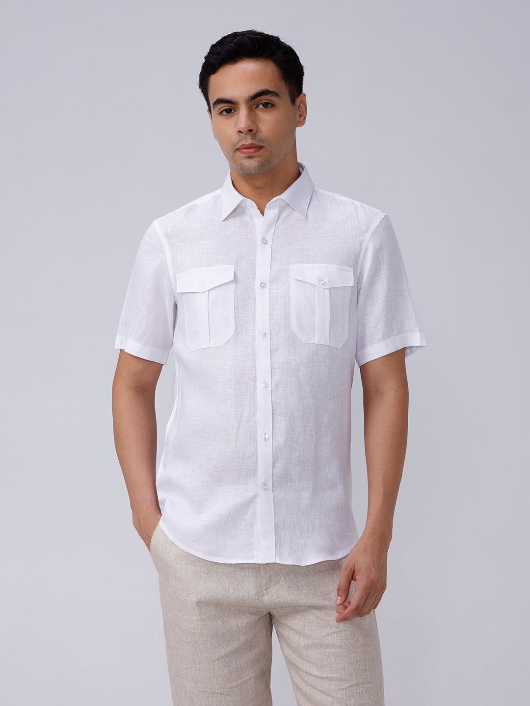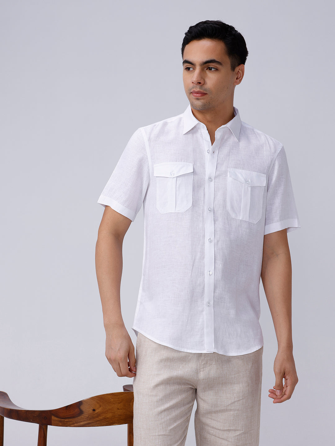 Refreshing linen shirt with double pockets in white, perfect for summer casuals.