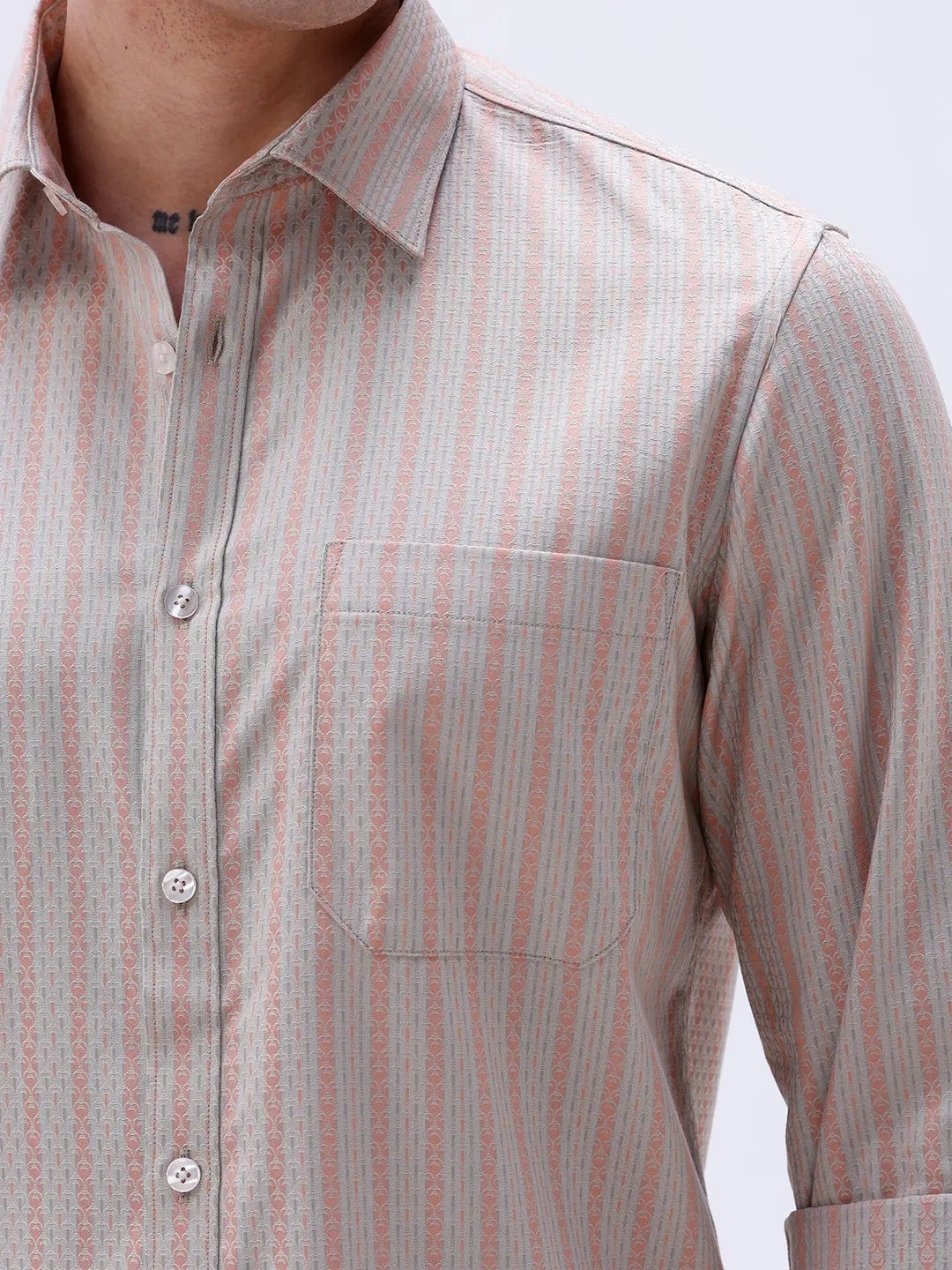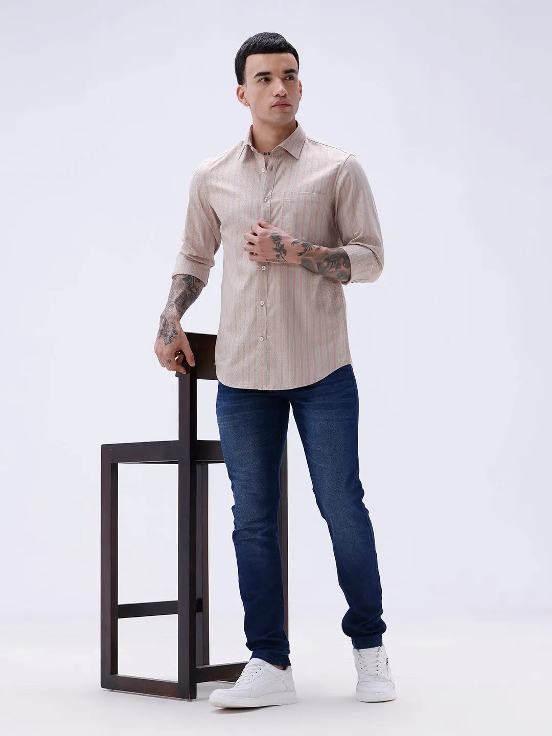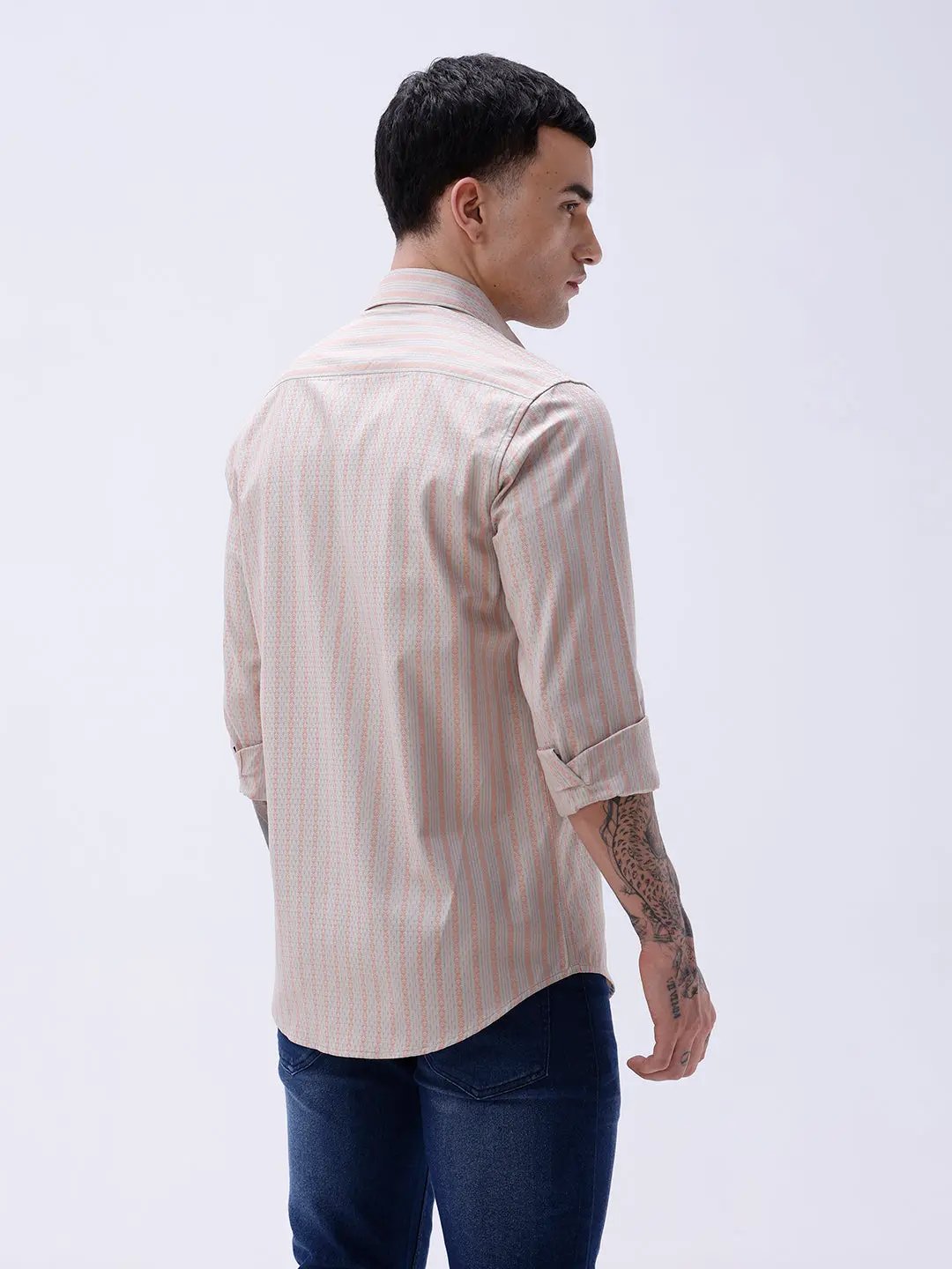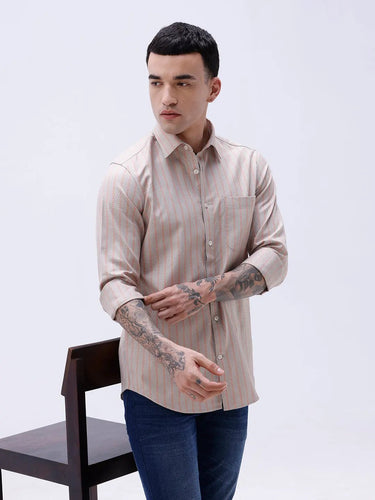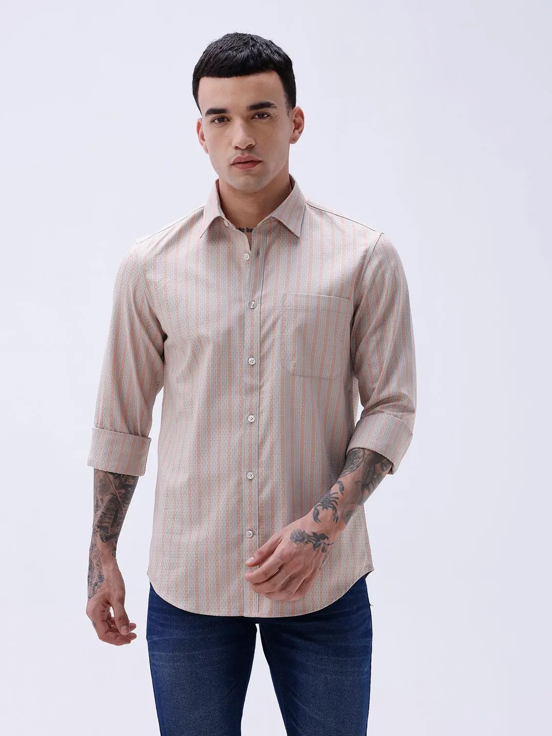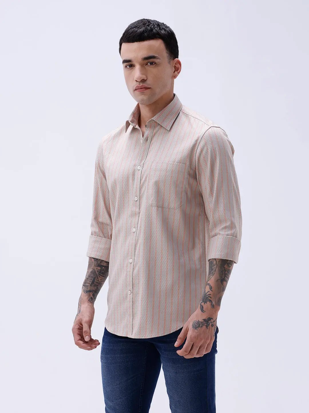 Stylish dobby fabric shirt featuring bold beige and orange stripes, perfect for smart casuals.