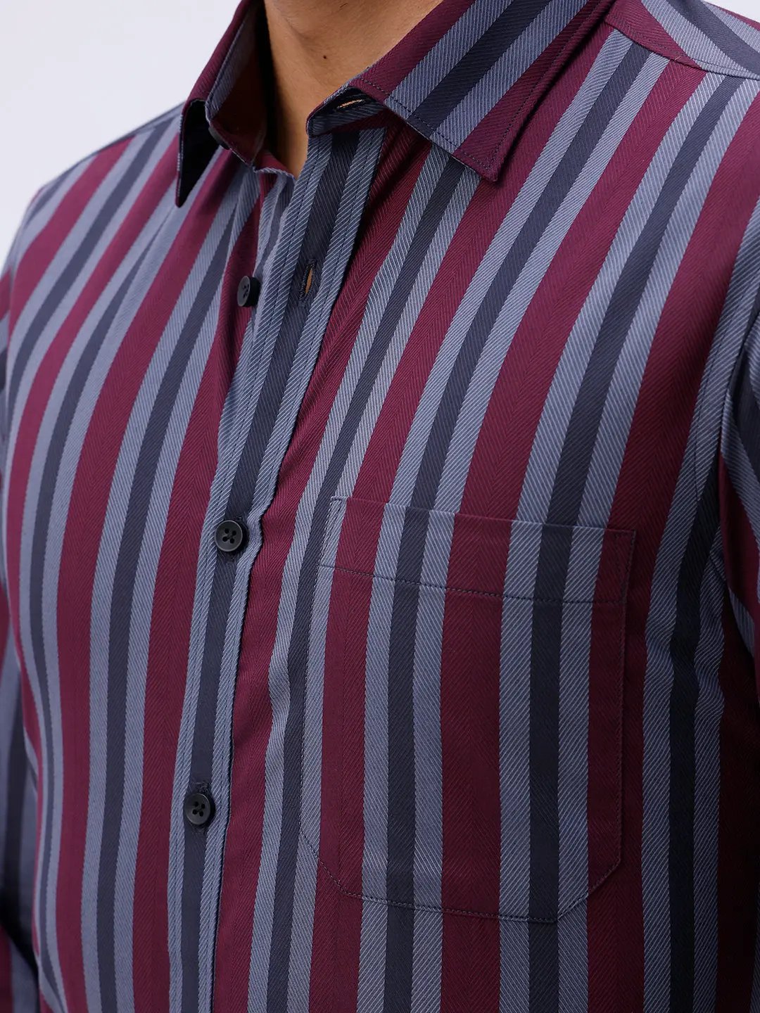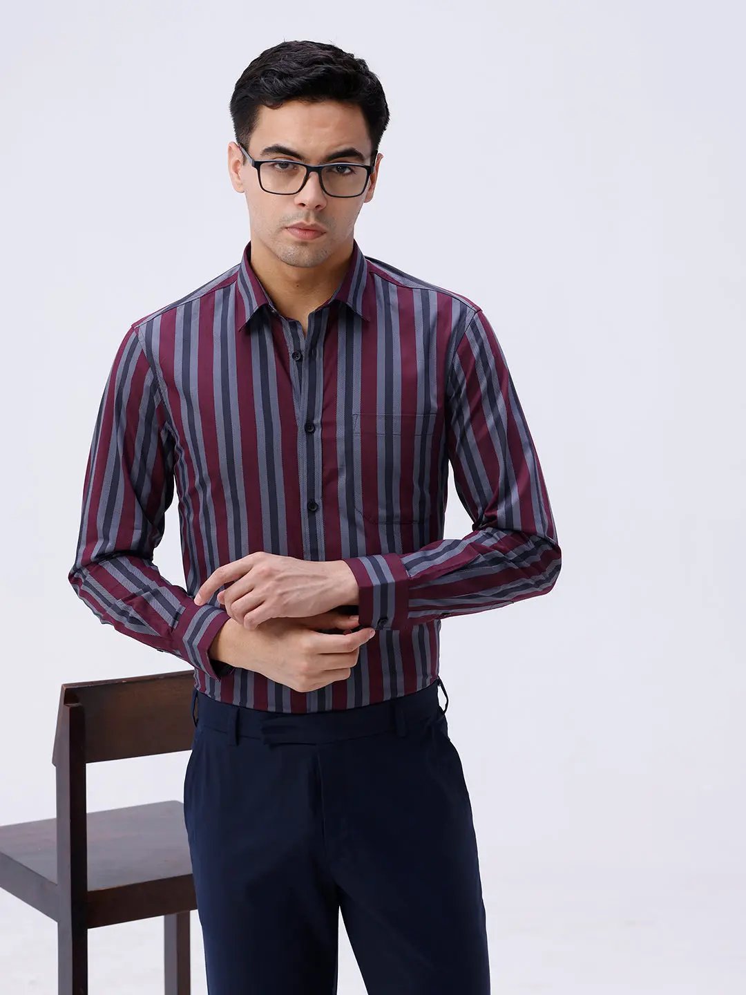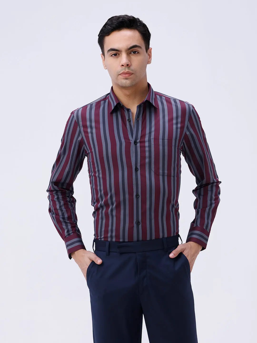 Stylish dobby shirt with maroon and grey stripes, perfect for versatile casual wear.