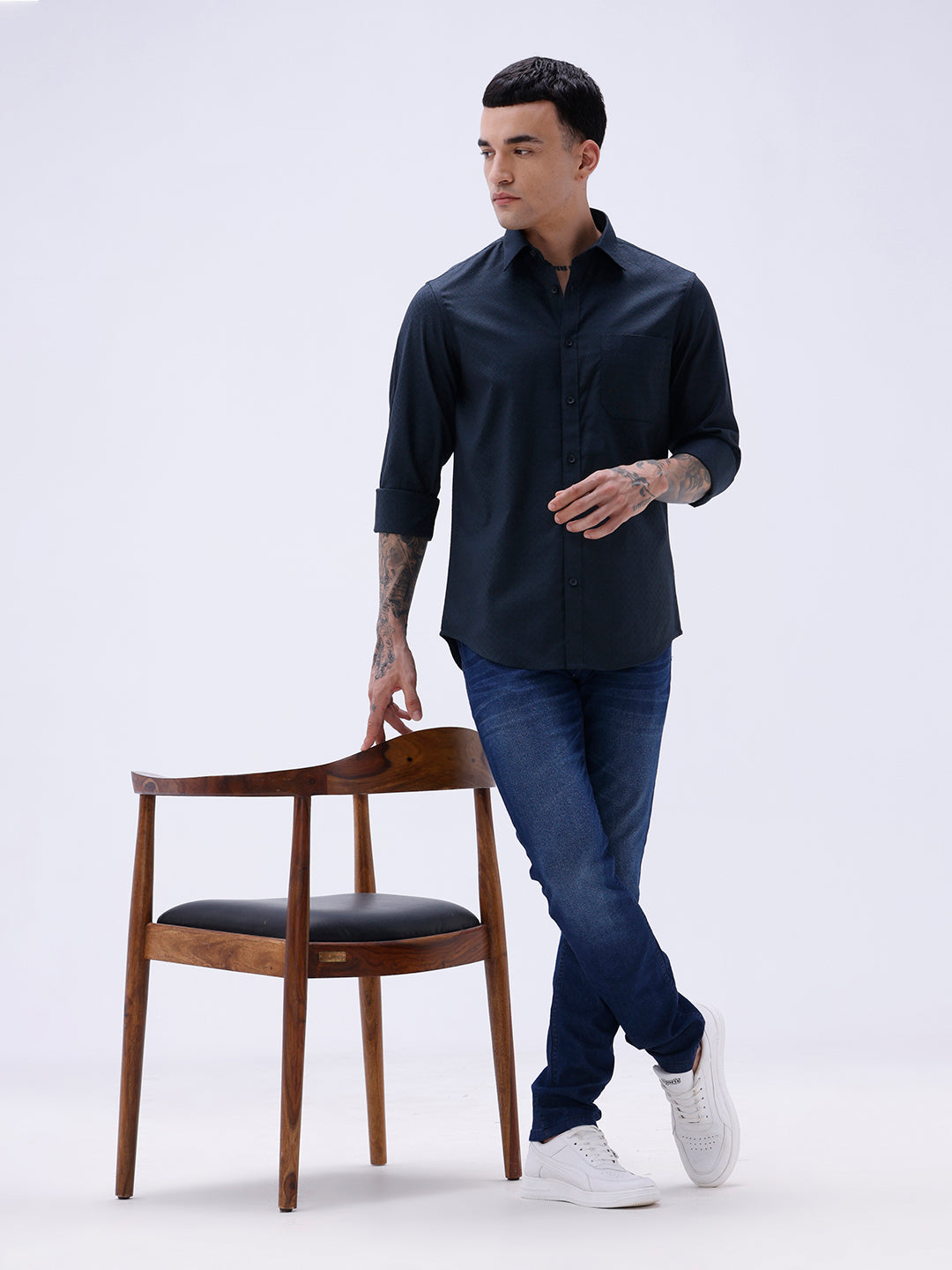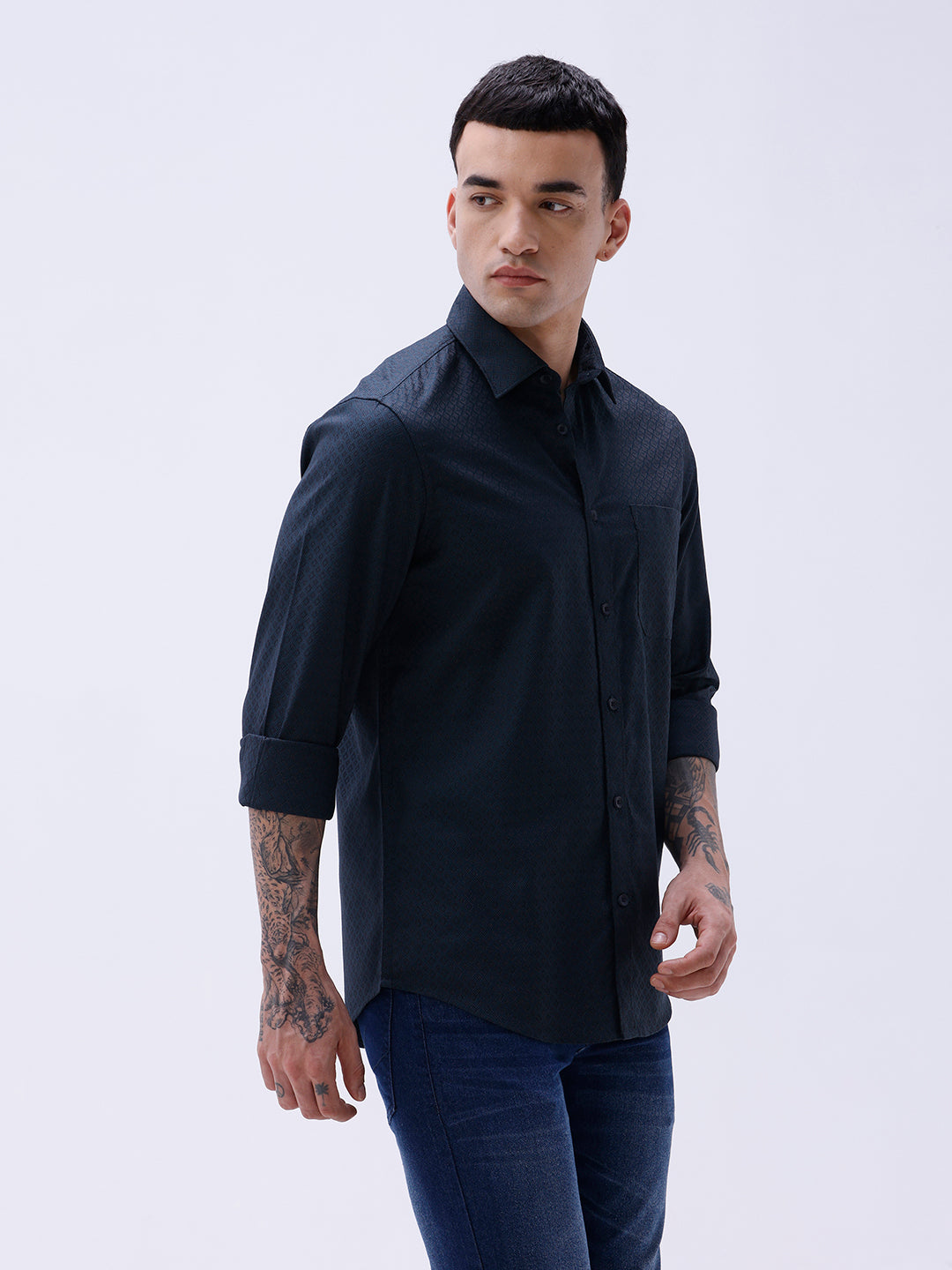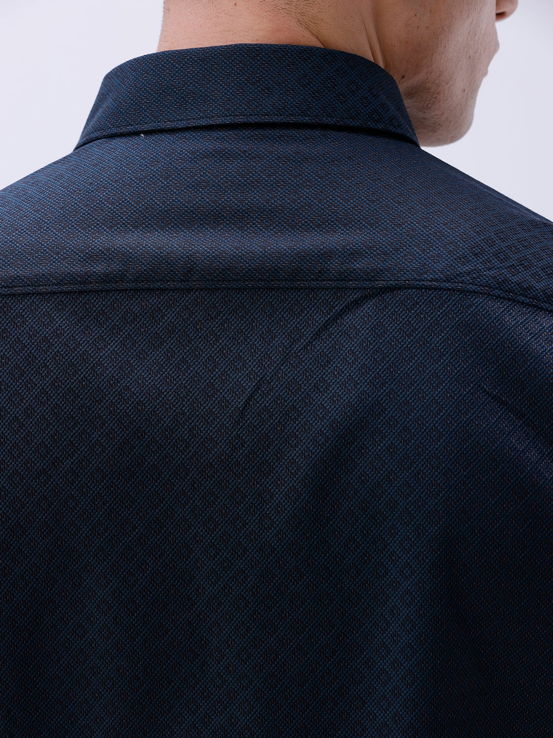 Sophisticated dobby fabric shirt combining blue and black for a sleek, modern style.