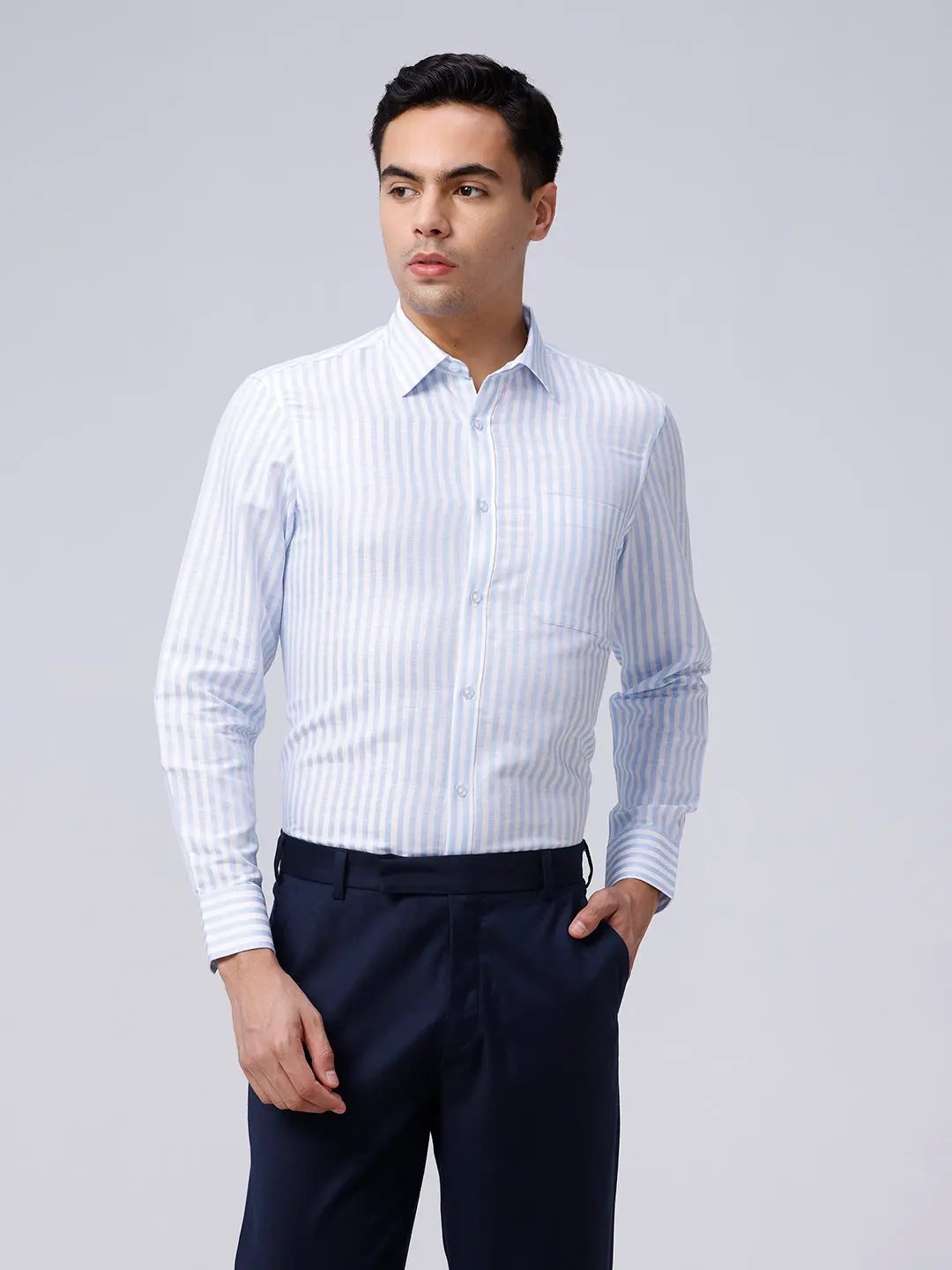 Stylish twill fabric shirt with white and blue stripes for a fresh, modern look.