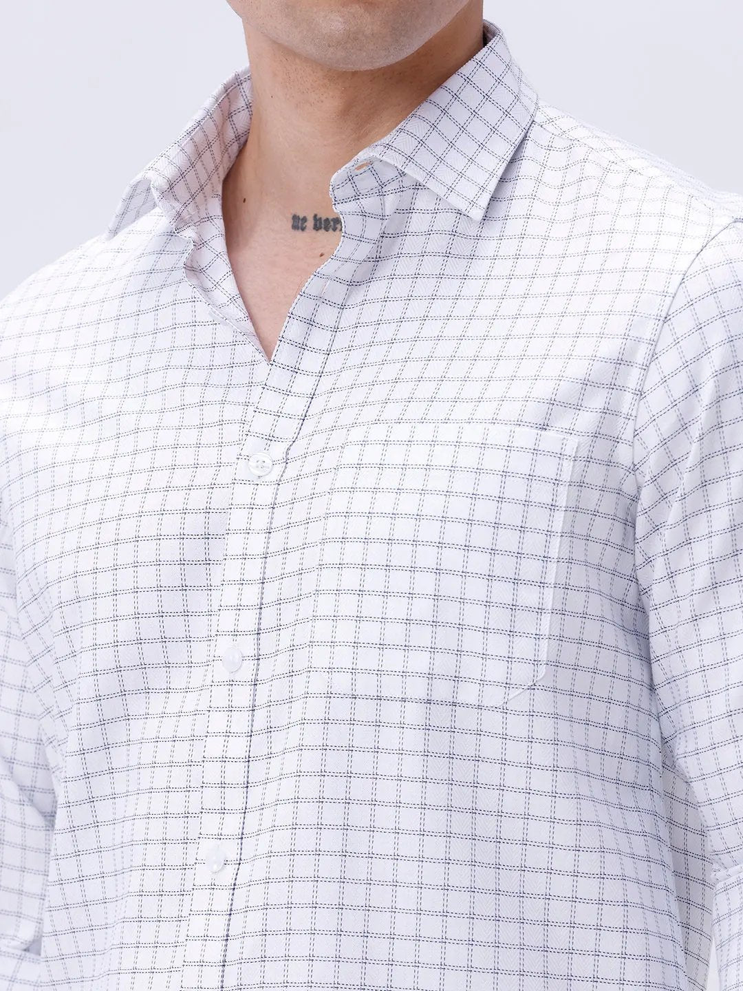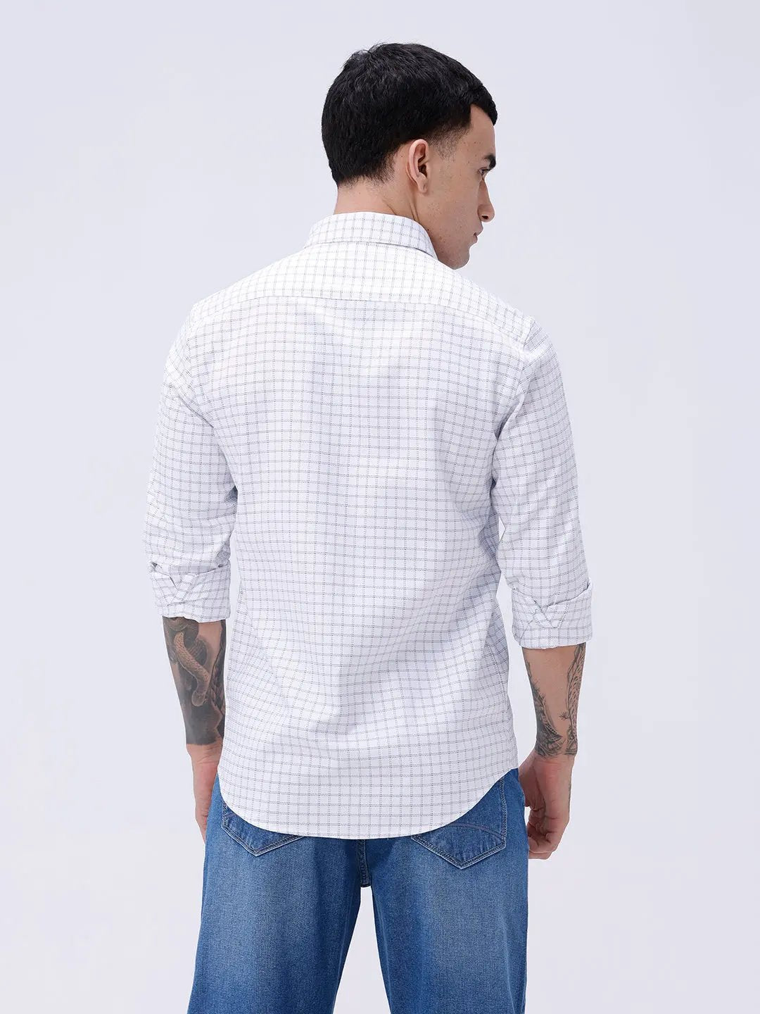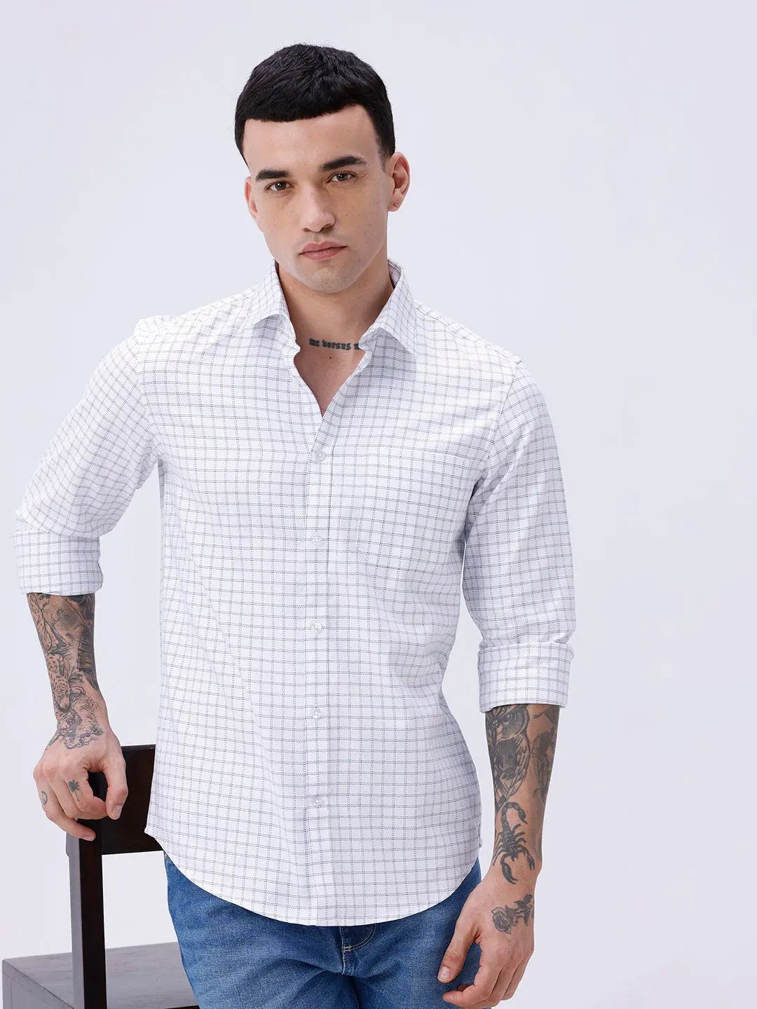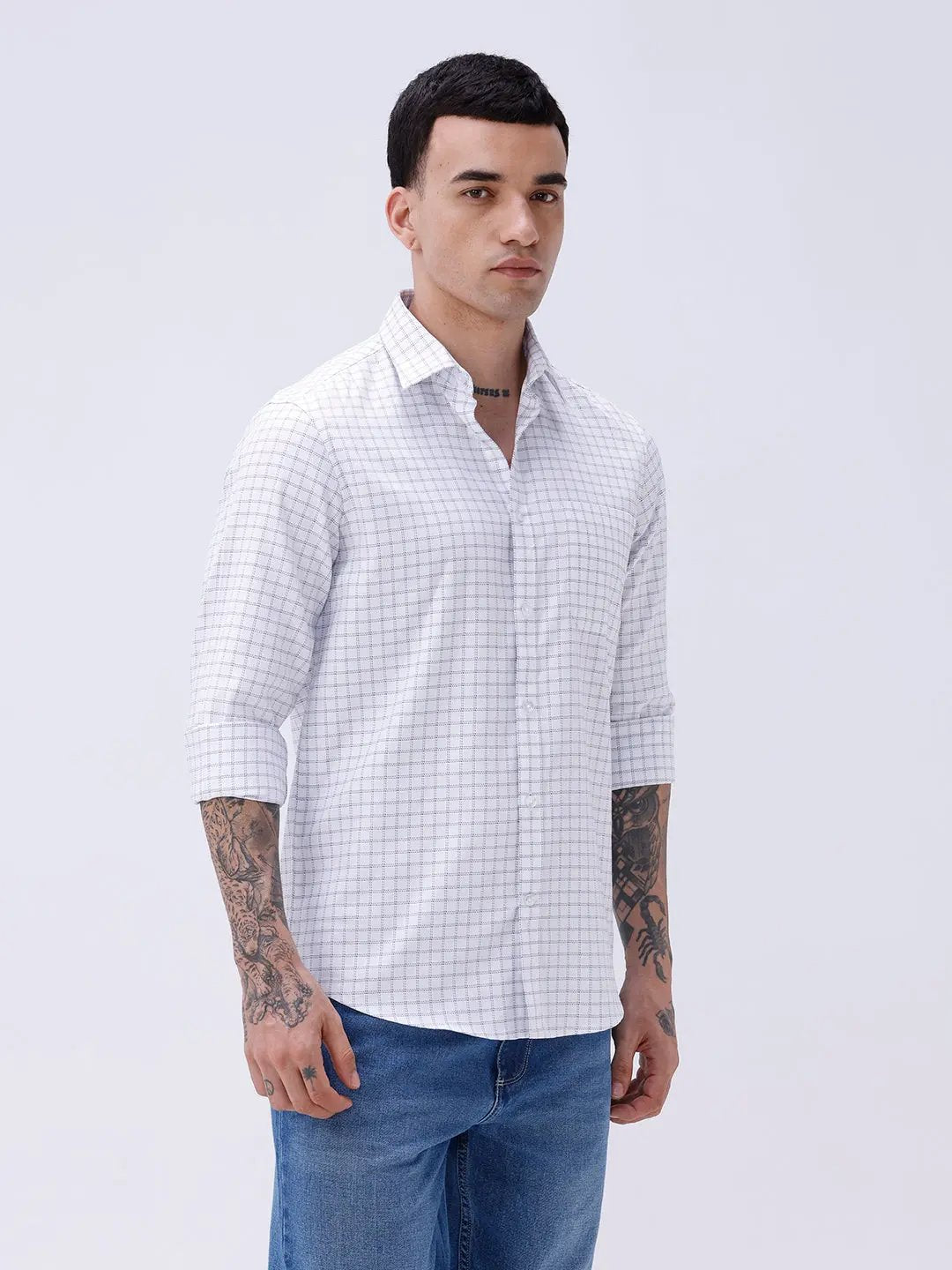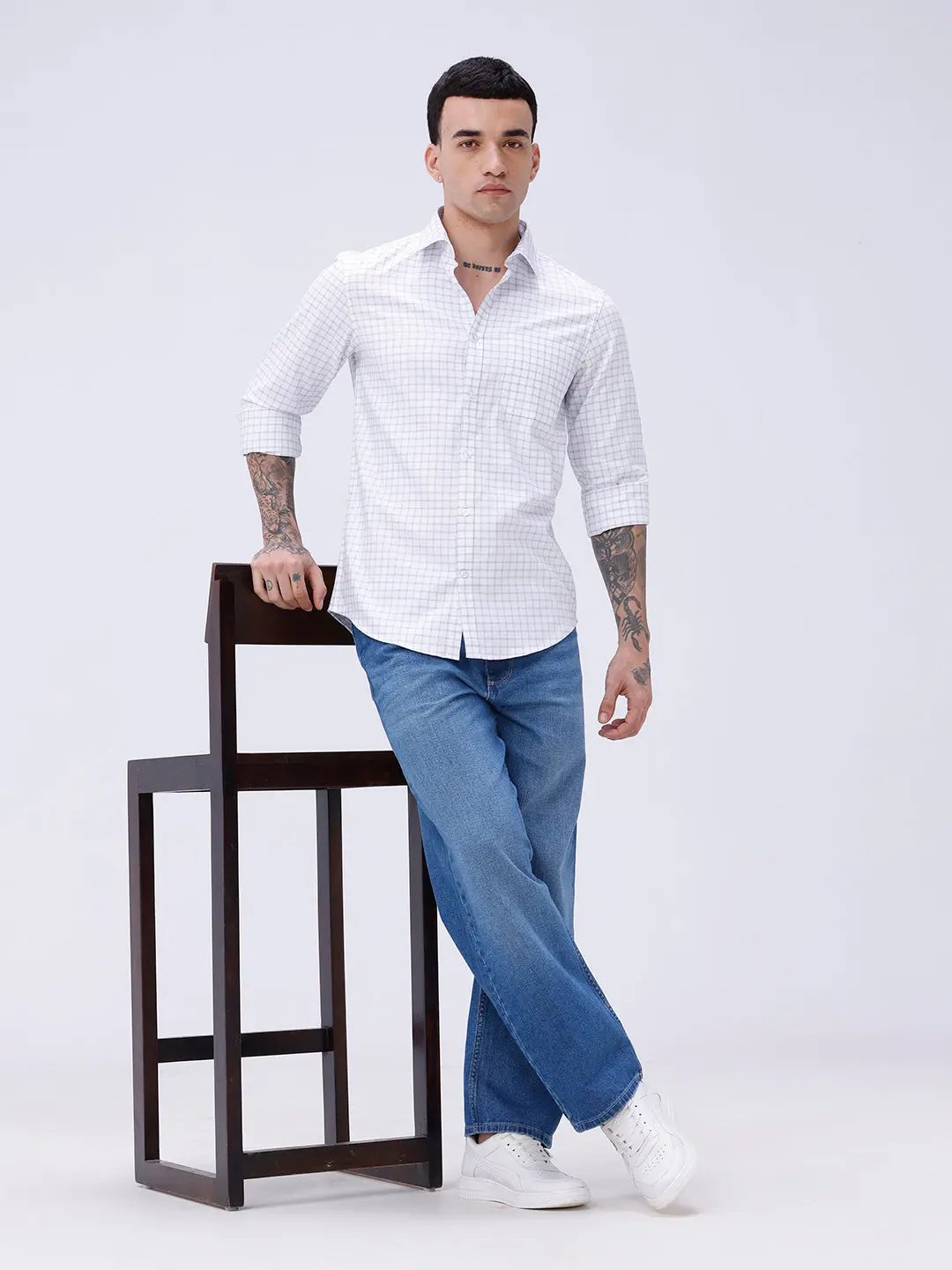 Crisp white checks on sturdy twill fabric, adaptable for various casual and semi-formal looks.