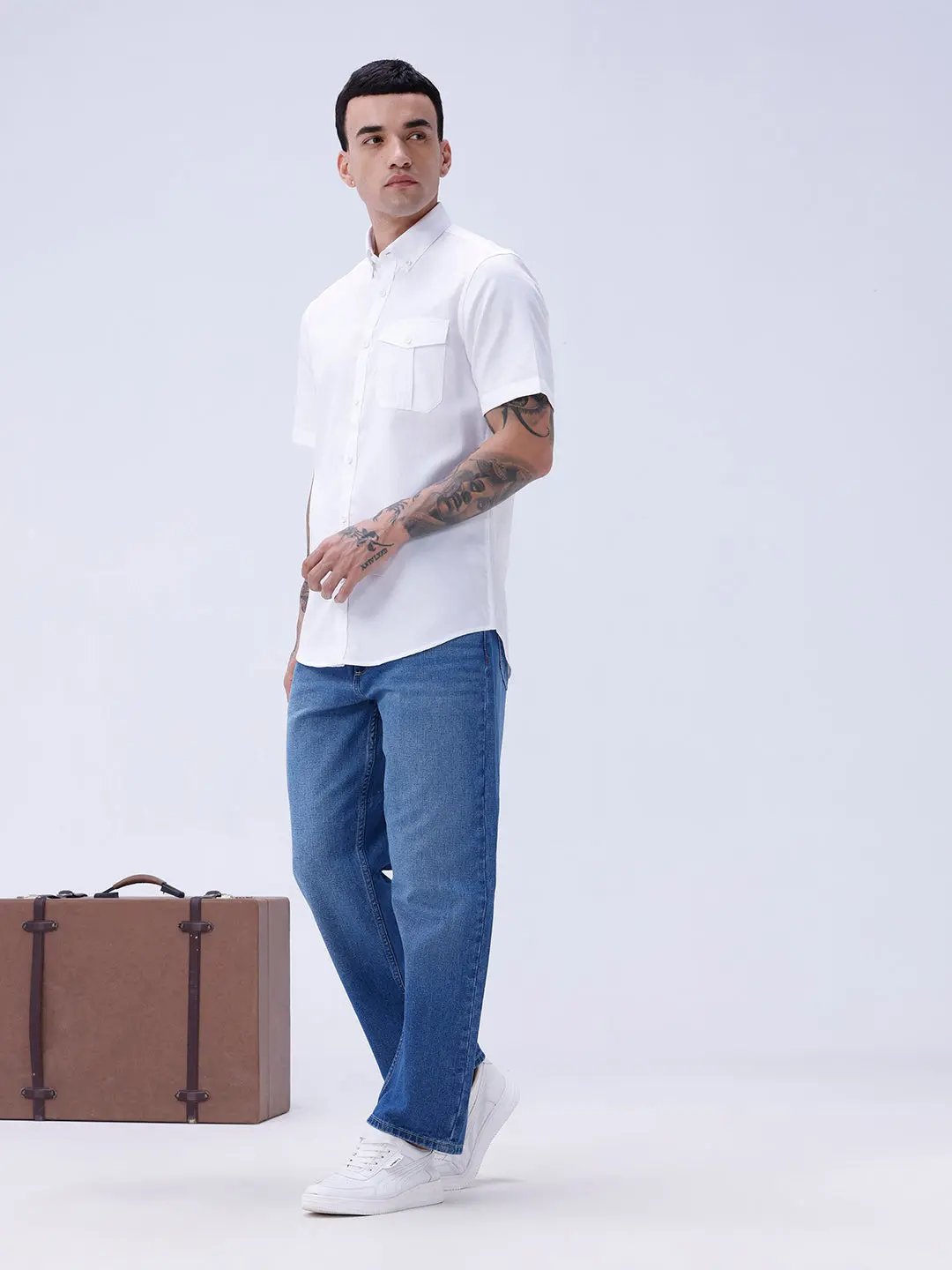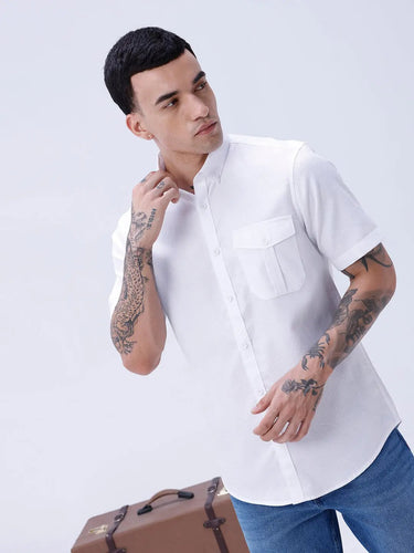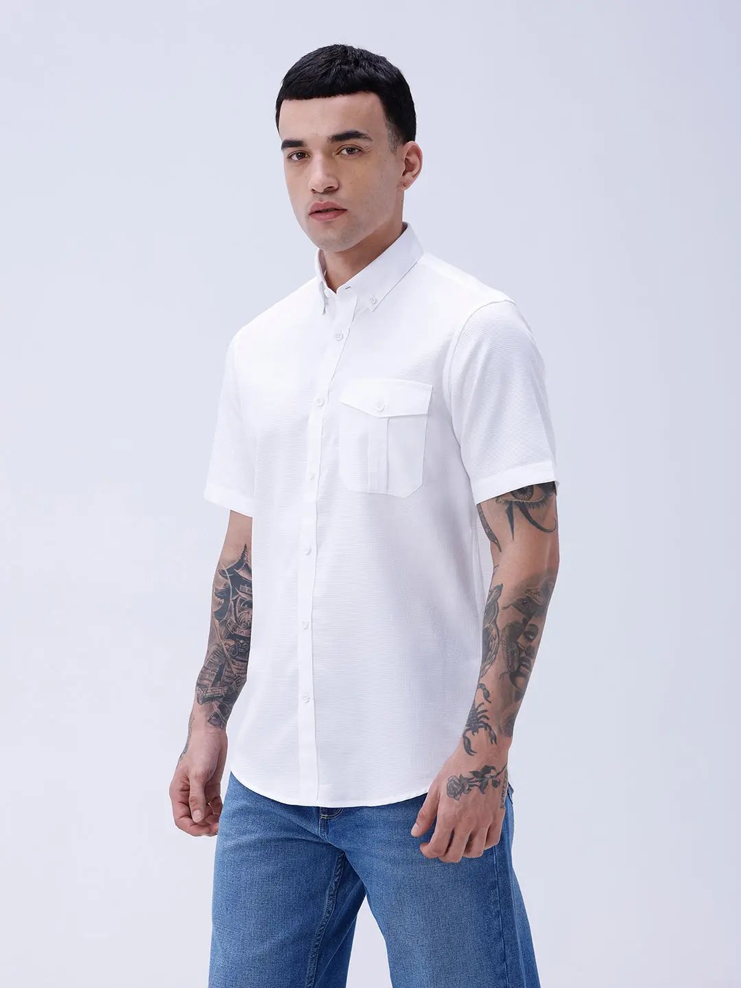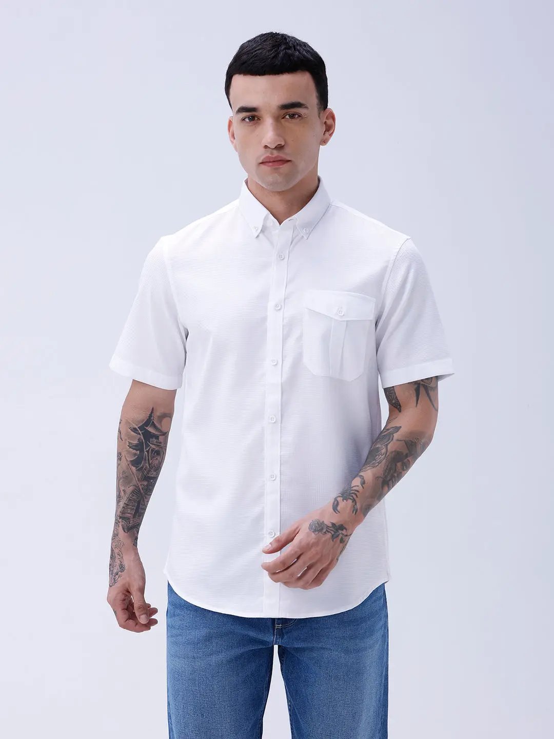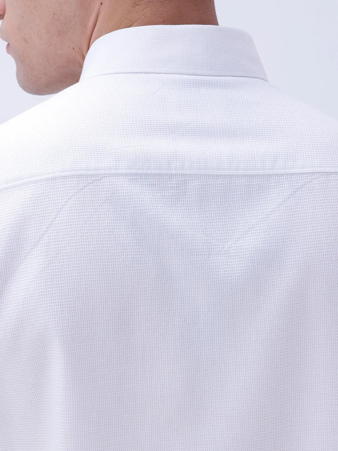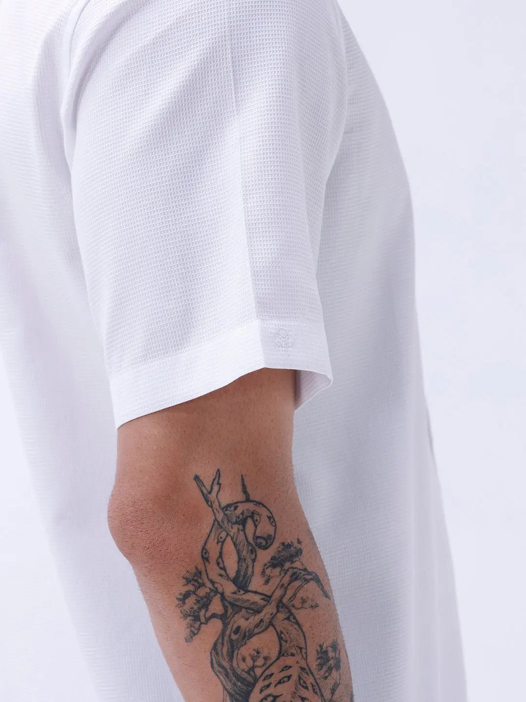 Classic white waffle-dobby fabric shirt, clean and versatile for daily casuals.