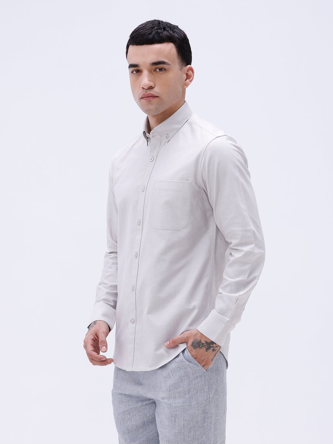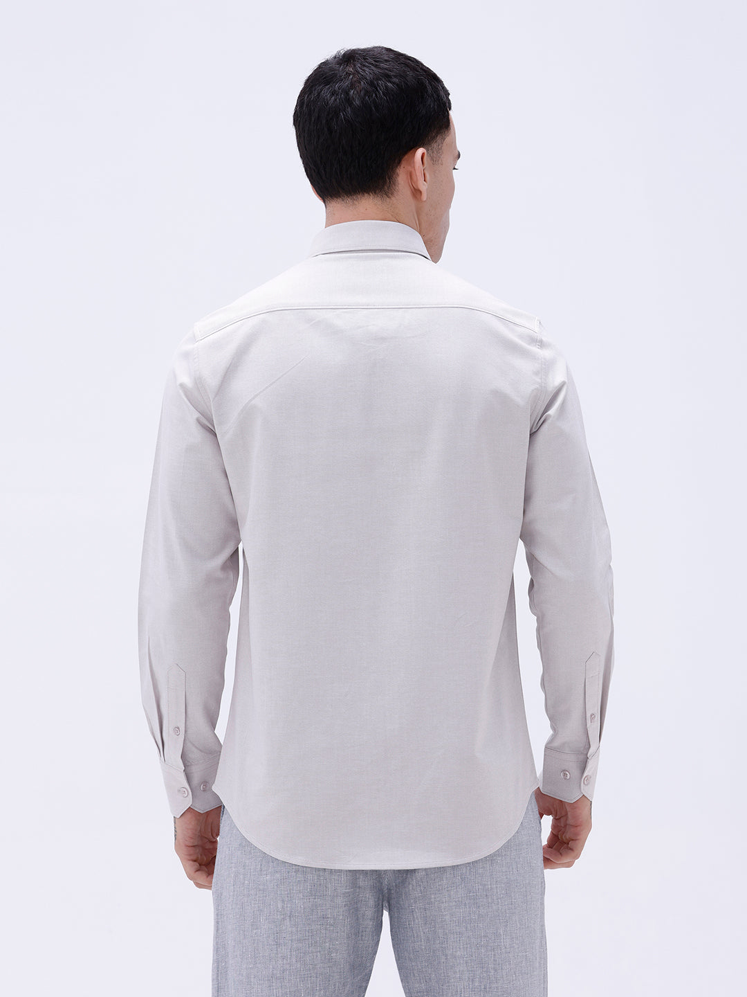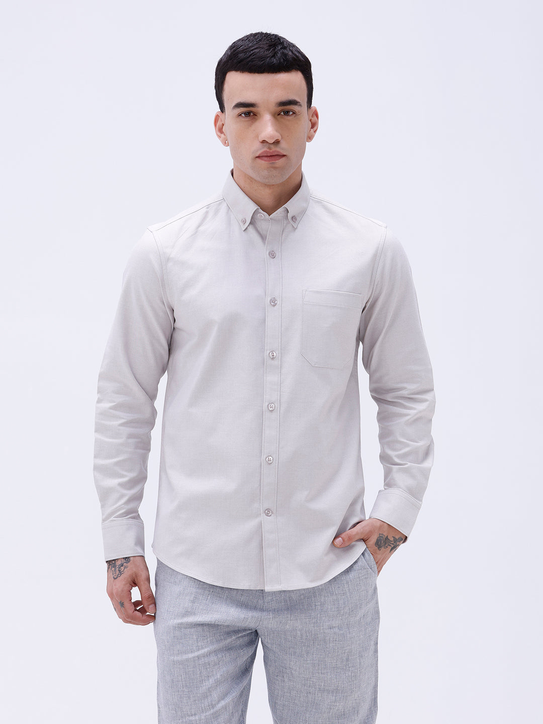 The Beige Oxford Plain Shirt features a classic design with a smooth, durable fabric, offering a refined look for both casual and semi-formal occasions.