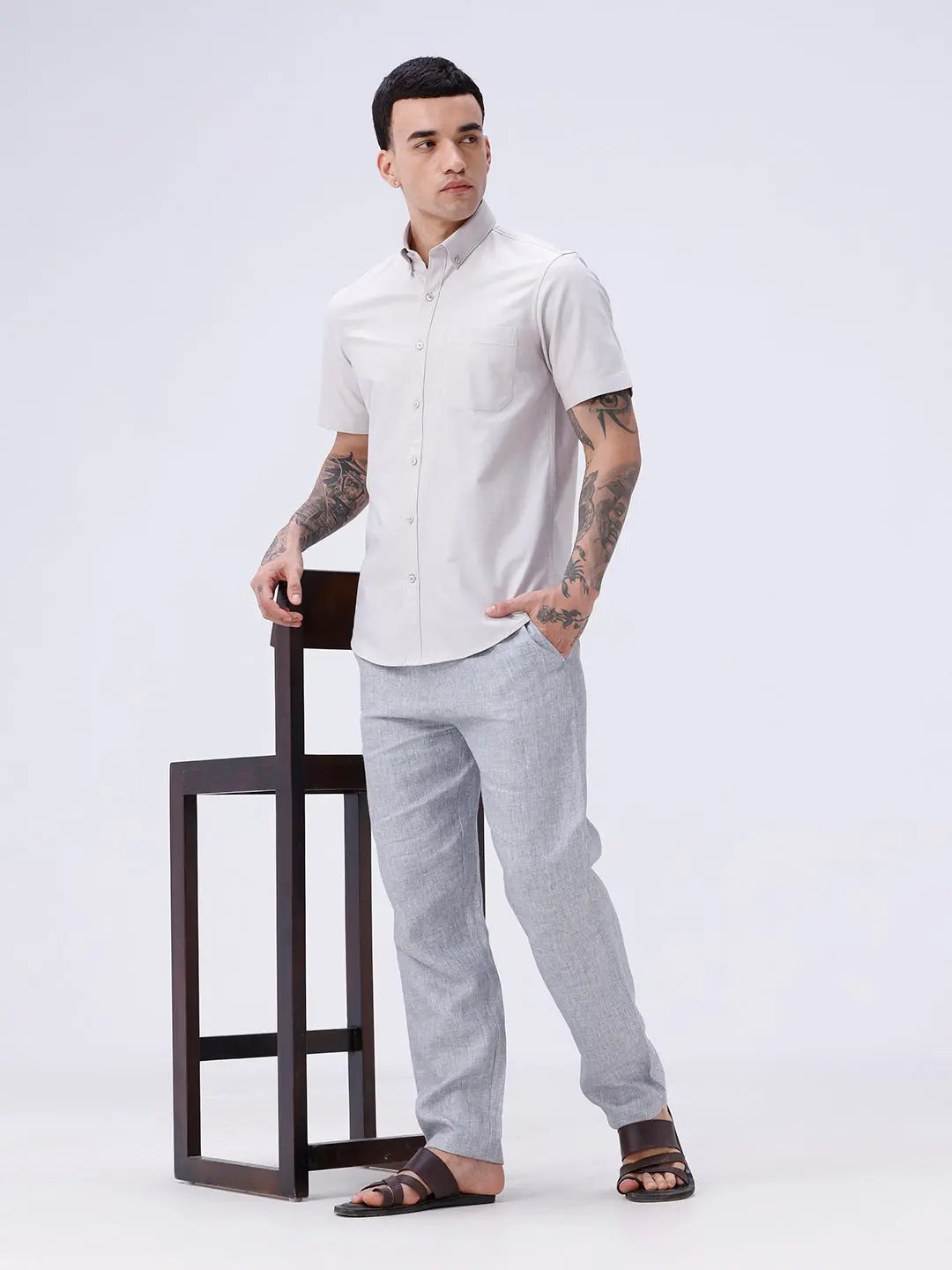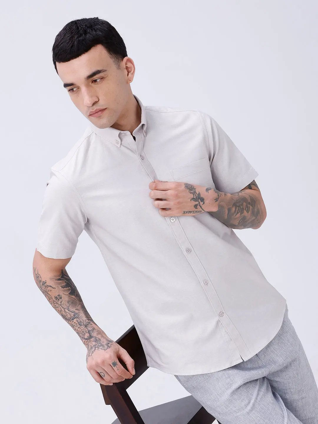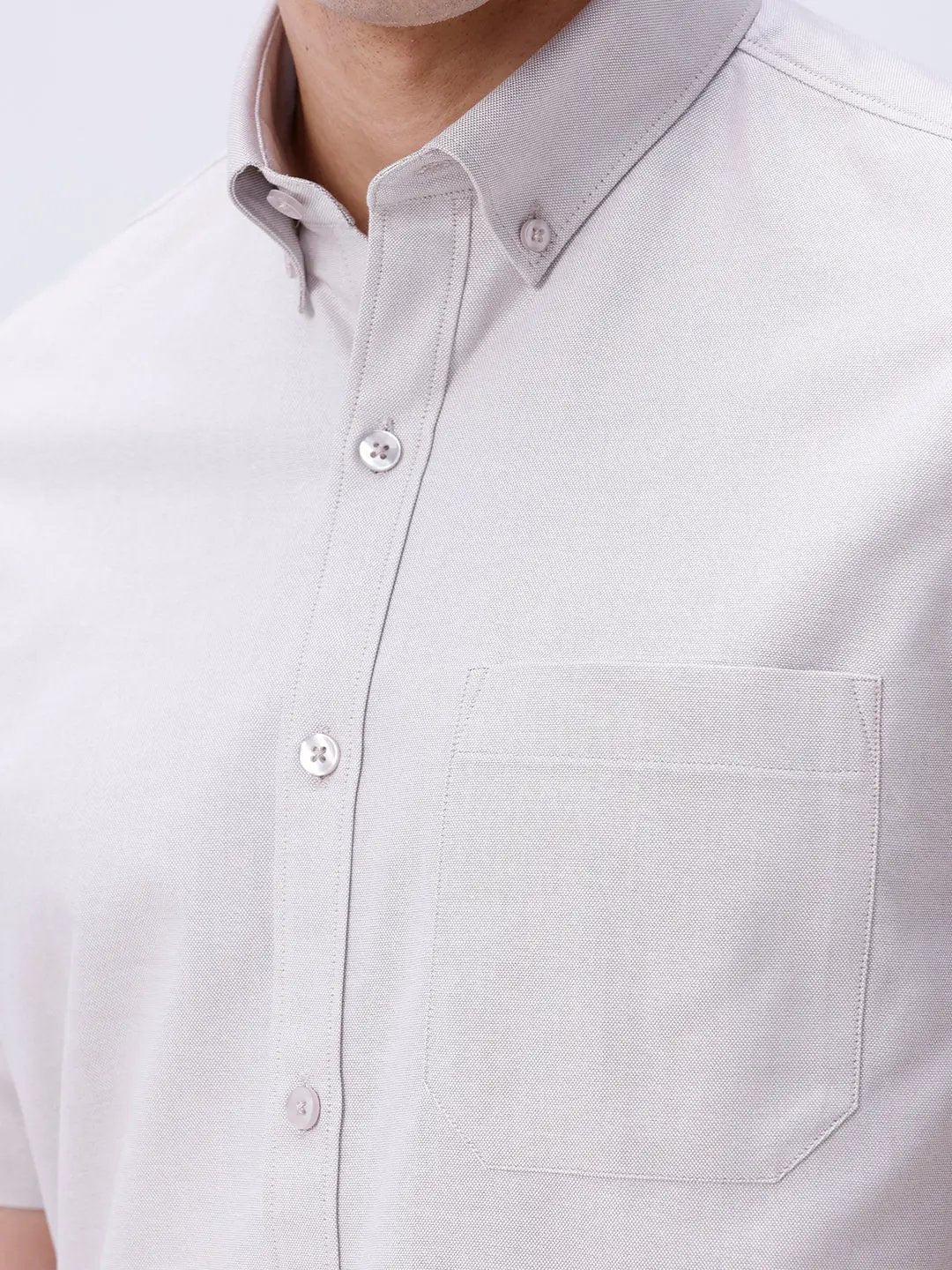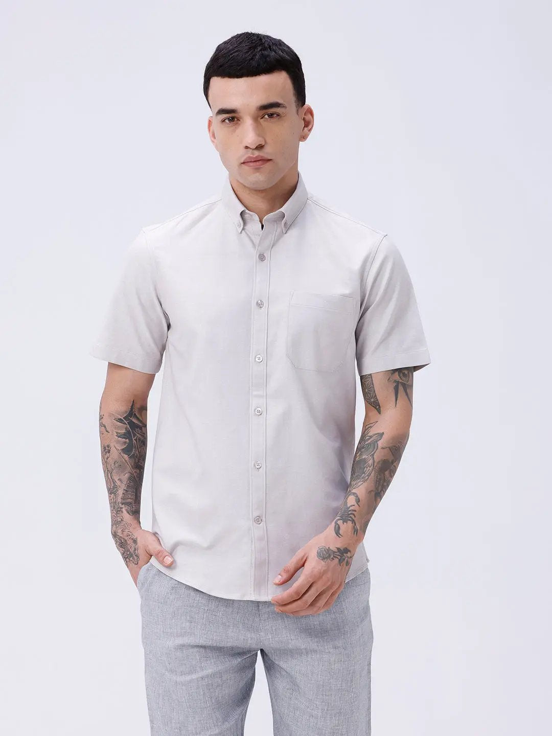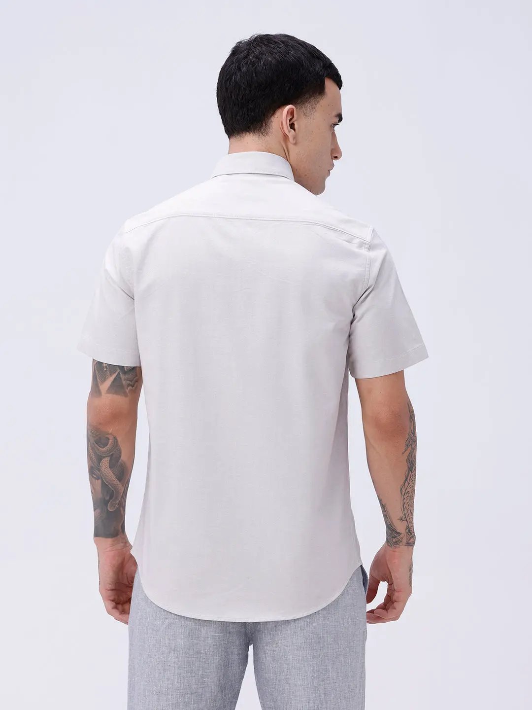 The Beige Oxford Plain Short Sleeve Shirt provides a breezy, comfortable fit with timeless Oxford fabric, perfect for warm weather and casual outings.