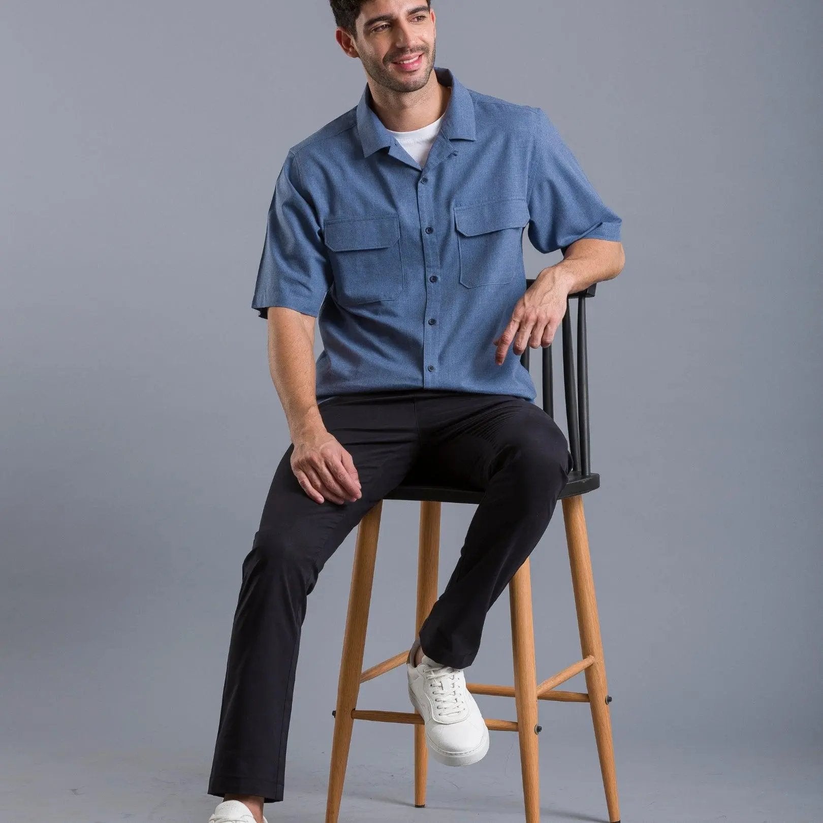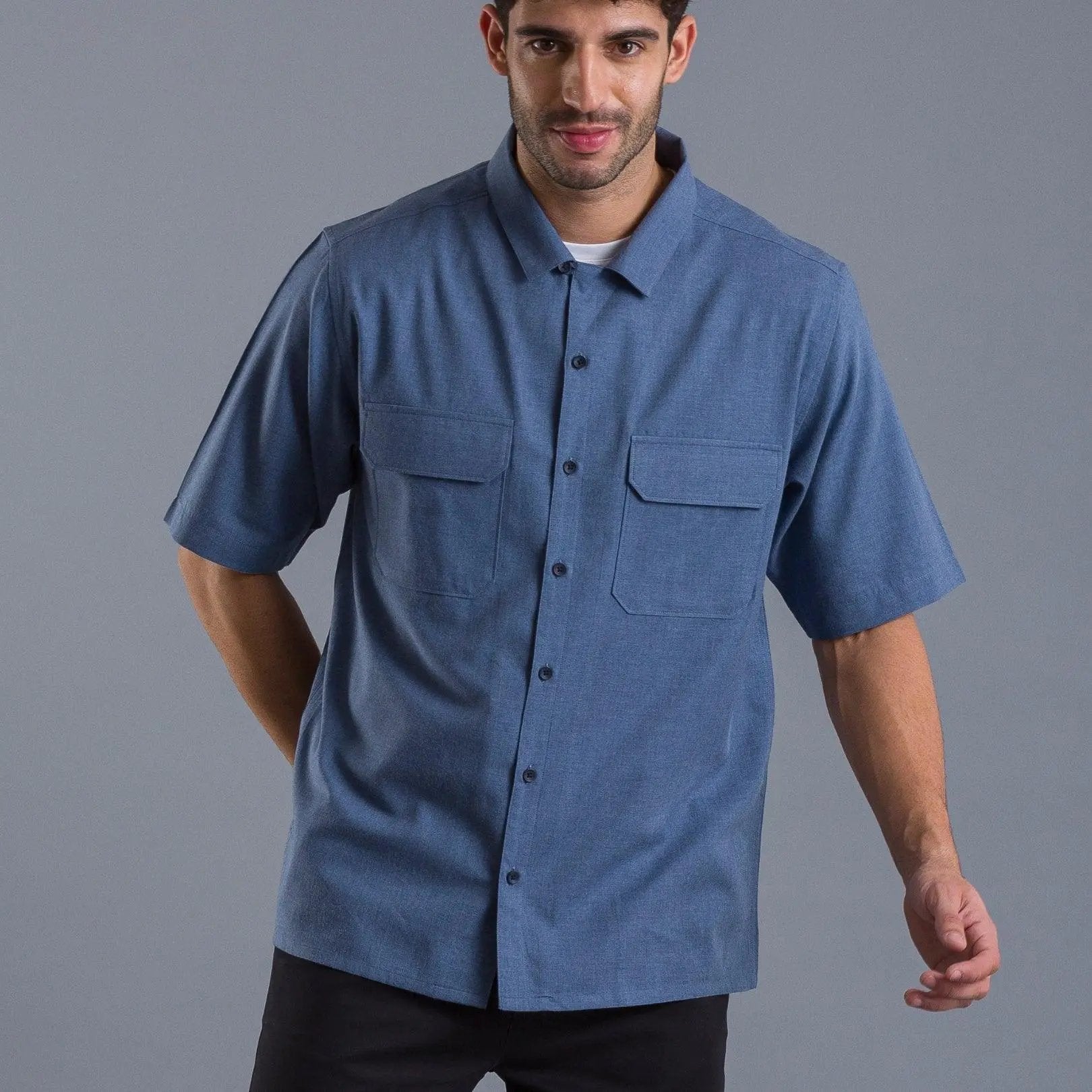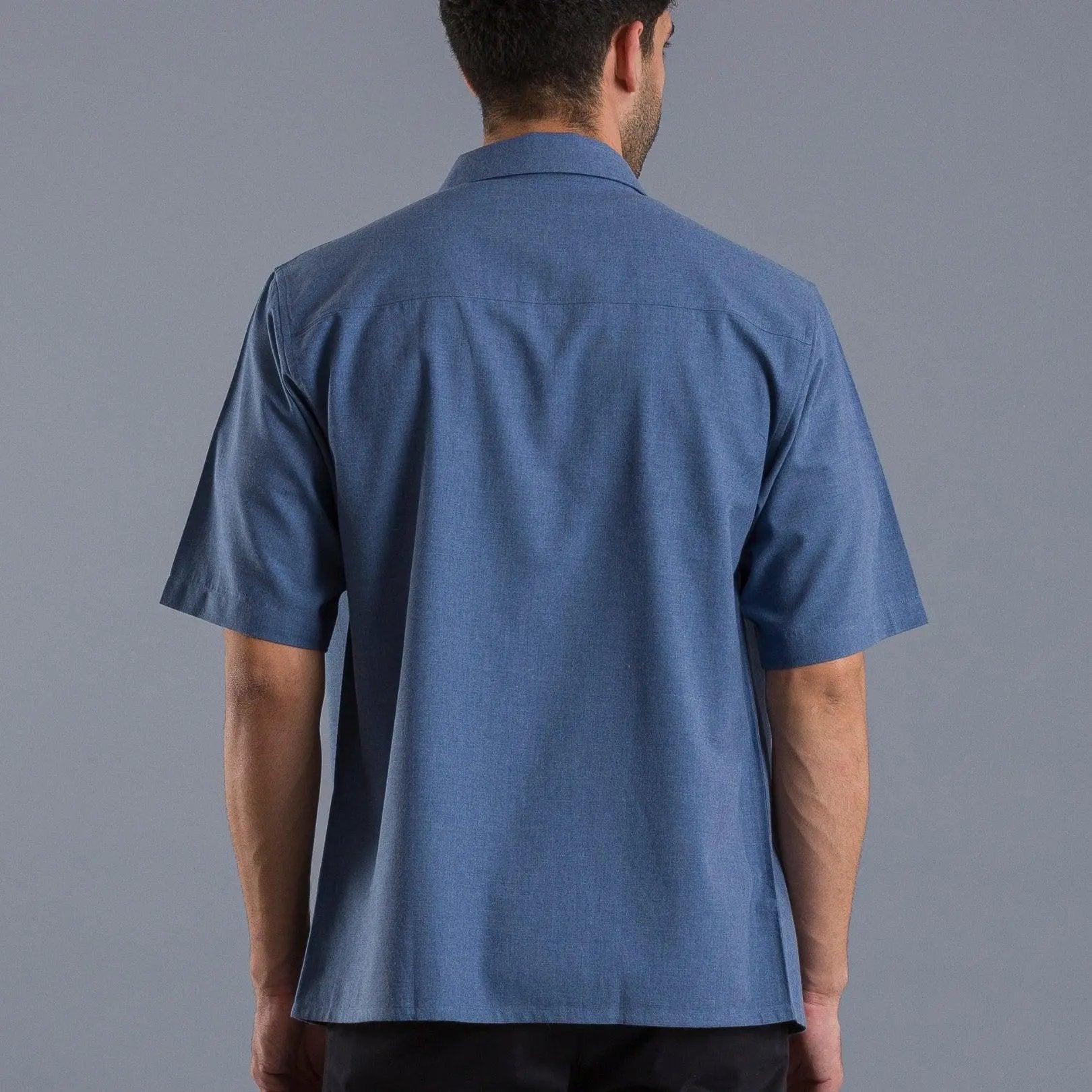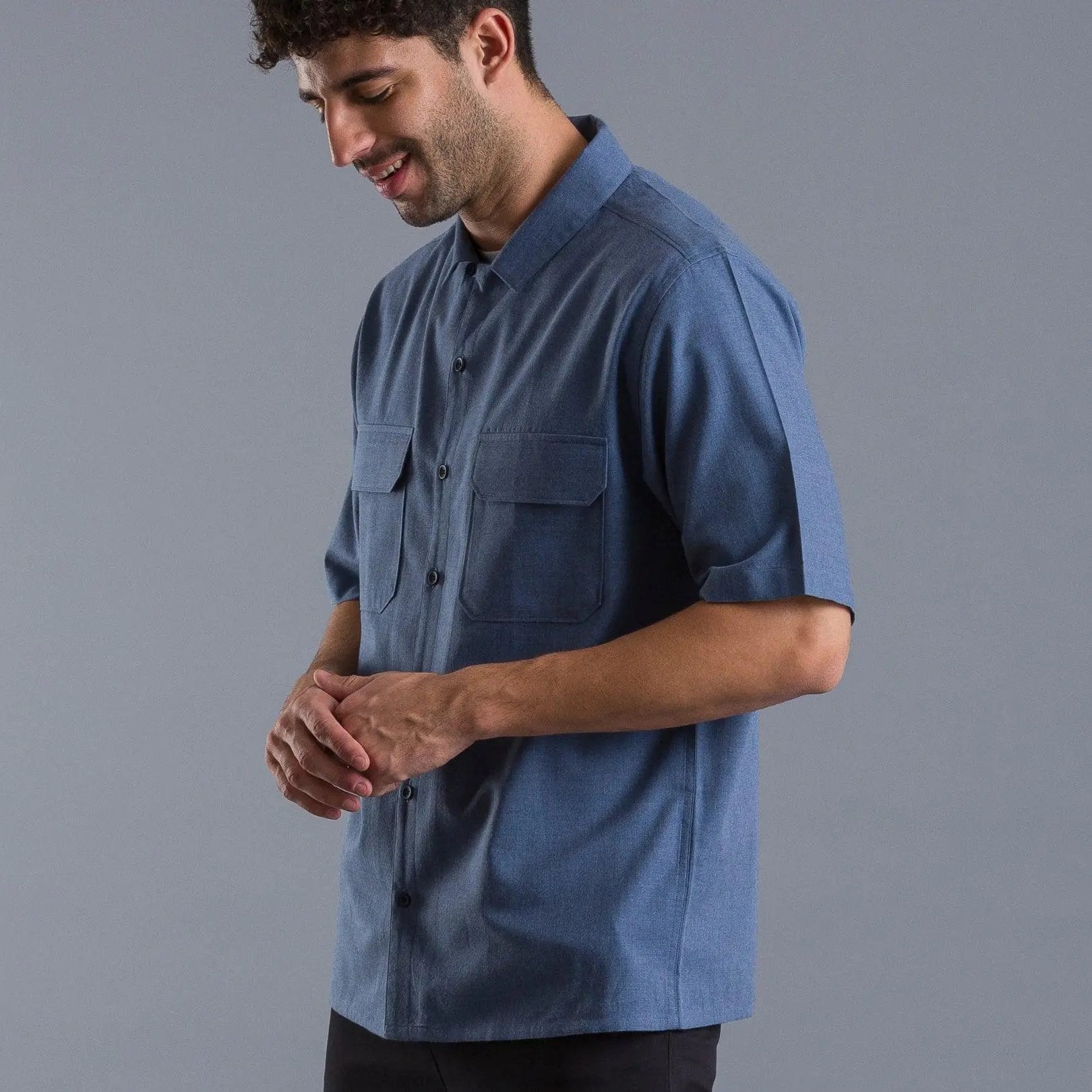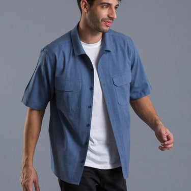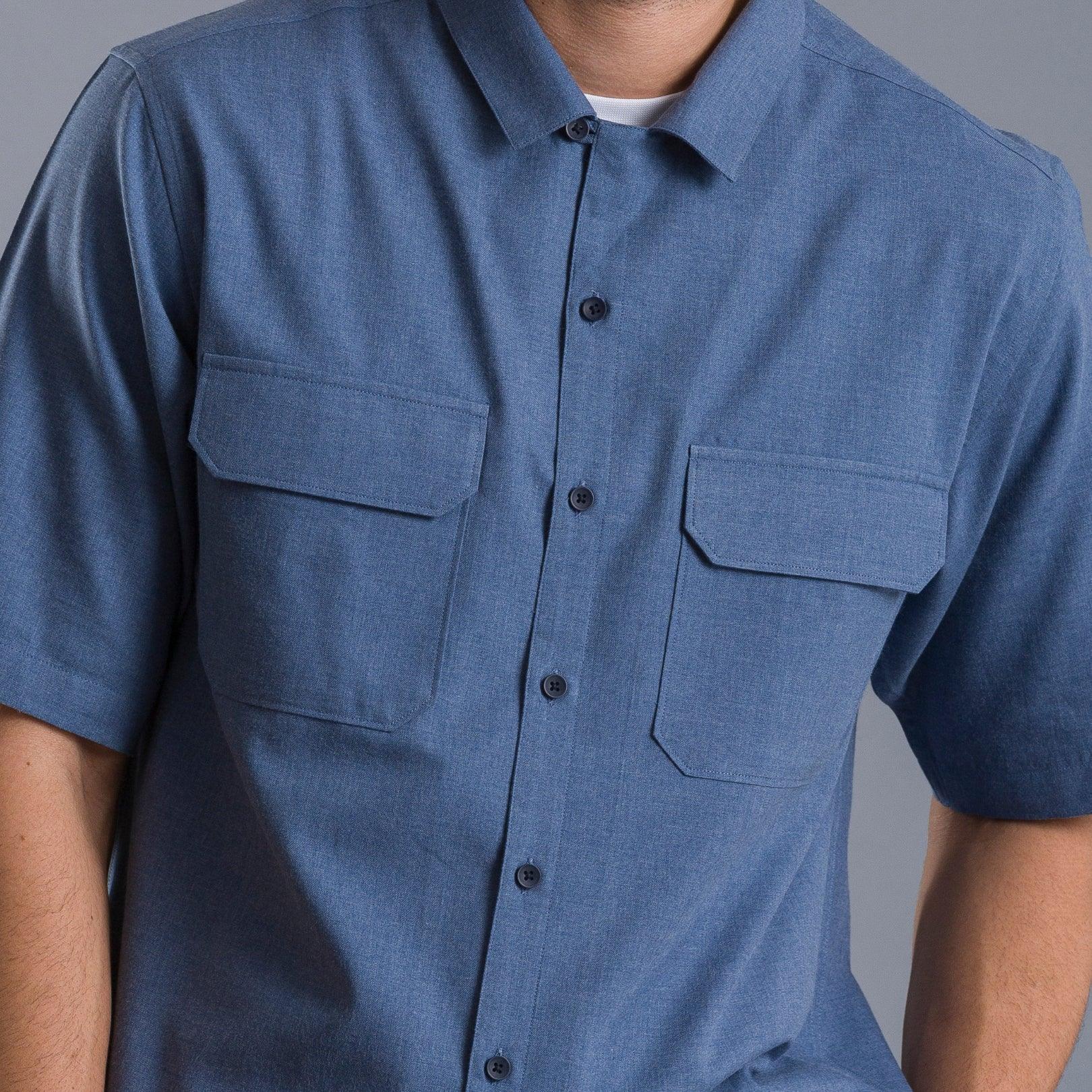 A short sleeve notched collar shirt with a slightly dropped shoulder and elbow length sleeves. The bottom flap of the collar has a single button and loop attached to give you the option of buttoning it up. The shirt has a relaxed boxy fit with two patch pockets with flaps. The hemline is straight.