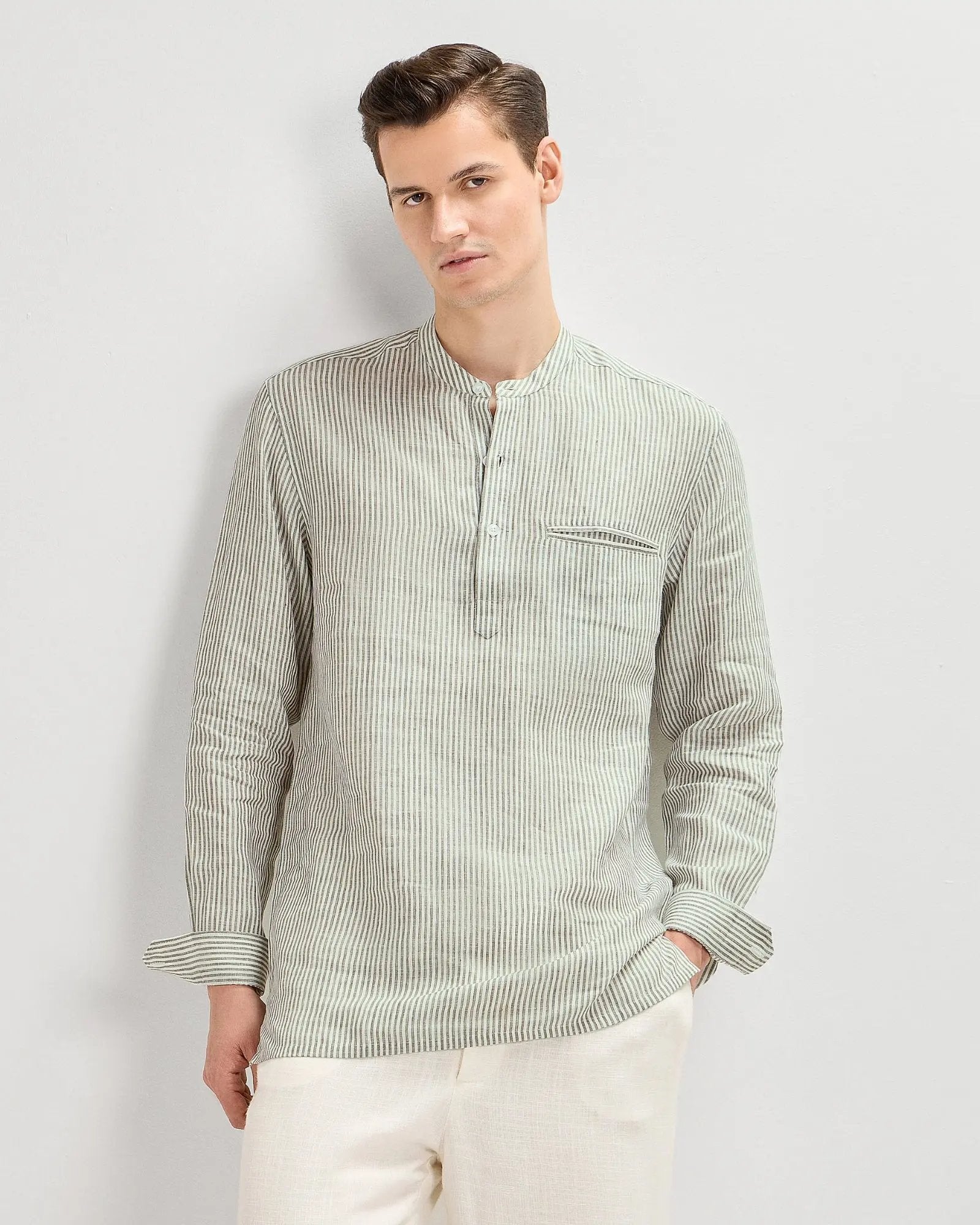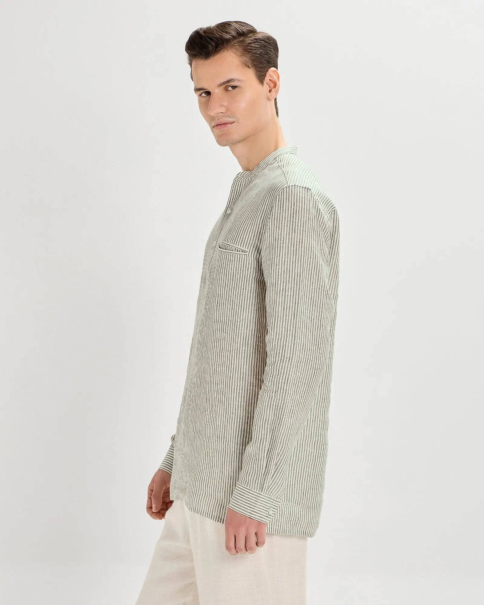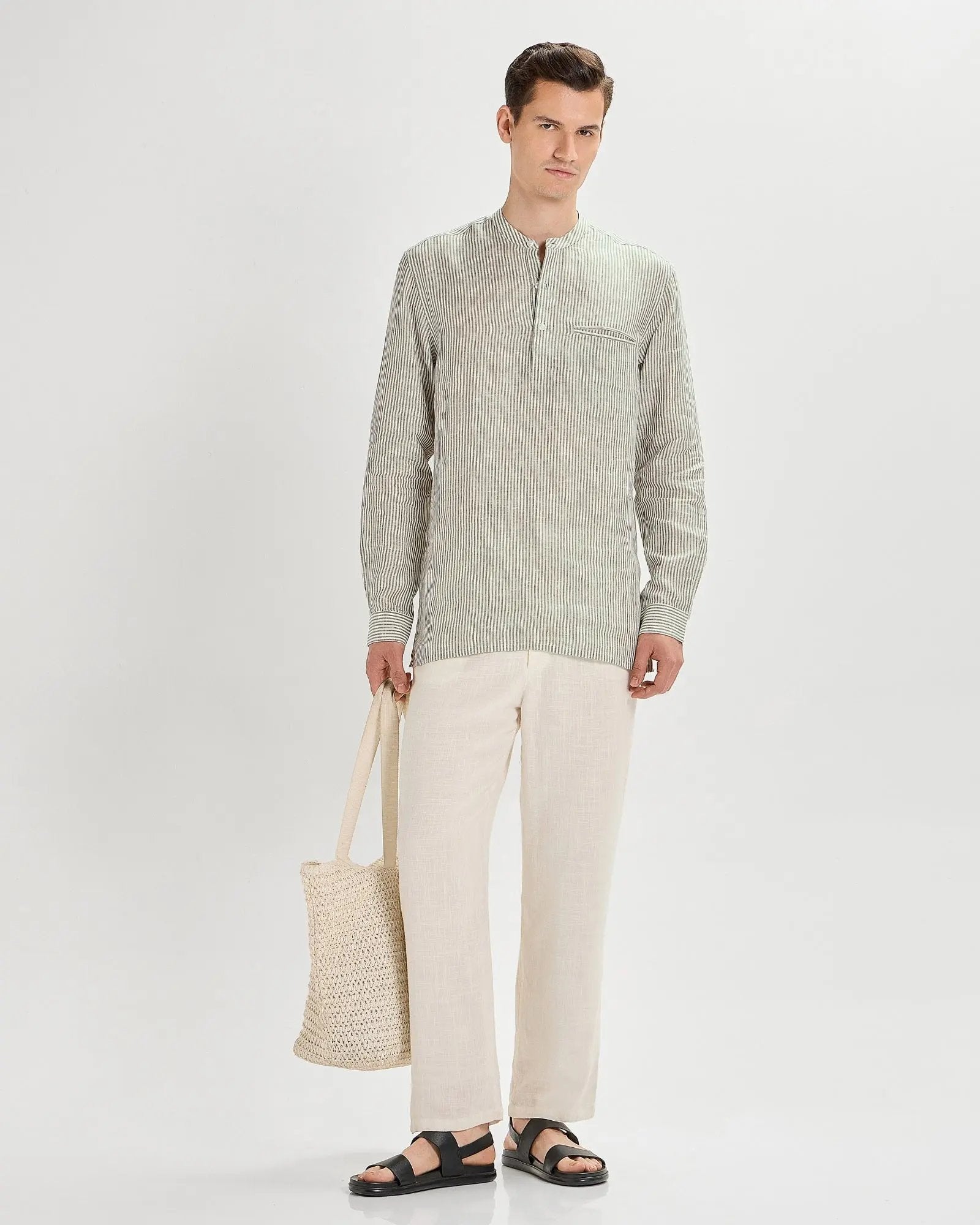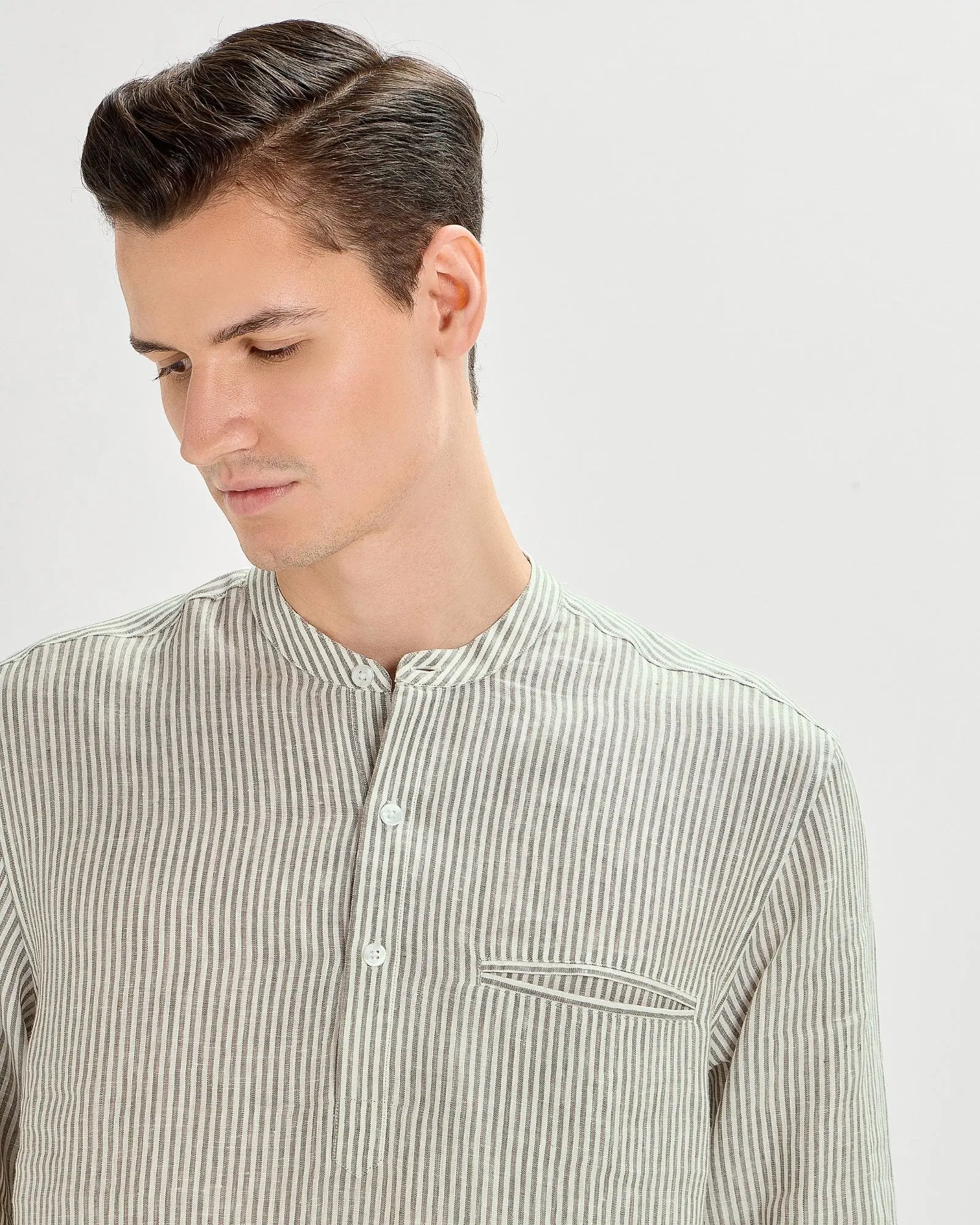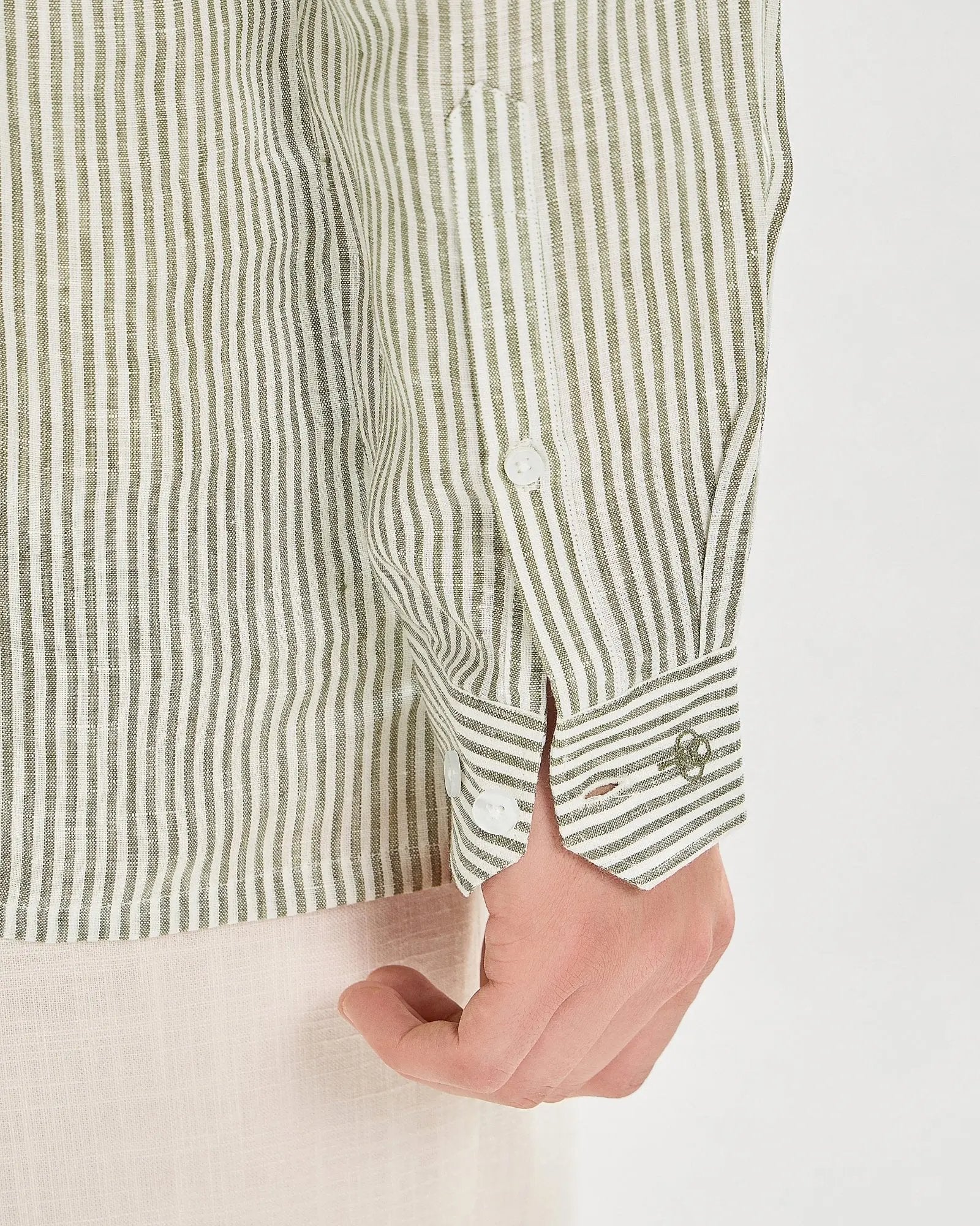 Be effortlessly stylish with our Seagrass Striped Linen Shirt. Perfect for any casual occasion, its breathable fabric keeps you cool and comfortable. Embrace a laid-back vibe with its playful seagrass stripes.